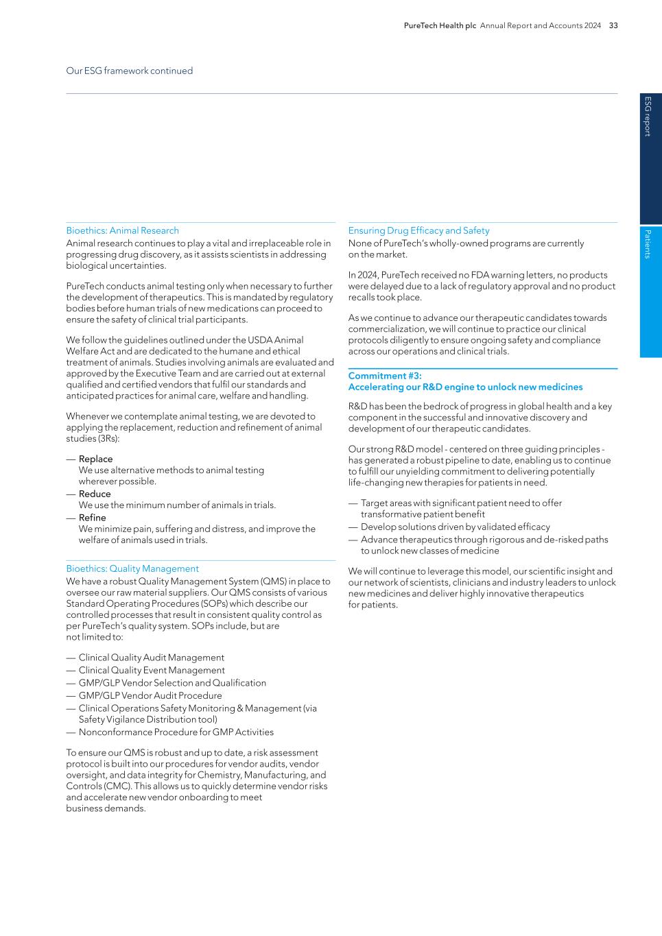 PureTech Health plc Annual Report and Accounts 2024  33 Our ESG framework continued E SG  rep o rt Patients Bioethics: Animal Research Animal research continues to play a vital and irreplaceable role in  progressing drug discovery, as it assists scientists in addressing  biological uncertainties. PureTech conducts animal testing only when necessary to further  the development of therapeutics. This is mandated by regulatory  bodies before human trials of new medications can proceed to  ensure the safety of clinical trial participants. We follow the guidelines outlined under the USDA Animal  Welfare Act and are dedicated to the humane and ethical  treatment of animals. Studies involving animals are evaluated and  approved by the Executive Team and are carried out at external  qualified and certified vendors that fulfil our standards and  anticipated practices for animal care, welfare and handling. Whenever we contemplate animal testing, we are devoted to  applying the replacement, reduction and refinement of animal  studies (3Rs):  — Replace  We use alternative methods to animal testing  wherever possible.  — Reduce  We use the minimum number of animals in trials.  — Refine  We minimize pain, suffering and distress, and improve the  welfare of animals used in trials. Bioethics: Quality Management We have a robust Quality Management System (QMS) in place to  oversee our raw material suppliers. Our QMS consists of various  Standard Operating Procedures (SOPs) which describe our  controlled processes that result in consistent quality control as  per PureTech’s quality system. SOPs include, but are  not limited to:  — Clinical Quality Audit Management  — Clinical Quality Event Management  — GMP/GLP Vendor Selection and Qualification  — GMP/GLP Vendor Audit Procedure  — Clinical Operations Safety Monitoring & Management (via  Safety Vigilance Distribution tool)  — Nonconformance Procedure for GMP Activities To ensure our QMS is robust and up to date, a risk assessment  protocol is built into our procedures for vendor audits, vendor  oversight, and data integrity for Chemistry, Manufacturing, and  Controls (CMC). This allows us to quickly determine vendor risks  and accelerate new vendor onboarding to meet  business demands. Ensuring Drug Efficacy and Safety None of PureTech’s wholly-owned programs are currently  on the market. In 2024, PureTech received no FDA warning letters, no products  were delayed due to a lack of regulatory approval and no product  recalls took place. As we continue to advance our therapeutic candidates towards  commercialization, we will continue to practice our clinical  protocols diligently to ensure ongoing safety and compliance  across our operations and clinical trials. Commitment #3:   Accelerating our R&D engine to unlock new medicines R&D has been the bedrock of progress in global health and a key  component in the successful and innovative discovery and  development of our therapeutic candidates.  Our strong R&D model - centered on three guiding principles -  has generated a robust pipeline to date, enabling us to continue  to fulfill our unyielding commitment to delivering potentially  life-changing new therapies for patients in need.   — Target areas with significant patient need to offer  transformative patient benefit  — Develop solutions driven by validated efficacy  — Advance therapeutics through rigorous and de-risked paths  to unlock new classes of medicine We will continue to leverage this model, our scientific insight and  our network of scientists, clinicians and industry leaders to unlock  new medicines and deliver highly innovative therapeutics  for patients.