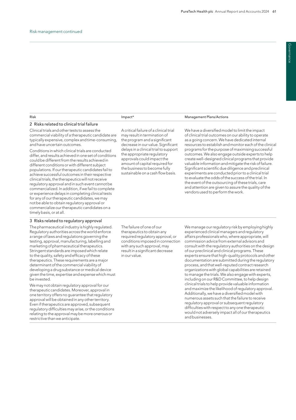 PureTech Health plc Annual Report and Accounts 2024  61 Risk management continued Risk Impact* Management Plans/Actions 2 Risks related to clinical trial failure  Clinical trials and other tests to assess the  commercial viability of a therapeutic candidate are  typically expensive, complex and time-consuming,  and have uncertain outcomes. Conditions in which clinical trials are conducted  differ, and results achieved in one set of conditions  could be different from the results achieved in  different conditions or with different subject  populations. If our therapeutic candidates fail to  achieve successful outcomes in their respective  clinical trials, the therapeutics will not receive  regulatory approval and in such event cannot be  commercialized. In addition, if we fail to complete  or experience delays in completing clinical tests  for any of our therapeutic candidates, we may  not be able to obtain regulatory approval or  commercialize our therapeutic candidates on a  timely basis, or at all.   A critical failure of a clinical trial  may result in termination of  the program and a significant  decrease in our value. Significant  delays in a clinical trial to support  the appropriate regulatory  approvals could impact the  amount of capital required for  the business to become fully  sustainable on a cash flow basis.   We have a diversified model to limit the impact  of clinical trial outcomes on our ability to operate  as a going concern. We have dedicated internal  resources to establish and monitor each of the clinical  programs for the purpose of maximising successful  outcomes. We also engage outside experts to help  create well-designed clinical programs that provide  valuable information and mitigate the risk of failure.  Significant scientific due diligence and preclinical  experiments are conducted prior to a clinical trial  to evaluate the odds of the success of the trial. In  the event of the outsourcing of these trials, care  and attention are given to assure the quality of the  vendors used to perform the work. 3 Risks related to regulatory approval The pharmaceutical industry is highly regulated.  Regulatory authorities across the world enforce  a range of laws and regulations governing the  testing, approval, manufacturing, labelling and  marketing of pharmaceutical therapeutics.  Stringent standards are imposed which relate  to the quality, safety and efficacy of these  therapeutics. These requirements are a major  determinant of the commercial viability of  developing a drug substance or medical device  given the time, expertise and expense which must  be invested.  We may not obtain regulatory approval for our  therapeutic candidates. Moreover, approval in  one territory offers no guarantee that regulatory  approval will be obtained in any other territory.  Even if therapeutics are approved, subsequent  regulatory difficulties may arise, or the conditions  relating to the approval may be more onerous or  restrictive than we anticipate.   The failure of one of our  therapeutics to obtain any  required regulatory approval, or  conditions imposed in connection  with any such approval, may  result in a significant decrease  in our value.   We manage our regulatory risk by employing highly  experienced clinical managers and regulatory  affairs professionals who, where appropriate, will  commission advice from external advisors and  consult with the regulatory authorities on the design  of our preclinical and clinical programs. These  experts ensure that high-quality protocols and other  documentation are submitted during the regulatory  process, and that well-reputed contract research  organizations with global capabilities are retained  to manage the trials. We also engage with experts,  including on our R&D Committee, to help design  clinical trials to help provide valuable information  and maximize the likelihood of regulatory approval.  Additionally, we have a diversified model with  numerous assets such that the failure to receive  regulatory approval or subsequent regulatory  difficulties with respect to any one therapeutic  would not adversely impact all of our therapeutics  and businesses. G overnance