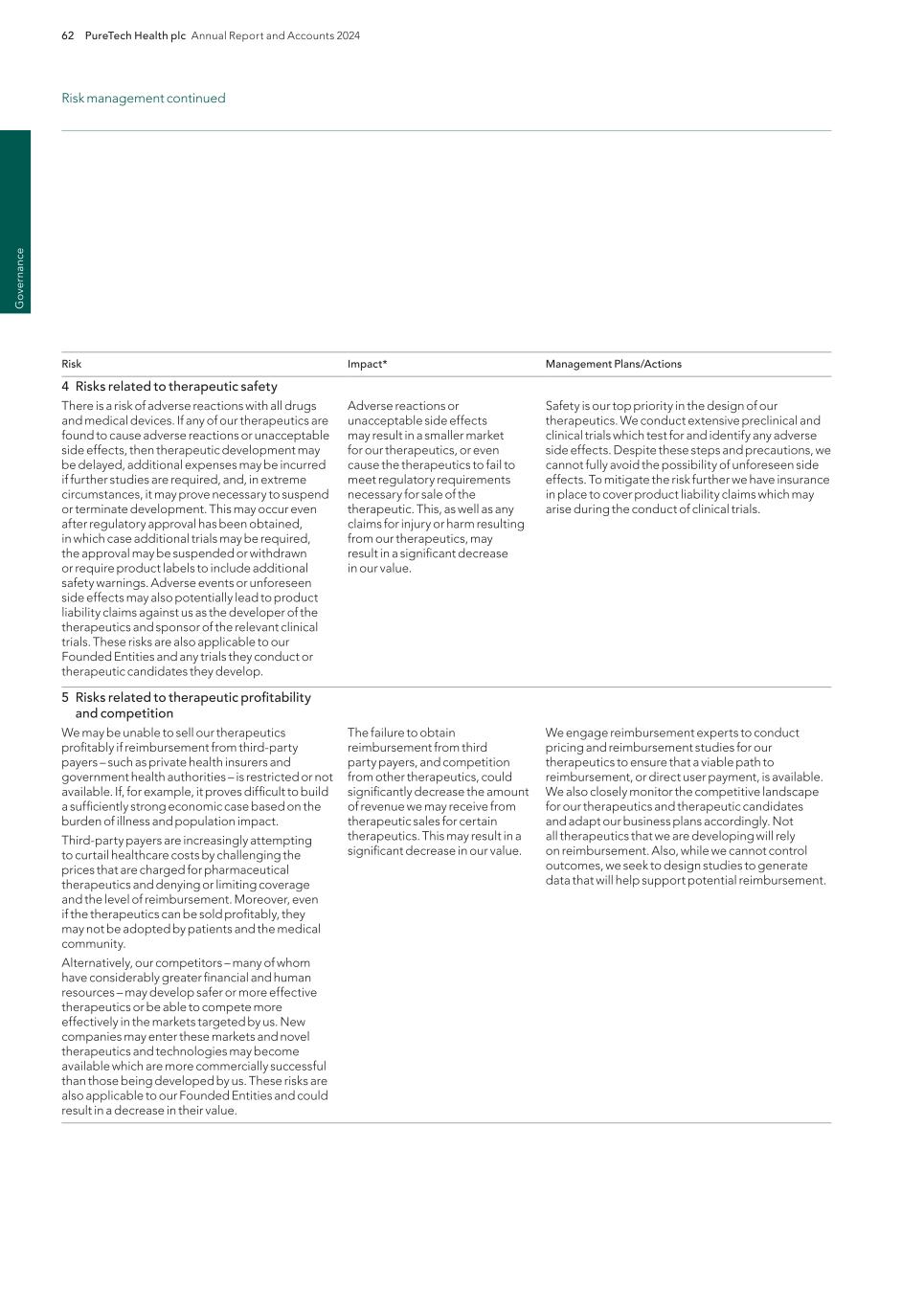 62  PureTech Health plc Annual Report and Accounts 2024 G ov er na nc e Risk management continued Risk Impact* Management Plans/Actions 4 Risks related to therapeutic safety There is a risk of adverse reactions with all drugs  and medical devices. If any of our therapeutics are  found to cause adverse reactions or unacceptable  side effects, then therapeutic development may  be delayed, additional expenses may be incurred  if further studies are required, and, in extreme  circumstances, it may prove necessary to suspend  or terminate development. This may occur even  after regulatory approval has been obtained,  in which case additional trials may be required,  the approval may be suspended or withdrawn  or require product labels to include additional  safety warnings. Adverse events or unforeseen  side effects may also potentially lead to product  liability claims against us as the developer of the  therapeutics and sponsor of the relevant clinical  trials. These risks are also applicable to our  Founded Entities and any trials they conduct or  therapeutic candidates they develop.   Adverse reactions or  unacceptable side effects  may result in a smaller market  for our therapeutics, or even  cause the therapeutics to fail to  meet regulatory requirements  necessary for sale of the  therapeutic. This, as well as any  claims for injury or harm resulting  from our therapeutics, may  result in a significant decrease  in our value.   Safety is our top priority in the design of our  therapeutics. We conduct extensive preclinical and  clinical trials which test for and identify any adverse  side effects. Despite these steps and precautions, we  cannot fully avoid the possibility of unforeseen side  effects. To mitigate the risk further we have insurance  in place to cover product liability claims which may  arise during the conduct of clinical trials. 5  Risks related to therapeutic profitability  and competition We may be unable to sell our therapeutics  profitably if reimbursement from third-party  payers – such as private health insurers and  government health authorities – is restricted or not  available. If, for example, it proves difficult to build  a sufficiently strong economic case based on the  burden of illness and population impact. Third-party payers are increasingly attempting  to curtail healthcare costs by challenging the  prices that are charged for pharmaceutical  therapeutics and denying or limiting coverage  and the level of reimbursement. Moreover, even  if the therapeutics can be sold profitably, they  may not be adopted by patients and the medical  community. Alternatively, our competitors – many of whom  have considerably greater financial and human  resources – may develop safer or more effective  therapeutics or be able to compete more  effectively in the markets targeted by us. New  companies may enter these markets and novel  therapeutics and technologies may become  available which are more commercially successful  than those being developed by us. These risks are  also applicable to our Founded Entities and could  result in a decrease in their value.     The failure to obtain  reimbursement from third  party payers, and competition  from other therapeutics, could  significantly decrease the amount  of revenue we may receive from  therapeutic sales for certain  therapeutics. This may result in a  significant decrease in our value.     We engage reimbursement experts to conduct  pricing and reimbursement studies for our  therapeutics to ensure that a viable path to  reimbursement, or direct user payment, is available.  We also closely monitor the competitive landscape  for our therapeutics and therapeutic candidates  and adapt our business plans accordingly. Not  all therapeutics that we are developing will rely  on reimbursement. Also, while we cannot control  outcomes, we seek to design studies to generate  data that will help support potential reimbursement.