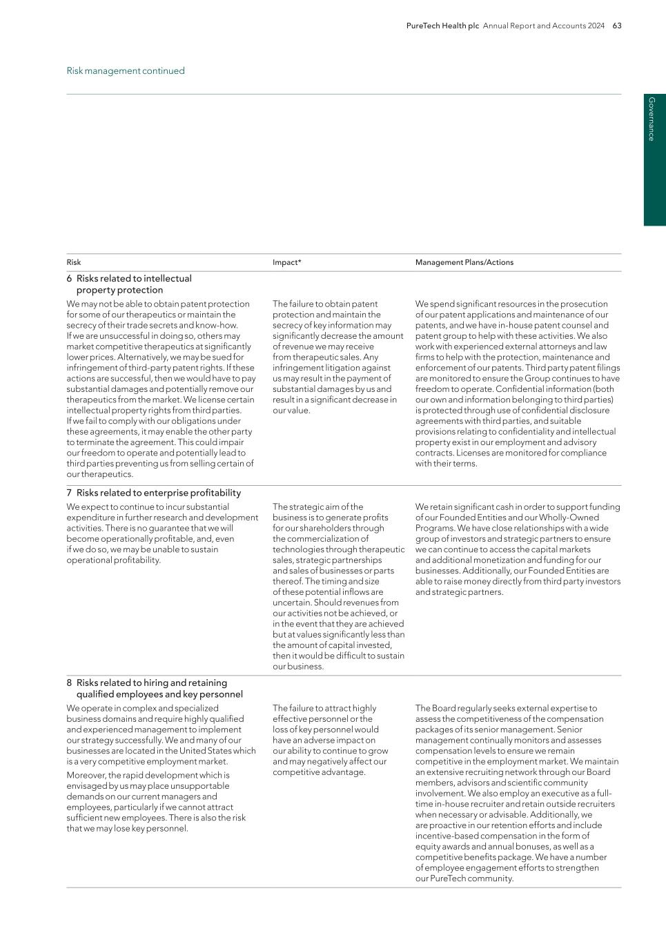 PureTech Health plc Annual Report and Accounts 2024  63 G overnance Risk management continued Risk Impact* Management Plans/Actions 6  Risks related to intellectual  property protection We may not be able to obtain patent protection  for some of our therapeutics or maintain the  secrecy of their trade secrets and know-how.  If we are unsuccessful in doing so, others may  market competitive therapeutics at significantly  lower prices. Alternatively, we may be sued for  infringement of third-party patent rights. If these  actions are successful, then we would have to pay  substantial damages and potentially remove our  therapeutics from the market. We license certain  intellectual property rights from third parties.  If we fail to comply with our obligations under  these agreements, it may enable the other party  to terminate the agreement. This could impair  our freedom to operate and potentially lead to  third parties preventing us from selling certain of  our therapeutics.     The failure to obtain patent  protection and maintain the  secrecy of key information may  significantly decrease the amount  of revenue we may receive  from therapeutic sales. Any  infringement litigation against  us may result in the payment of  substantial damages by us and  result in a significant decrease in  our value.     We spend significant resources in the prosecution  of our patent applications and maintenance of our  patents, and we have in-house patent counsel and  patent group to help with these activities. We also  work with experienced external attorneys and law  firms to help with the protection, maintenance and  enforcement of our patents. Third party patent filings  are monitored to ensure the Group continues to have  freedom to operate. Confidential information (both  our own and information belonging to third parties)  is protected through use of confidential disclosure  agreements with third parties, and suitable  provisions relating to confidentiality and intellectual  property exist in our employment and advisory  contracts. Licenses are monitored for compliance  with their terms. 7 Risks related to enterprise profitability We expect to continue to incur substantial  expenditure in further research and development  activities. There is no guarantee that we will  become operationally profitable, and, even  if we do so, we may be unable to sustain  operational profitability.   The strategic aim of the  business is to generate profits  for our shareholders through  the commercialization of  technologies through therapeutic  sales, strategic partnerships  and sales of businesses or parts  thereof. The timing and size  of these potential inflows are  uncertain. Should revenues from  our activities not be achieved, or  in the event that they are achieved  but at values significantly less than  the amount of capital invested,  then it would be difficult to sustain  our business.   We retain significant cash in order to support funding  of our Founded Entities and our Wholly-Owned  Programs. We have close relationships with a wide  group of investors and strategic partners to ensure  we can continue to access the capital markets  and additional monetization and funding for our  businesses. Additionally, our Founded Entities are  able to raise money directly from third party investors  and strategic partners. 8  Risks related to hiring and retaining  qualified employees and key personnel We operate in complex and specialized  business domains and require highly qualified  and experienced management to implement  our strategy successfully. We and many of our  businesses are located in the United States which  is a very competitive employment market. Moreover, the rapid development which is  envisaged by us may place unsupportable  demands on our current managers and  employees, particularly if we cannot attract  sufficient new employees. There is also the risk  that we may lose key personnel.   The failure to attract highly  effective personnel or the  loss of key personnel would  have an adverse impact on  our ability to continue to grow  and may negatively affect our  competitive advantage.   The Board regularly seeks external expertise to  assess the competitiveness of the compensation  packages of its senior management. Senior  management continually monitors and assesses  compensation levels to ensure we remain  competitive in the employment market. We maintain  an extensive recruiting network through our Board  members, advisors and scientific community  involvement. We also employ an executive as a full- time in-house recruiter and retain outside recruiters  when necessary or advisable. Additionally, we  are proactive in our retention efforts and include  incentive-based compensation in the form of  equity awards and annual bonuses, as well as a  competitive benefits package. We have a number  of employee engagement efforts to strengthen  our PureTech community.