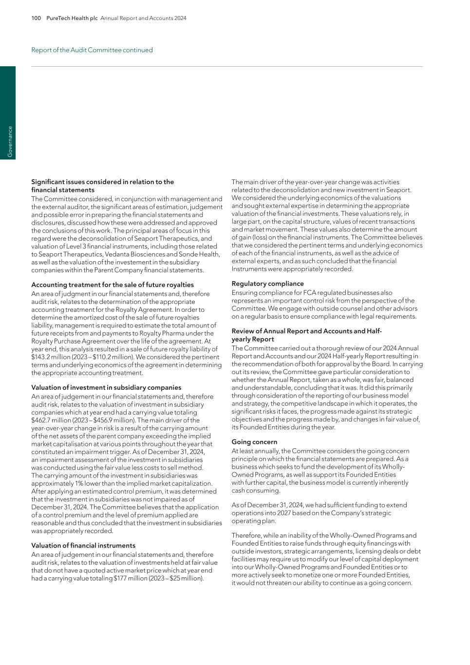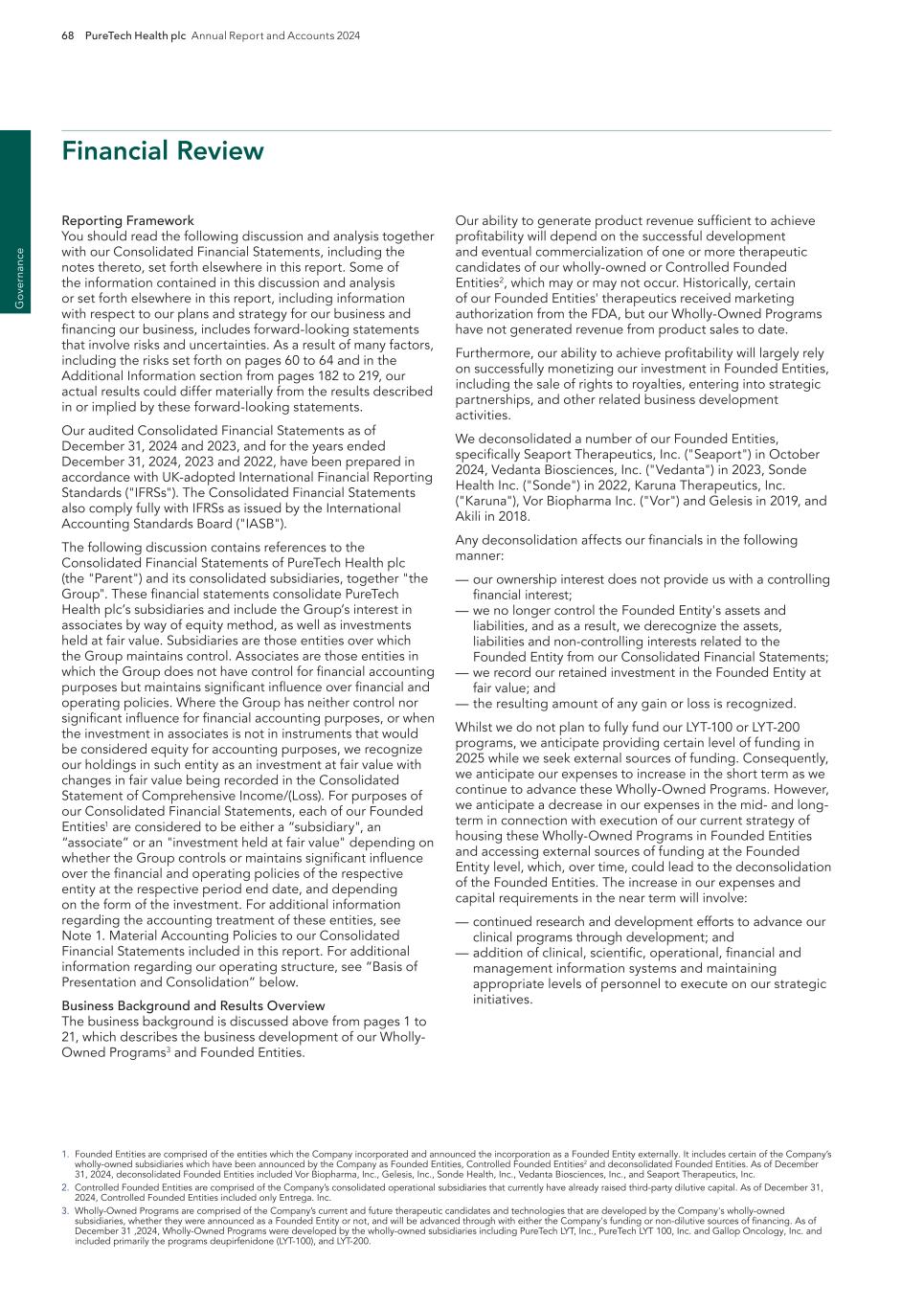 G ov er na nc e 68  PureTech Health plc Annual Report and Accounts 2024 Reporting Framework You should read the following discussion and analysis together  with our Consolidated Financial Statements, including the  notes thereto, set forth elsewhere in this report. Some of  the information contained in this discussion and analysis  or set forth elsewhere in this report, including information  with respect to our plans and strategy for our business and  financing our business, includes forward-looking statements  that involve risks and uncertainties. As a result of many factors,  including the risks set forth on pages 60 to 64 and in the  Additional Information section from pages 182 to 219, our  actual results could differ materially from the results described  in or implied by these forward-looking statements. Our audited Consolidated Financial Statements as of  December 31, 2024 and 2023, and for the years ended  December 31, 2024, 2023 and 2022, have been prepared in  accordance with UK-adopted International Financial Reporting  Standards ("IFRSs"). The Consolidated Financial Statements  also comply fully with IFRSs as issued by the International  Accounting Standards Board ("IASB"). The following discussion contains references to the  Consolidated Financial Statements of PureTech Health plc  (the "Parent") and its consolidated subsidiaries, together "the  Group". These financial statements consolidate PureTech  Health plc’s subsidiaries and include the Group’s interest in  associates by way of equity method, as well as investments  held at fair value. Subsidiaries are those entities over which  the Group maintains control. Associates are those entities in  which the Group does not have control for financial accounting  purposes but maintains significant influence over financial and  operating policies. Where the Group has neither control nor  significant influence for financial accounting purposes, or when  the investment in associates is not in instruments that would  be considered equity for accounting purposes, we recognize  our holdings in such entity as an investment at fair value with  changes in fair value being recorded in the Consolidated  Statement of Comprehensive Income/(Loss). For purposes of  our Consolidated Financial Statements, each of our Founded  Entities1 are considered to be either a “subsidiary", an  “associate” or an "investment held at fair value" depending on  whether the Group controls or maintains significant influence  over the financial and operating policies of the respective  entity at the respective period end date, and depending  on the form of the investment. For additional information  regarding the accounting treatment of these entities, see  Note 1. Material Accounting Policies to our Consolidated  Financial Statements included in this report. For additional  information regarding our operating structure, see “Basis of  Presentation and Consolidation” below. Business Background and Results Overview The business background is discussed above from pages 1 to  21, which describes the business development of our Wholly- Owned Programs3 and Founded Entities.  Our ability to generate product revenue sufficient to achieve  profitability will depend on the successful development  and eventual commercialization of one or more therapeutic  candidates of our wholly-owned or Controlled Founded  Entities2, which may or may not occur. Historically, certain  of our Founded Entities' therapeutics received marketing  authorization from the FDA, but our Wholly-Owned Programs  have not generated revenue from product sales to date.  Furthermore, our ability to achieve profitability will largely rely  on successfully monetizing our investment in Founded Entities,  including the sale of rights to royalties, entering into strategic  partnerships, and other related business development  activities. We deconsolidated a number of our Founded Entities,  specifically Seaport Therapeutics, Inc. ("Seaport") in October  2024, Vedanta Biosciences, Inc. ("Vedanta") in 2023, Sonde  Health Inc. ("Sonde") in 2022, Karuna Therapeutics, Inc.  ("Karuna"), Vor Biopharma Inc. ("Vor") and Gelesis in 2019, and  Akili in 2018. Any deconsolidation affects our financials in the following  manner:   — our ownership interest does not provide us with a controlling  financial interest;   — we no longer control the Founded Entity's assets and  liabilities, and as a result, we derecognize the assets,  liabilities and non-controlling interests related to the  Founded Entity from our Consolidated Financial Statements;  — we record our retained investment in the Founded Entity at  fair value; and   — the resulting amount of any gain or loss is recognized. Whilst we do not plan to fully fund our LYT-100 or LYT-200  programs, we anticipate providing certain level of funding in  2025 while we seek external sources of funding. Consequently,  we anticipate our expenses to increase in the short term as we  continue to advance these Wholly-Owned Programs. However,  we anticipate a decrease in our expenses in the mid- and long- term in connection with execution of our current strategy of  housing these Wholly-Owned Programs in Founded Entities  and accessing external sources of funding at the Founded  Entity level, which, over time, could lead to the deconsolidation  of the Founded Entities. The increase in our expenses and  capital requirements in the near term will involve:   — continued research and development efforts to advance our  clinical programs through development; and  — addition of clinical, scientific, operational, financial and  management information systems and maintaining  appropriate levels of personnel to execute on our strategic  initiatives. Financial Review 1. Founded Entities are comprised of the entities which the Company incorporated and announced the incorporation as a Founded Entity externally. It includes certain of the Company’s  wholly-owned subsidiar