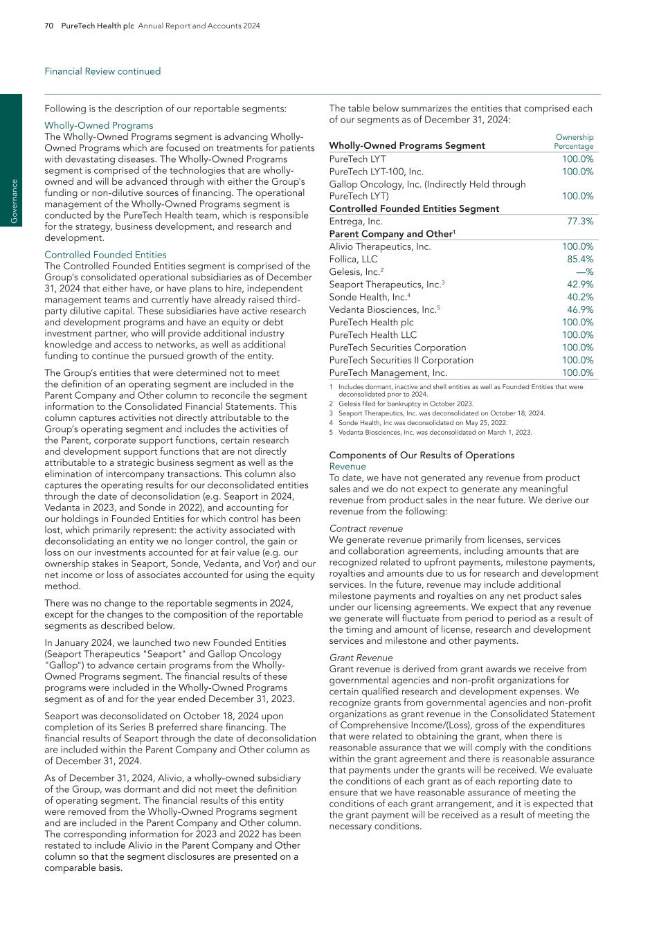 G ov er na nc e 70  PureTech Health plc Annual Report and Accounts 2024 Following is the description of our reportable segments: Wholly-Owned Programs The Wholly-Owned Programs segment is advancing Wholly- Owned Programs which are focused on treatments for patients  with devastating diseases. The Wholly-Owned Programs  segment is comprised of the technologies that are wholly- owned and will be advanced through with either the Group's  funding or non-dilutive sources of financing. The operational  management of the Wholly-Owned Programs segment is  conducted by the PureTech Health team, which is responsible  for the strategy, business development, and research and  development.  Controlled Founded Entities The Controlled Founded Entities segment is comprised of the  Group’s consolidated operational subsidiaries as of December  31, 2024 that either have, or have plans to hire, independent  management teams and currently have already raised third- party dilutive capital. These subsidiaries have active research  and development programs and have an equity or debt  investment partner, who will provide additional industry  knowledge and access to networks, as well as additional  funding to continue the pursued growth of the entity.  The Group’s entities that were determined not to meet  the definition of an operating segment are included in the  Parent Company and Other column to reconcile the segment  information to the Consolidated Financial Statements. This  column captures activities not directly attributable to the  Group’s operating segment and includes the activities of  the Parent, corporate support functions, certain research  and development support functions that are not directly  attributable to a strategic business segment as well as the  elimination of intercompany transactions. This column also  captures the operating results for our deconsolidated entities  through the date of deconsolidation (e.g. Seaport in 2024,  Vedanta in 2023, and Sonde in 2022), and accounting for  our holdings in Founded Entities for which control has been  lost, which primarily represent: the activity associated with  deconsolidating an entity we no longer control, the gain or  loss on our investments accounted for at fair value (e.g. our  ownership stakes in Seaport, Sonde, Vedanta, and Vor) and our  net income or loss of associates accounted for using the equity  method. There was no change to the reportable segments in 2024,  except for the changes to the composition of the reportable  segments as described below. In January 2024, we launched two new Founded Entities  (Seaport Therapeutics "Seaport" and Gallop Oncology  "Gallop") to advance certain programs from the Wholly- Owned Programs segment. The financial results of these  programs were included in the Wholly-Owned Programs  segment as of and for the year ended December 31, 2023. Seaport was deconsolidated on October 18, 2024 upon  completion of its Series B preferred share financing. The  financial results of Seaport through the date of deconsolidation  are included within the Parent Company and Other column as  of December 31, 2024. As of December 31, 2024, Alivio, a wholly-owned subsidiary  of the Group, was dormant and did not meet the definition  of operating segment. The financial results of this entity  were removed from the Wholly-Owned Programs segment  and are included in the Parent Company and Other column.  The corresponding information for 2023 and 2022 has been  restated to include Alivio in the Parent Company and Other  column so that the segment disclosures are presented on a  comparable basis. The table below summarizes the entities that comprised each  of our segments as of December 31, 2024: Wholly-Owned Programs Segment Ownership  Percentage PureTech LYT 100.0% PureTech LYT-100, Inc. 100.0% Gallop Oncology, Inc. (Indirectly Held through  PureTech LYT) 100.0% Controlled Founded Entities Segment Entrega, Inc. 77.3% Parent Company and Other1 Alivio Therapeutics, Inc. 100.0% Follica, LLC 85.4% Gelesis, Inc.2 —% Seaport Therapeutics, Inc.3 42.9% Sonde Health, Inc.4 40.2% Vedanta Biosciences, Inc.5 46.9% PureTech Health plc 100.0% PureTech Health LLC 100.0% PureTech Securities Corporation 100.0% PureTech Securities II Corporation 100.0% PureTech Management, Inc. 100.0% 1 Includes dormant, inactive and shell entities as well as Founded Entities that were  deconsolidated prior to 2024. 2 Gelesis filed for bankruptcy in October 2023. 3  Seaport Therapeutics, Inc. was deconsolidated on October 18, 2024. 4 Sonde Health, Inc was deconsolidated on May 25, 2022. 5 Vedanta Biosciences, Inc. was deconsolidated on March 1, 2023. Components of Our Results of Operations  Revenue To date, we have not generated any revenue from product  sales and we do not expect to generate any meaningful  revenue from product sales in the near future. We derive our  revenue from the following:  Contract revenue We generate revenue primarily from licenses, services  and collaboration agreements, including amounts that are  recognized related to upfront payments, milestone payments,  royalties and amounts due to us for research and development  services. In the future, revenue may include additional  milestone payments and royalties on any net product sales  under our licensing agreements. We expect that any revenue  we generate will fluctuate from period to period as a result of  the timing and amount of license, research and development  services and milestone and other payments.  Grant Revenue Grant revenue is derived from grant awards we receive from  governmental agencies and non-profit organizations for  certain qualified research and development expenses. We  recognize grants from governmental agencies and non-profit  organizations as grant revenue in the Consolidated Statement  of Comprehensive Income/(Loss), gross of the expenditures  that were related to obtaining the grant, when there is  reasonable assurance that we will comply with the cond