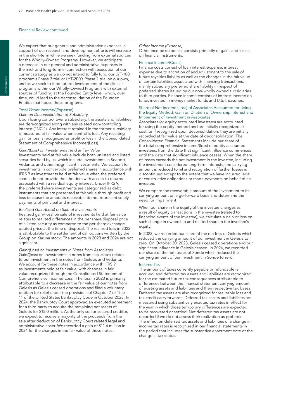 G ov er na nc e 72  PureTech Health plc Annual Report and Accounts 2024 Other Income (Expense)  Other income (expense) consists primarily of gains and losses  on financial instruments. Finance Income/(Costs)  Finance costs consist of loan interest expense, interest  expense due to accretion of and adjustment to the sale of  future royalties liability as well as the changes in the fair value  of certain liabilities associated with financing transactions,  mainly subsidiary preferred share liability in respect of  preferred shares issued by our non-wholly owned subsidiaries  to third parties. Finance income consists of interest income on  funds invested in money market funds and U.S. treasuries.  Share of Net Income (Loss) of Associates Accounted for Using  the Equity Method, Gain on Dilution of Ownership Interest and  Impairment of Investment in Associates Associates (or equity accounted investees) are accounted  for using the equity method and are initially recognized at  cost, or if recognized upon deconsolidation, they are initially  recorded at fair value at the date of deconsolidation. The  Consolidated Financial Statements include our share of  the total comprehensive income/(loss) of equity accounted  investees, from the date that significant influence commences  until the date that significant influence ceases. When the share  of losses exceeds the net investment in the investee, including  the investment considered long-term interests, the carrying  amount is reduced to nil and recognition of further losses is  discontinued except to the extent that we have incurred legal  or constructive obligations or made payments on behalf of an  investee. We compare the recoverable amount of the investment to its  carrying amount on a go-forward basis and determine the  need for impairment.  When our share in the equity of the investee changes as  a result of equity transactions in the investee (related to  financing events of the investee), we calculate a gain or loss on  such change in ownership and related share in the investee's  equity.  In 2023, we recorded our share of the net loss of Gelesis which  reduced the carrying amount of our investment in Gelesis to  zero. On October 30, 2023, Gelesis ceased operations and our  significant influence in Gelesis ceased. In 2024, we recorded  our share of the net losses of Sonde which reduced the  carrying amount of our investment in Sonde to zero. Income Tax  The amount of taxes currently payable or refundable is  accrued, and deferred tax assets and liabilities are recognized  for the estimated future tax consequences attributable to  differences between the financial statement carrying amount  of existing assets and liabilities and their respective tax bases.  Deferred tax assets are also recognized for realizable loss and  tax credit carryforwards. Deferred tax assets and liabilities are  measured using substantively enacted tax rates in effect for  the year in which those temporary differences are expected  to be recovered or settled. Net deferred tax assets are not  recorded if we do not assess their realization as probable.  The effect on deferred tax assets and liabilities of a change in  income tax rates is recognized in our financial statements in  the period that includes the substantive enactment date or the  change in tax status.  We expect that our general and administrative expenses in  support of our research and development efforts will increase  in the short-term while we seek funding from external sources  for the Wholly-Owned Programs. However, we anticipate  a decrease in our general and administrative expenses in  the mid- and long-term in connection with execution of our  current strategy as we do not intend to fully fund our LYT-100  program’s Phase 3 trial or LYT-200’s Phase 2 trial on our own,  and as we seek to fund future development of the clinical  programs within our Wholly-Owned Programs with external  sources of funding at the Founded Entity level, which, over  time, could lead to the deconsolidation of the Founded  Entities that house these programs. Total Other Income/(Expense) Gain on Deconsolidation of Subsidiary Upon losing control over a subsidiary, the assets and liabilities  are derecognized along with any related non-controlling  interest (“NCI”). Any interest retained in the former subsidiary  is measured at fair value when control is lost. Any resulting  gain or loss is recognized as profit or loss in the Consolidated  Statement of Comprehensive Income/(Loss). Gain/(Loss) on Investments Held at Fair Value  Investments held at fair value include both unlisted and listed  securities held by us, which include investments in Seaport,  Vedanta, and other insignificant investments. We account for  investments in convertible preferred shares in accordance with  IFRS 9 as investments held at fair value when the preferred  shares do not provide their holders with access to returns  associated with a residual equity interest. Under IFRS 9,  the preferred share investments are categorized as debt  instruments that are presented at fair value through profit and  loss because the amounts receivable do not represent solely  payments of principal and interest. Realized Gain/(Loss) on Sale of Investments Realized gain/(loss) on sale of investments held at fair value  relates to realized differences in the per share disposal price  of a listed security as compared to the per share exchange  quoted price at the time of disposal. The realized loss in 2022  is attributable to the settlement of call options written by the  Group on Karuna stock. The amounts in 2023 and 2024 are not  significant. Gain/(Loss) on Investments in Notes from Associates Gain/(loss) on investments in notes from associates relates  to our investment in the notes from Gelesis and Vedanta.  We account for these notes in accordance with IFRS 9  as investments held at fair value, with changes in fair  value recognized through the Consolidated S