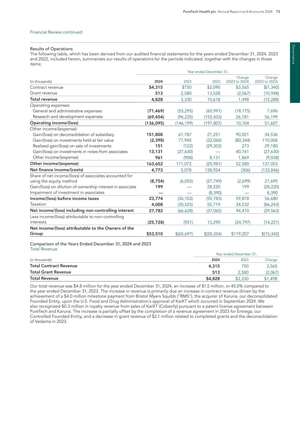 G overnance PureTech Health plc Annual Report and Accounts 2024  73 Results of Operations The following table, which has been derived from our audited financial statements for the years ended December 31, 2024, 2023  and 2022, included herein, summarizes our results of operations for the periods indicated, together with the changes in those  items:   Year ended December 31, (in thousands) 2024 2023 2022 Change  (2023 to 2024) Change  (2022 to 2023) Contract revenue $4,315 $750 $2,090 $3,565 $(1,340) Grant revenue 513 2,580 13,528 (2,067) (10,948) Total revenue 4,828 3,330 15,618 1,498 (12,288) Operating expenses:        General and administrative expenses (71,469) (53,295) (60,991) (18,175) 7,696 Research and development expenses (69,454) (96,235) (152,433) 26,781 56,199 Operating income/(loss) (136,095) (146,199) (197,807) 10,104 51,607 Other income/(expense):        Gain/(loss) on deconsolidation of subsidiary 151,808 61,787 27,251 90,021 34,536 Gain/(loss) on investments held at fair value (2,398) 77,945 (32,060) (80,344) 110,006 Realized gain/(loss) on sale of investments 151 (122) (29,303) 273 29,180 Gain/(loss) on investments in notes from associates 13,131 (27,630) — 40,761 (27,630) Other income/(expense) 961 (908) 8,131 1,869 (9,038) Other income/(expense) 163,652 111,072 (25,981) 52,580 137,053 Net finance income/(costs) 4,773 5,078 138,924 (306) (133,846) Share of net income/(loss) of associates accounted for  using the equity method (8,754) (6,055) (27,749) (2,699) 21,695 Gain/(loss) on dilution of ownership interest in associate 199 — 28,220 199 (28,220) Impairment of investment in associates — — (8,390) — 8,390 Income/(loss) before income taxes 23,774 (36,103) (92,783) 59,878 56,680 Taxation 4,008 (30,525) 55,719 34,532 (86,243) Net income/(loss) including non-controlling interest 27,782 (66,628) (37,065) 94,410 (29,563) Less income/(loss) attributable to non-controlling  interests (25,728) (931) 13,290 (24,797) (14,221) Net income/(loss) attributable to the Owners of the  Group $53,510 $(65,697) $(50,354) $119,207 $(15,342) Comparison of the Years Ended December 31, 2024 and 2023 Total Revenue  Year ended December 31, (in thousands) 2024 2023 Change Total Contract Revenue 4,315 750 3,565 Total Grant Revenue 513 2,580 (2,067) Total Revenue $4,828 $3,330 $1,498 Our total revenue was $4.8 million for the year ended December 31, 2024, an increase of $1.5 million, or 45.0% compared to  the year ended December 31, 2023. The increase in revenue is primarily due an increase in contract revenue driven by the  achievement of a $4.0 million milestone payment from Bristol Myers Squibb ("BMS"), the acquirer of Karuna, our deconsolidated  Founded Entity, upon the U.S. Food and Drug Administration's approval of KarXT which occurred in September 2024. We  also recognized $0.3 million in royalty revenue from sales of KarXT (Cobenfy) pursuant to a patent license agreement between  PureTech and Karuna. The increase is partially offset by the completion of a revenue agreement in 2023 for Entrega, our  Controlled Founded Entity, and a decrease in grant revenue of $2.1 million related to completed grants and the deconsolidation  of Vedanta in 2023. Financial Review continued