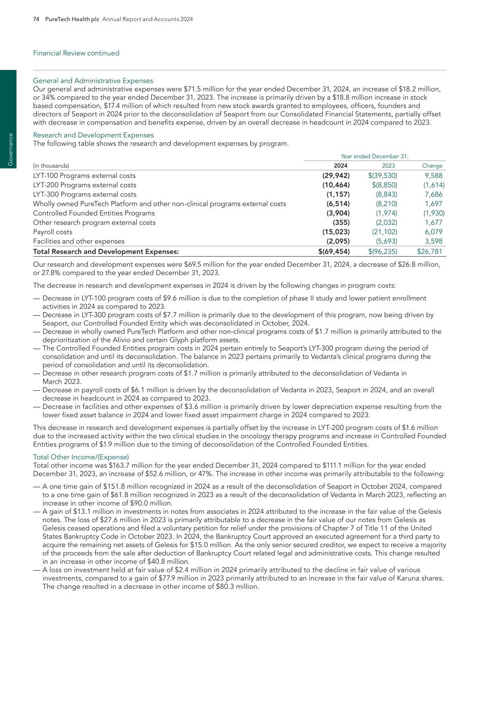G ov er na nc e 74  PureTech Health plc Annual Report and Accounts 2024 General and Administrative Expenses Our general and administrative expenses were $71.5 million for the year ended December 31, 2024, an increase of $18.2 million,  or 34% compared to the year ended December 31, 2023. The increase is primarily driven by a $18.8 million increase in stock  based compensation, $17.4 million of which resulted from new stock awards granted to employees, officers, founders and  directors of Seaport in 2024 prior to the deconsolidation of Seaport from our Consolidated Financial Statements, partially offset  with decrease in compensation and benefits expense, driven by an overall decrease in headcount in 2024 compared to 2023. Research and Development Expenses The following table shows the research and development expenses by program. Year ended December 31, (in thousands) 2024 2023 Change LYT-100 Programs external costs (29,942) $(39,530) 9,588 LYT-200 Programs external costs (10,464) $(8,850) (1,614) LYT-300 Programs external costs (1,157) (8,843) 7,686 Wholly owned PureTech Platform and other non-clinical programs external costs (6,514) (8,210) 1,697 Controlled Founded Entities Programs (3,904) (1,974) (1,930) Other research program external costs (355) (2,032) 1,677 Payroll costs (15,023) (21,102) 6,079 Facilities and other expenses (2,095) (5,693) 3,598 Total Research and Development Expenses: $(69,454) $(96,235) $26,781 Our research and development expenses were $69.5 million for the year ended December 31, 2024, a decrease of $26.8 million,  or 27.8% compared to the year ended December 31, 2023.  The decrease in research and development expenses in 2024 is driven by the following changes in program costs:  — Decrease in LYT-100 program costs of $9.6 million is due to the completion of phase II study and lower patient enrollment  activities in 2024 as compared to 2023.  — Decrease in LYT-300 program costs of $7.7 million is primarily due to the development of this program, now being driven by  Seaport, our Controlled Founded Entity which was deconsolidated in October, 2024.   — Decrease in wholly owned PureTech Platform and other non-clinical programs costs of $1.7 million is primarily attributed to the  deprioritization of the Alivio and certain Glyph platform assets.  — The Controlled Founded Entities program costs in 2024 pertain entirely to Seaport’s LYT-300 program during the period of  consolidation and until its deconsolidation. The balance in 2023 pertains primarily to Vedanta’s clinical programs during the  period of consolidation and until its deconsolidation.  — Decrease in other research program costs of $1.7 million is primarily attributed to the deconsolidation of Vedanta in  March 2023.   — Decrease in payroll costs of $6.1 million is driven by the deconsolidation of Vedanta in 2023, Seaport in 2024, and an overall  decrease in headcount in 2024 as compared to 2023.   — Decrease in facilities and other expenses of $3.6 million is primarily driven by lower depreciation expense resulting from the  lower fixed asset balance in 2024 and lower fixed asset impairment charge in 2024 compared to 2023. This decrease in research and development expenses is partially offset by the increase in LYT-200 program costs of $1.6 million  due to the increased activity within the two clinical studies in the oncology therapy programs and increase in Controlled Founded  Entities programs of $1.9 million due to the timing of deconsolidation of the Controlled Founded Entities.  Total Other Income/(Expense) Total other income was $163.7 million for the year ended December 31, 2024 compared to $111.1 million for the year ended  December 31, 2023, an increase of $52.6 million, or 47%. The increase in other income was primarily attributable to the following:  — A one time gain of $151.8 million recognized in 2024 as a result of the deconsolidation of Seaport in October 2024, compared  to a one time gain of $61.8 million recognized in 2023 as a result of the deconsolidation of Vedanta in March 2023, reflecting an  increase in other income of $90.0 million.  — A gain of $13.1 million in investments in notes from associates in 2024 attributed to the increase in the fair value of the Gelesis  notes. The loss of $27.6 million in 2023 is primarily attributable to a decrease in the fair value of our notes from Gelesis as  Gelesis ceased operations and filed a voluntary petition for relief under the provisions of Chapter 7 of Title 11 of the United  States Bankruptcy Code in October 2023. In 2024, the Bankruptcy Court approved an executed agreement for a third party to  acquire the remaining net assets of Gelesis for $15.0 million. As the only senior secured creditor, we expect to receive a majority  of the proceeds from the sale after deduction of Bankruptcy Court related legal and administrative costs. This change resulted  in an increase in other income of $40.8 million.   — A loss on investment held at fair value of $2.4 million in 2024 primarily attributed to the decline in fair value of various  investments, compared to a gain of $77.9 million in 2023 primarily attributed to an increase in the fair value of Karuna shares.  The change resulted in a decrease in other income of $80.3 million. Financial Review continued