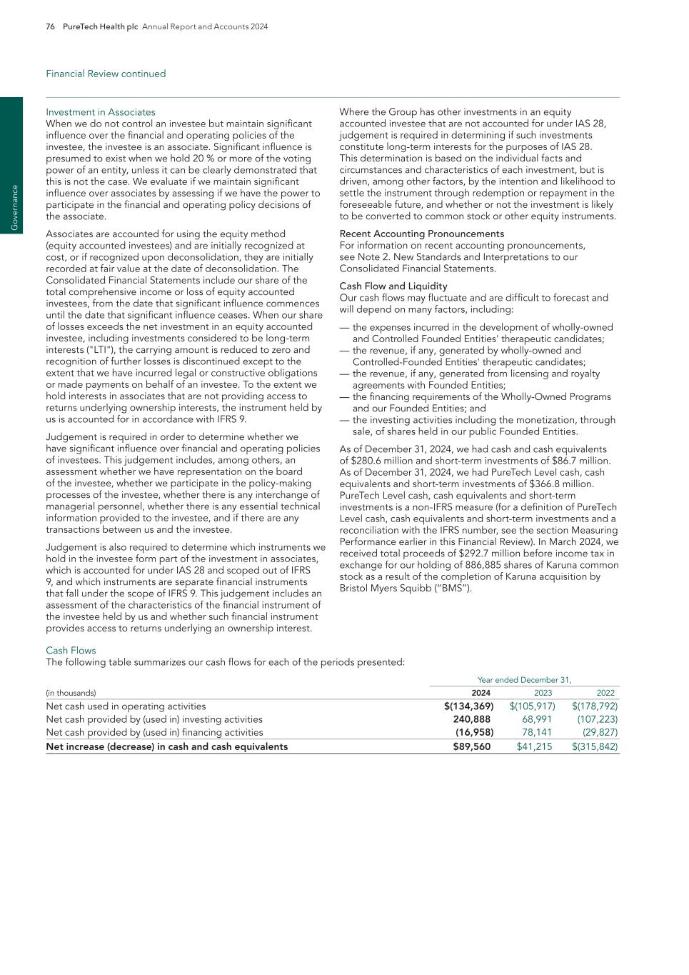 G ov er na nc e 76  PureTech Health plc Annual Report and Accounts 2024 Investment in Associates When we do not control an investee but maintain significant  influence over the financial and operating policies of the  investee, the investee is an associate. Significant influence is  presumed to exist when we hold 20 % or more of the voting  power of an entity, unless it can be clearly demonstrated that  this is not the case. We evaluate if we maintain significant  influence over associates by assessing if we have the power to  participate in the financial and operating policy decisions of  the associate. Associates are accounted for using the equity method  (equity accounted investees) and are initially recognized at  cost, or if recognized upon deconsolidation, they are initially  recorded at fair value at the date of deconsolidation. The  Consolidated Financial Statements include our share of the  total comprehensive income or loss of equity accounted  investees, from the date that significant influence commences  until the date that significant influence ceases. When our share  of losses exceeds the net investment in an equity accounted  investee, including investments considered to be long-term  interests ("LTI"), the carrying amount is reduced to zero and  recognition of further losses is discontinued except to the  extent that we have incurred legal or constructive obligations  or made payments on behalf of an investee. To the extent we  hold interests in associates that are not providing access to  returns underlying ownership interests, the instrument held by  us is accounted for in accordance with IFRS 9. Judgement is required in order to determine whether we  have significant influence over financial and operating policies  of investees. This judgement includes, among others, an  assessment whether we have representation on the board  of the investee, whether we participate in the policy-making  processes of the investee, whether there is any interchange of  managerial personnel, whether there is any essential technical  information provided to the investee, and if there are any  transactions between us and the investee. Judgement is also required to determine which instruments we  hold in the investee form part of the investment in associates,  which is accounted for under IAS 28 and scoped out of IFRS  9, and which instruments are separate financial instruments  that fall under the scope of IFRS 9. This judgement includes an  assessment of the characteristics of the financial instrument of  the investee held by us and whether such financial instrument  provides access to returns underlying an ownership interest. Where the Group has other investments in an equity  accounted investee that are not accounted for under IAS 28,  judgement is required in determining if such investments  constitute long-term interests for the purposes of IAS 28.  This determination is based on the individual facts and  circumstances and characteristics of each investment, but is  driven, among other factors, by the intention and likelihood to  settle the instrument through redemption or repayment in the  foreseeable future, and whether or not the investment is likely  to be converted to common stock or other equity instruments.  Recent Accounting Pronouncements  For information on recent accounting pronouncements,  see Note 2. New Standards and Interpretations to our  Consolidated Financial Statements.  Cash Flow and Liquidity Our cash flows may fluctuate and are difficult to forecast and  will depend on many factors, including:  — the expenses incurred in the development of wholly-owned  and Controlled Founded Entities' therapeutic candidates;  — the revenue, if any, generated by wholly-owned and  Controlled-Founded Entities' therapeutic candidates;  — the revenue, if any, generated from licensing and royalty  agreements with Founded Entities;  — the financing requirements of the Wholly-Owned Programs  and our Founded Entities; and  — the investing activities including the monetization, through  sale, of shares held in our public Founded Entities. As of December 31, 2024, we had cash and cash equivalents  of $280.6 million and short-term investments of $86.7 million.  As of December 31, 2024, we had PureTech Level cash, cash  equivalents and short-term investments of $366.8 million.  PureTech Level cash, cash equivalents and short-term  investments is a non-IFRS measure (for a definition of PureTech  Level cash, cash equivalents and short-term investments and a  reconciliation with the IFRS number, see the section Measuring  Performance earlier in this Financial Review). In March 2024, we  received total proceeds of $292.7 million before income tax in  exchange for our holding of 886,885 shares of Karuna common  stock as a result of the completion of Karuna acquisition by  Bristol Myers Squibb (“BMS”). Cash Flows  The following table summarizes our cash flows for each of the periods presented:   Year ended December 31, (in thousands) 2024 2023 2022 Net cash used in operating activities $(134,369) $(105,917) $(178,792) Net cash provided by (used in) investing activities 240,888 68,991 (107,223) Net cash provided by (used in) financing activities (16,958) 78,141 (29,827) Net increase (decrease) in cash and cash equivalents $89,560 $41,215 $(315,842) Financial Review continued