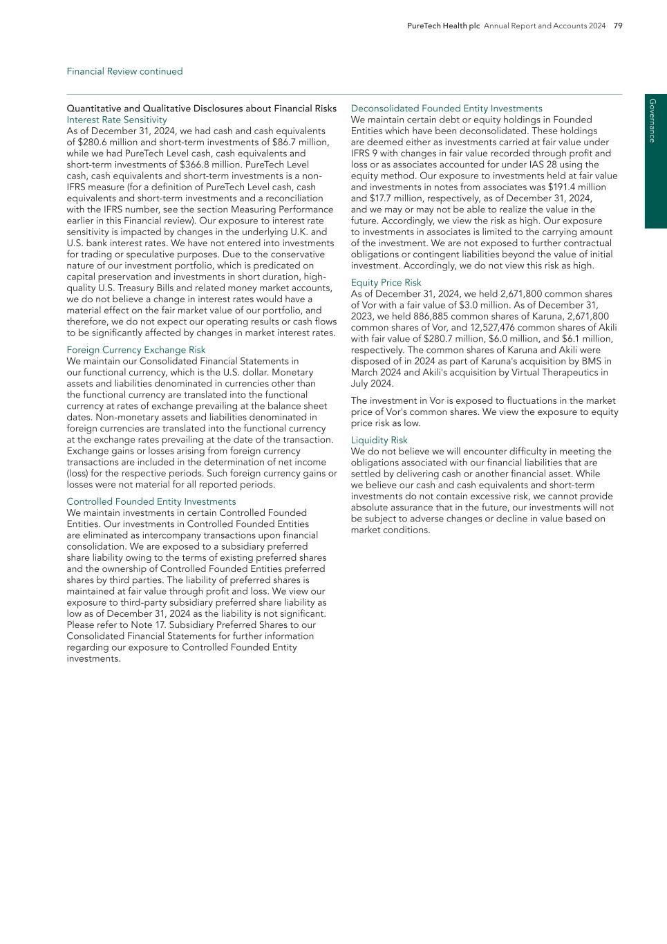 G overnance PureTech Health plc Annual Report and Accounts 2024  79 Quantitative and Qualitative Disclosures about Financial Risks Interest Rate Sensitivity  As of December 31, 2024, we had cash and cash equivalents  of $280.6 million and short-term investments of $86.7 million,  while we had PureTech Level cash, cash equivalents and  short-term investments of $366.8 million. PureTech Level  cash, cash equivalents and short-term investments is a non- IFRS measure (for a definition of PureTech Level cash, cash  equivalents and short-term investments and a reconciliation  with the IFRS number, see the section Measuring Performance  earlier in this Financial review). Our exposure to interest rate  sensitivity is impacted by changes in the underlying U.K. and  U.S. bank interest rates. We have not entered into investments  for trading or speculative purposes. Due to the conservative  nature of our investment portfolio, which is predicated on  capital preservation and investments in short duration, high- quality U.S. Treasury Bills and related money market accounts,  we do not believe a change in interest rates would have a  material effect on the fair market value of our portfolio, and  therefore, we do not expect our operating results or cash flows  to be significantly affected by changes in market interest rates.  Foreign Currency Exchange Risk  We maintain our Consolidated Financial Statements in  our functional currency, which is the U.S. dollar. Monetary  assets and liabilities denominated in currencies other than  the functional currency are translated into the functional  currency at rates of exchange prevailing at the balance sheet  dates. Non-monetary assets and liabilities denominated in  foreign currencies are translated into the functional currency  at the exchange rates prevailing at the date of the transaction.  Exchange gains or losses arising from foreign currency  transactions are included in the determination of net income  (loss) for the respective periods. Such foreign currency gains or  losses were not material for all reported periods. Controlled Founded Entity Investments We maintain investments in certain Controlled Founded  Entities. Our investments in Controlled Founded Entities  are eliminated as intercompany transactions upon financial  consolidation. We are exposed to a subsidiary preferred  share liability owing to the terms of existing preferred shares  and the ownership of Controlled Founded Entities preferred  shares by third parties. The liability of preferred shares is  maintained at fair value through profit and loss. We view our  exposure to third-party subsidiary preferred share liability as  low as of December 31, 2024 as the liability is not significant.  Please refer to Note 17. Subsidiary Preferred Shares to our  Consolidated Financial Statements for further information  regarding our exposure to Controlled Founded Entity  investments.  Deconsolidated Founded Entity Investments We maintain certain debt or equity holdings in Founded  Entities which have been deconsolidated. These holdings  are deemed either as investments carried at fair value under  IFRS 9 with changes in fair value recorded through profit and  loss or as associates accounted for under IAS 28 using the  equity method. Our exposure to investments held at fair value  and investments in notes from associates was $191.4 million  and $17.7 million, respectively, as of December 31, 2024,  and we may or may not be able to realize the value in the  future. Accordingly, we view the risk as high. Our exposure  to investments in associates is limited to the carrying amount  of the investment. We are not exposed to further contractual  obligations or contingent liabilities beyond the value of initial  investment. Accordingly, we do not view this risk as high.  Equity Price Risk  As of December 31, 2024, we held 2,671,800 common shares  of Vor with a fair value of $3.0 million. As of December 31,  2023, we held 886,885 common shares of Karuna, 2,671,800  common shares of Vor, and 12,527,476 common shares of Akili  with fair value of $280.7 million, $6.0 million, and $6.1 million,  respectively. The common shares of Karuna and Akili were  disposed of in 2024 as part of Karuna's acquisition by BMS in  March 2024 and Akili's acquisition by Virtual Therapeutics in  July 2024.  The investment in Vor is exposed to fluctuations in the market  price of Vor's common shares. We view the exposure to equity  price risk as low.  Liquidity Risk  We do not believe we will encounter difficulty in meeting the  obligations associated with our financial liabilities that are  settled by delivering cash or another financial asset. While  we believe our cash and cash equivalents and short-term  investments do not contain excessive risk, we cannot provide  absolute assurance that in the future, our investments will not  be subject to adverse changes or decline in value based on  market conditions.  Financial Review continued
