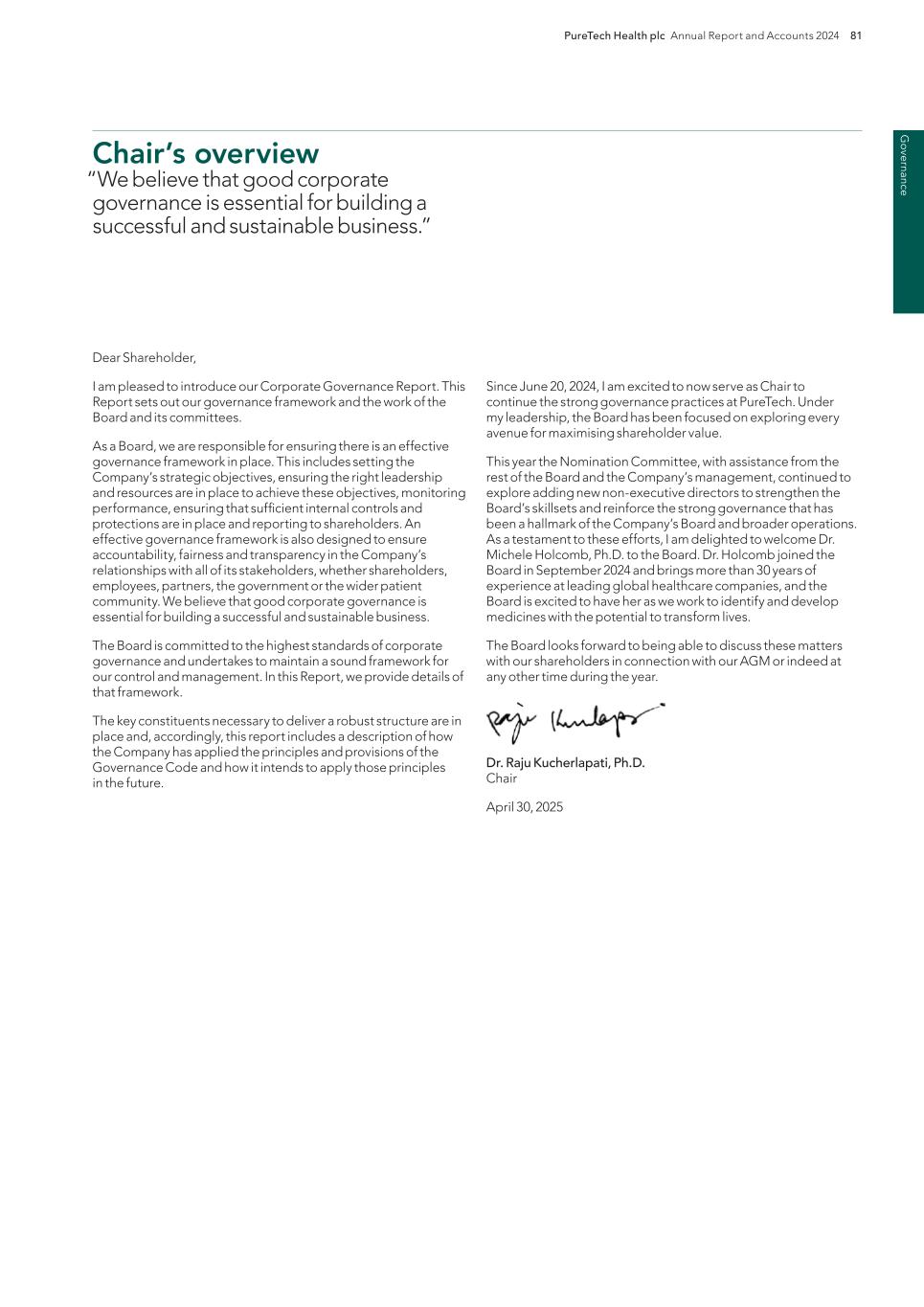 PureTech Health plc Annual Report and Accounts 2024  81 G overnance Since June 20, 2024, I am excited to now serve as Chair to  continue the strong governance practices at PureTech. Under  my leadership, the Board has been focused on exploring every  avenue for maximising shareholder value.  This year the Nomination Committee, with assistance from the  rest of the Board and the Company’s management, continued to  explore adding new non-executive directors to strengthen the  Board’s skillsets and reinforce the strong governance that has  been a hallmark of the Company’s Board and broader operations.  As a testament to these efforts, I am delighted to welcome Dr.  Michele Holcomb, Ph.D. to the Board. Dr. Holcomb joined the  Board in September 2024 and brings more than 30 years of  experience at leading global healthcare companies, and the  Board is excited to have her as we work to identify and develop  medicines with the potential to transform lives.  The Board looks forward to being able to discuss these matters  with our shareholders in connection with our AGM or indeed at  any other time during the year. Dr. Raju Kucherlapati, Ph.D.  Chair April 30, 2025 Dear Shareholder, I am pleased to introduce our Corporate Governance Report. This  Report sets out our governance framework and the work of the  Board and its committees. As a Board, we are responsible for ensuring there is an effective  governance framework in place. This includes setting the  Company’s strategic objectives, ensuring the right leadership  and resources are in place to achieve these objectives, monitoring  performance, ensuring that sufficient internal controls and  protections are in place and reporting to shareholders. An  effective governance framework is also designed to ensure  accountability, fairness and transparency in the Company’s  relationships with all of its stakeholders, whether shareholders,  employees, partners, the government or the wider patient  community. We believe that good corporate governance is  essential for building a successful and sustainable business. The Board is committed to the highest standards of corporate  governance and undertakes to maintain a sound framework for  our control and management. In this Report, we provide details of  that framework. The key constituents necessary to deliver a robust structure are in  place and, accordingly, this report includes a description of how  the Company has applied the principles and provisions of the  Governance Code and how it intends to apply those principles  in the future. Chair’s overview “We believe that good corporate  governance is essential for building a  successful and sustainable business.”