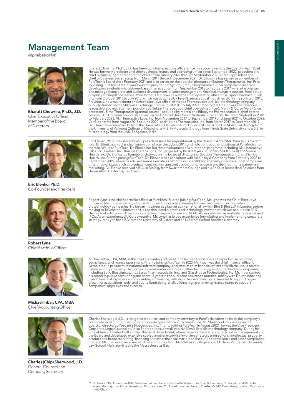 PureTech Health plc Annual Report and Accounts 2024  85 G overnance Eric Elenko, Ph.D. Co-Founder and President  Bharatt Chowrira, Ph.D., J.D. Chief Executive Officer,  Member of the Board  of Directors Bharatt Chowrira, Ph.D., J.D., has been our chief executive officer since his appointment by the Board in April 2024.  He was formerly president and chief business, finance and operating officer since September 2022, president and  chief business, legal and operating officer from January 2022 through September 2022 and our president and  chief of business and strategy from March 2017 through December 2021. Dr. Chowrira has served as a member of  PureTech’s Board since February 2021 and also serves on the board of directors of Seaport Therapeutics. Inc. Prior  to joining PureTech, Dr. Chowrira was the president of Synlogic, Inc., a biopharmaceutical company focused on  developing synthetic microbiome-based therapeutics, from September 2015 to February 2017, where he oversaw  and managed corporate and business development, alliance management, financial, human resources, intellectual  property and legal operations. Prior to that, Dr. Chowrira was the chief operating officer of Auspex Pharmaceuticals,  Inc. from October 2013 to July 2015, which was acquired by Teva Pharmaceutical Industries Ltd. in the spring of 2015.  Previously, he was president and chief executive officer of Addex Therapeutics Ltd., a biotechnology company  publicly-traded on the SIX Swiss Exchange, from August 2011 to July 2013. Prior to that Dr. Chowrira held various  leadership and management positions at Nektar Therapeutics (chief operating officer), Merck & Co, or Merck (vice  president), Sirna Therapeutics (general counsel; acquired by Merck) and Ribozyme Pharmaceuticals (chief patent  counsel). Dr. Chowrira previously served on the board of directors of Vedanta Biosciences, Inc. from September 2018  to February 2023, Akili Interactive Labs, Inc. from November 2017 to September 2019 and June 2021 to October 2022,  Vor Biopharma from August 2018 to June 2020, and Karuna Therapeutics, Inc. from March 2017 to December 2019.  Dr. Chowrira received a J.D. from the University of Denver’s Sturm College of Law, a Ph.D. in Molecular Biology from  the University of Vermont College of Medicine, a M.S. in Molecular Biology from Illinois State University and a B.S. in  Microbiology from the UAS, Bangalore, India. Eric Elenko, Ph.D., has served as our president since his appointment by the Board in April 2024. Prior to his current  role, Dr. Elenko served as chief innovation officer since June 2015 and held various other positions at PureTech prior  thereto. While at PureTech, Dr. Elenko has led the development of a number of programs, including Akili Interactive  Labs, Inc., Gelesis, Inc., Karuna Therapeutics, Inc. (acquired by Bristol Myers Squibb for $14.0 billion) and Sonde  Health, Inc. Dr. Elenko is a founder and serves on the board of directors of Seaport Therapeutics. Inc. and Sonde  Health, Inc. Prior to joining PureTech, Dr. Elenko was a consultant with McKinsey & Company from February 2002 to  September 2005, where he advised senior executives of both Fortune 500 and specialty pharmaceutical companies  on a range of issues such as product licensing, mergers and acquisitions, research and development strategy and  marketing. Dr. Elenko received a B.A. in Biology from Swarthmore College and his Ph.D. in Biomedical Sciences from  University of California, San Diego. Management Team (alphabetically)* Michael Inbar, CPA, MBA Chief Accounting Officer Robert Lyne Chief Portfolio Officer Charles (Chip) Sherwood, J.D. General Counsel and  Company Secretary Michael Inbar, CPA, MBA, is the chief accounting officer at PureTech where he leads all aspects of accounting,  compliance, and finance operations. Prior to joining PureTech in 2023, Mr. Inbar was the chief financial officer of  Acronis Inc., a private multinational software company, and interim chief financial officer at Wallarm, Inc., a private  cyber-security company. He has held several leadership roles in other technology and biotechnology companies,  including Solid Biosciences, Inc., Syros Pharmaceuticals, Inc., and GlassHouse Technologies, Inc. Mr. Inbar started  his career in public accounting and spent 11 years in the audit and assurance practice, mostly with EY. Mr. Inbar has  over 20 years of experience in accounting and finance, with expertise in scaling up businesses to support organic  growth or acquisitions, debt and equity fundraising, and building high performing finance teams to support  companies’ objectives and success. Robert Lyne is the chief portfolio officer at PureTech. Prior to joining PureTech, Mr. Lyne was the Chief Executive  Officer at Arix Bioscience plc, a transatlantic venture capital company focused on investing in innovative  biotechnology companies. He began his career as a lawyer at international law firm Bird & Bird LLP in London before  moving to Touchstone Innovations, a London listed biotech and technology investor, which was acquired in 2017.  He has worked on over 80 venture capital financings in Europe and North America as well as multiple trade exits and  IPOs. As an experienced UK plc executive, Mr. Lyne has broad experience formulating and implementing corporate  strategy. Mr. Lyne has a BA from the University of Oxford and an LLB from Oxford Brookes University. Charles Sherwood, J.D., is the general counsel and company secretary at PureTech, where he leads the company’s  corporate legal function, including corporate governance and compliance. Mr. Sherwood also serves on the  board of directors of Vedanta Biosciences, Inc. Prior to joining PureTech in August 2021, he was the Vice President,  Corporate Legal Counsel at Anika Therapeutics, a small-cap NASDAQ-listed biotechnology company. During his  time at Anika, Charles built and led the legal department, where he served as a strategic advisor to management and  the Boar
