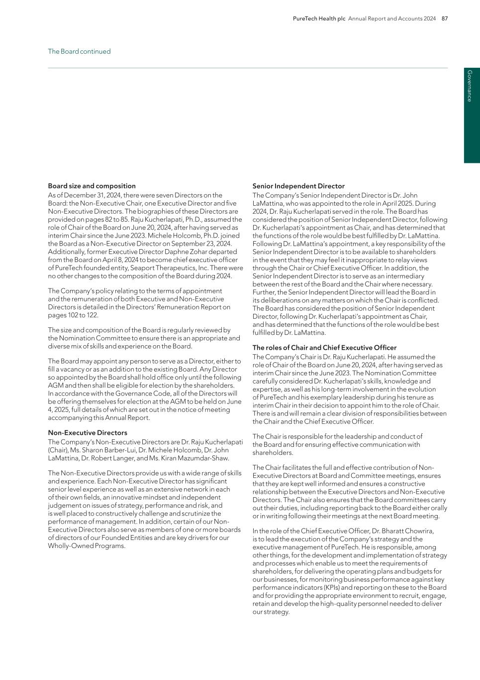 PureTech Health plc Annual Report and Accounts 2024  87 G overnance The Board continued Senior Independent Director The Company’s Senior Independent Director is Dr. John  LaMattina, who was appointed to the role in April 2025. During  2024, Dr. Raju Kucherlapati served in the role. The Board has  considered the position of Senior Independent Director, following  Dr. Kucherlapati’s appointment as Chair, and has determined that  the functions of the role would be best fulfilled by Dr. LaMattina.  Following Dr. LaMattina’s appointment, a key responsibility of the  Senior Independent Director is to be available to shareholders  in the event that they may feel it inappropriate to relay views  through the Chair or Chief Executive Officer. In addition, the  Senior Independent Director is to serve as an intermediary  between the rest of the Board and the Chair where necessary.  Further, the Senior Independent Director will lead the Board in  its deliberations on any matters on which the Chair is conflicted.  The Board has considered the position of Senior Independent  Director, following Dr. Kucherlapati’s appointment as Chair,  and has determined that the functions of the role would be best  fulfilled by Dr. LaMattina. The roles of Chair and Chief Executive Officer The Company’s Chair is Dr. Raju Kucherlapati. He assumed the  role of Chair of the Board on June 20, 2024, after having served as  interim Chair since the June 2023. The Nomination Committee  carefully considered Dr. Kucherlapati’s skills, knowledge and  expertise, as well as his long-term involvement in the evolution  of PureTech and his exemplary leadership during his tenure as  interim Chair in their decision to appoint him to the role of Chair.  There is and will remain a clear division of responsibilities between  the Chair and the Chief Executive Officer.  The Chair is responsible for the leadership and conduct of  the Board and for ensuring effective communication with  shareholders. The Chair facilitates the full and effective contribution of Non- Executive Directors at Board and Committee meetings, ensures  that they are kept well informed and ensures a constructive  relationship between the Executive Directors and Non-Executive  Directors. The Chair also ensures that the Board committees carry  out their duties, including reporting back to the Board either orally  or in writing following their meetings at the next Board meeting. In the role of the Chief Executive Officer, Dr. Bharatt Chowrira,  is to lead the execution of the Company’s strategy and the  executive management of PureTech. He is responsible, among  other things, for the development and implementation of strategy  and processes which enable us to meet the requirements of  shareholders, for delivering the operating plans and budgets for  our businesses, for monitoring business performance against key  performance indicators (KPIs) and reporting on these to the Board  and for providing the appropriate environment to recruit, engage,  retain and develop the high-quality personnel needed to deliver  our strategy. Board size and composition As of December 31, 2024, there were seven Directors on the  Board: the Non-Executive Chair, one Executive Director and five  Non-Executive Directors. The biographies of these Directors are  provided on pages 82 to 85. Raju Kucherlapati, Ph.D., assumed the  role of Chair of the Board on June 20, 2024, after having served as  interim Chair since the June 2023. Michele Holcomb, Ph.D. joined  the Board as a Non-Executive Director on September 23, 2024.  Additionally, former Executive Director Daphne Zohar departed  from the Board on April 8, 2024 to become chief executive officer  of PureTech founded entity, Seaport Therapeutics, Inc. There were  no other changes to the composition of the Board during 2024.  The Company’s policy relating to the terms of appointment  and the remuneration of both Executive and Non-Executive  Directors is detailed in the Directors’ Remuneration Report on  pages 102 to 122. The size and composition of the Board is regularly reviewed by  the Nomination Committee to ensure there is an appropriate and  diverse mix of skills and experience on the Board. The Board may appoint any person to serve as a Director, either to  fill a vacancy or as an addition to the existing Board. Any Director  so appointed by the Board shall hold office only until the following  AGM and then shall be eligible for election by the shareholders.  In accordance with the Governance Code, all of the Directors will  be offering themselves for election at the AGM to be held on June  4, 2025, full details of which are set out in the notice of meeting  accompanying this Annual Report. Non-Executive Directors The Company’s Non-Executive Directors are Dr. Raju Kucherlapati  (Chair), Ms. Sharon Barber-Lui, Dr. Michele Holcomb, Dr. John  LaMattina, Dr. Robert Langer, and Ms. Kiran Mazumdar-Shaw.  The Non-Executive Directors provide us with a wide range of skills  and experience. Each Non-Executive Director has significant  senior level experience as well as an extensive network in each  of their own fields, an innovative mindset and independent  judgement on issues of strategy, performance and risk, and  is well placed to constructively challenge and scrutinize the  performance of management. In addition, certain of our Non- Executive Directors also serve as members of one or more boards  of directors of our Founded Entities and are key drivers for our  Wholly-Owned Programs.