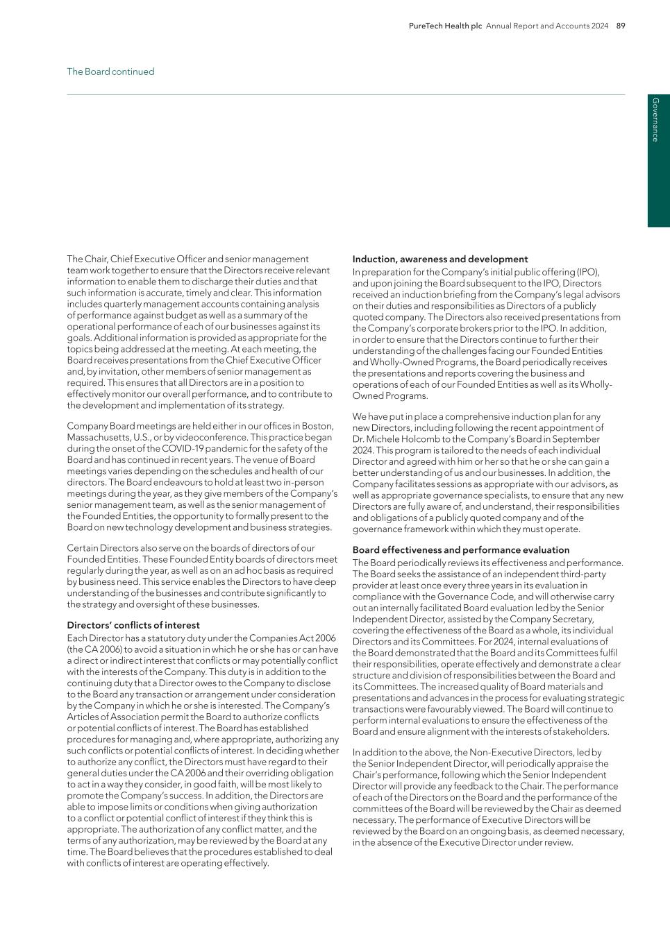 PureTech Health plc Annual Report and Accounts 2024  89 G overnance The Board continued Induction, awareness and development In preparation for the Company’s initial public offering (IPO),  and upon joining the Board subsequent to the IPO, Directors  received an induction briefing from the Company’s legal advisors  on their duties and responsibilities as Directors of a publicly  quoted company. The Directors also received presentations from  the Company’s corporate brokers prior to the IPO. In addition,  in order to ensure that the Directors continue to further their  understanding of the challenges facing our Founded Entities  and Wholly-Owned Programs, the Board periodically receives  the presentations and reports covering the business and  operations of each of our Founded Entities as well as its Wholly- Owned Programs. We have put in place a comprehensive induction plan for any  new Directors, including following the recent appointment of  Dr. Michele Holcomb to the Company’s Board in September  2024. This program is tailored to the needs of each individual  Director and agreed with him or her so that he or she can gain a  better understanding of us and our businesses. In addition, the  Company facilitates sessions as appropriate with our advisors, as  well as appropriate governance specialists, to ensure that any new  Directors are fully aware of, and understand, their responsibilities  and obligations of a publicly quoted company and of the  governance framework within which they must operate.  Board effectiveness and performance evaluation The Board periodically reviews its effectiveness and performance.  The Board seeks the assistance of an independent third-party  provider at least once every three years in its evaluation in  compliance with the Governance Code, and will otherwise carry  out an internally facilitated Board evaluation led by the Senior  Independent Director, assisted by the Company Secretary,  covering the effectiveness of the Board as a whole, its individual  Directors and its Committees. For 2024, internal evaluations of  the Board demonstrated that the Board and its Committees fulfil  their responsibilities, operate effectively and demonstrate a clear  structure and division of responsibilities between the Board and  its Committees. The increased quality of Board materials and  presentations and advances in the process for evaluating strategic  transactions were favourably viewed. The Board will continue to  perform internal evaluations to ensure the effectiveness of the  Board and ensure alignment with the interests of stakeholders. In addition to the above, the Non-Executive Directors, led by  the Senior Independent Director, will periodically appraise the  Chair’s performance, following which the Senior Independent  Director will provide any feedback to the Chair. The performance  of each of the Directors on the Board and the performance of the  committees of the Board will be reviewed by the Chair as deemed  necessary. The performance of Executive Directors will be  reviewed by the Board on an ongoing basis, as deemed necessary,  in the absence of the Executive Director under review. The Chair, Chief Executive Officer and senior management  team work together to ensure that the Directors receive relevant  information to enable them to discharge their duties and that  such information is accurate, timely and clear. This information  includes quarterly management accounts containing analysis  of performance against budget as well as a summary of the  operational performance of each of our businesses against its  goals. Additional information is provided as appropriate for the  topics being addressed at the meeting. At each meeting, the  Board receives presentations from the Chief Executive Officer  and, by invitation, other members of senior management as  required. This ensures that all Directors are in a position to  effectively monitor our overall performance, and to contribute to  the development and implementation of its strategy. Company Board meetings are held either in our offices in Boston,  Massachusetts, U.S., or by videoconference. This practice began  during the onset of the COVID-19 pandemic for the safety of the  Board and has continued in recent years. The venue of Board  meetings varies depending on the schedules and health of our  directors. The Board endeavours to hold at least two in-person  meetings during the year, as they give members of the Company’s  senior management team, as well as the senior management of  the Founded Entities, the opportunity to formally present to the  Board on new technology development and business strategies.  Certain Directors also serve on the boards of directors of our  Founded Entities. These Founded Entity boards of directors meet  regularly during the year, as well as on an ad hoc basis as required  by business need. This service enables the Directors to have deep  understanding of the businesses and contribute significantly to  the strategy and oversight of these businesses. Directors’ conflicts of interest Each Director has a statutory duty under the Companies Act 2006  (the CA 2006) to avoid a situation in which he or she has or can have  a direct or indirect interest that conflicts or may potentially conflict  with the interests of the Company. This duty is in addition to the  continuing duty that a Director owes to the Company to disclose  to the Board any transaction or arrangement under consideration  by the Company in which he or she is interested. The Company’s  Articles of Association permit the Board to authorize conflicts  or potential conflicts of interest. The Board has established  procedures for managing and, where appropriate, authorizing any  such conflicts or potential conflicts of interest. In deciding whether  to authorize any conflict, the Directors must have regard to their  general duties under the CA 2006 and their overriding obligation  to act in a way they con
