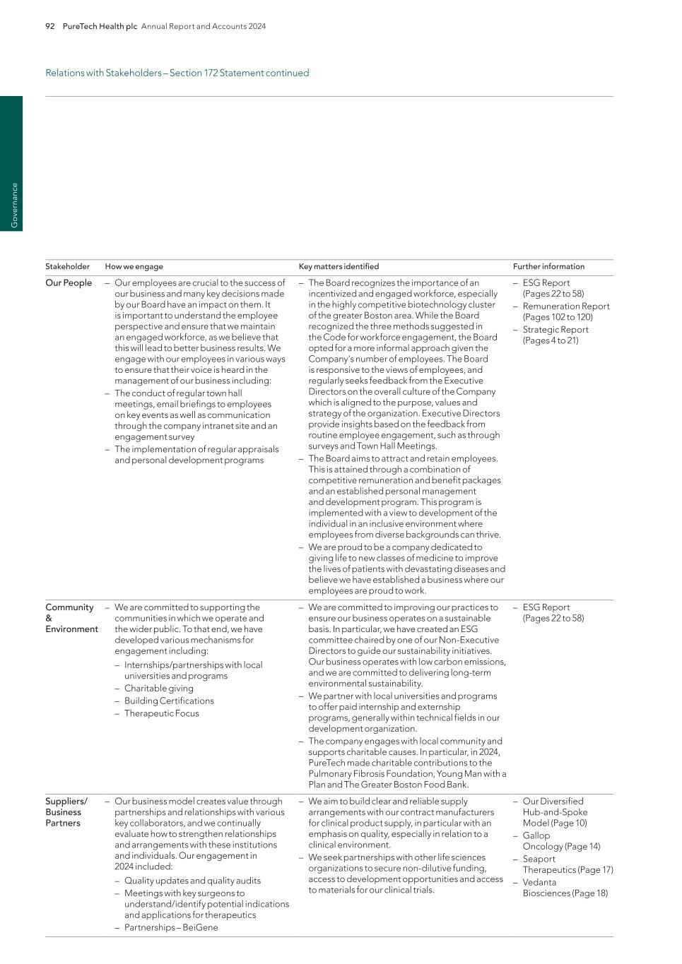 92  PureTech Health plc Annual Report and Accounts 2024 G ov er na nc e Stakeholder How we engage Key matters identified Further information Our People  – Our employees are crucial to the success of  our business and many key decisions made  by our Board have an impact on them. It  is important to understand the employee  perspective and ensure that we maintain  an engaged workforce, as we believe that  this will lead to better business results. We  engage with our employees in various ways  to ensure that their voice is heard in the  management of our business including:  – The conduct of regular town hall  meetings, email briefings to employees  on key events as well as communication  through the company intranet site and an  engagement survey  – The implementation of regular appraisals  and personal development programs  – The Board recognizes the importance of an  incentivized and engaged workforce, especially  in the highly competitive biotechnology cluster  of the greater Boston area. While the Board  recognized the three methods suggested in  the Code for workforce engagement, the Board  opted for a more informal approach given the  Company’s number of employees. The Board  is responsive to the views of employees, and  regularly seeks feedback from the Executive  Directors on the overall culture of the Company  which is aligned to the purpose, values and  strategy of the organization. Executive Directors  provide insights based on the feedback from  routine employee engagement, such as through  surveys and Town Hall Meetings.   – The Board aims to attract and retain employees.  This is attained through a combination of  competitive remuneration and benefit packages  and an established personal management  and development program. This program is  implemented with a view to development of the  individual in an inclusive environment where  employees from diverse backgrounds can thrive.   – We are proud to be a company dedicated to  giving life to new classes of medicine to improve  the lives of patients with devastating diseases and  believe we have established a business where our  employees are proud to work.   – ESG Report  (Pages 22 to 58)  – Remuneration Report  (Pages 102 to 120)  – Strategic Report  (Pages 4 to 21) Community  &  Environment  – We are committed to supporting the  communities in which we operate and  the wider public. To that end, we have  developed various mechanisms for  engagement including:   – Internships/partnerships with local  universities and programs  – Charitable giving  – Building Certifications  – Therapeutic Focus  – We are committed to improving our practices to  ensure our business operates on a sustainable  basis. In particular, we have created an ESG  committee chaired by one of our Non-Executive  Directors to guide our sustainability initiatives.  Our business operates with low carbon emissions,  and we are committed to delivering long-term  environmental sustainability.  – We partner with local universities and programs  to offer paid internship and externship  programs, generally within technical fields in our  development organization.   – The company engages with local community and  supports charitable causes. In particular, in 2024,  PureTech made charitable contributions to the  Pulmonary Fibrosis Foundation, Young Man with a  Plan and The Greater Boston Food Bank.   – ESG Report  (Pages 22 to 58) Suppliers/ Business  Partners  – Our business model creates value through  partnerships and relationships with various  key collaborators, and we continually  evaluate how to strengthen relationships  and arrangements with these institutions  and individuals. Our engagement in  2024 included:  – Quality updates and quality audits  – Meetings with key surgeons to  understand/identify potential indications  and applications for therapeutics  – Partnerships – BeiGene   – We aim to build clear and reliable supply  arrangements with our contract manufacturers  for clinical product supply, in particular with an  emphasis on quality, especially in relation to a  clinical environment.   – We seek partnerships with other life sciences  organizations to secure non-dilutive funding,  access to development opportunities and access  to materials for our clinical trials.  – Our Diversified  Hub-and-Spoke  Model (Page 10)  – Gallop  Oncology (Page 14)  – Seaport  Therapeutics (Page 17)  – Vedanta  Biosciences (Page 18) Relations with Stakeholders – Section 172 Statement continued
