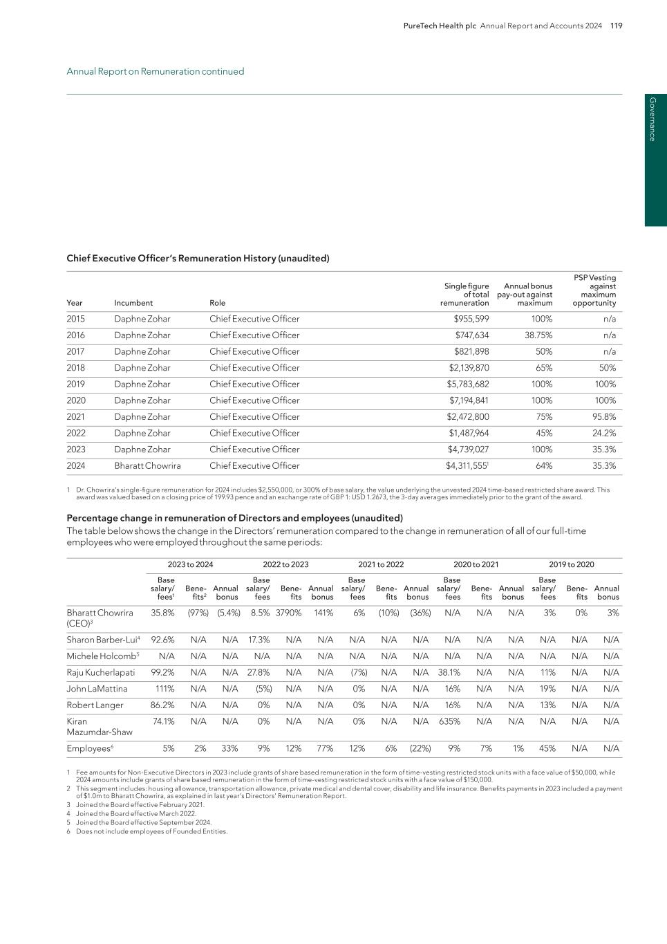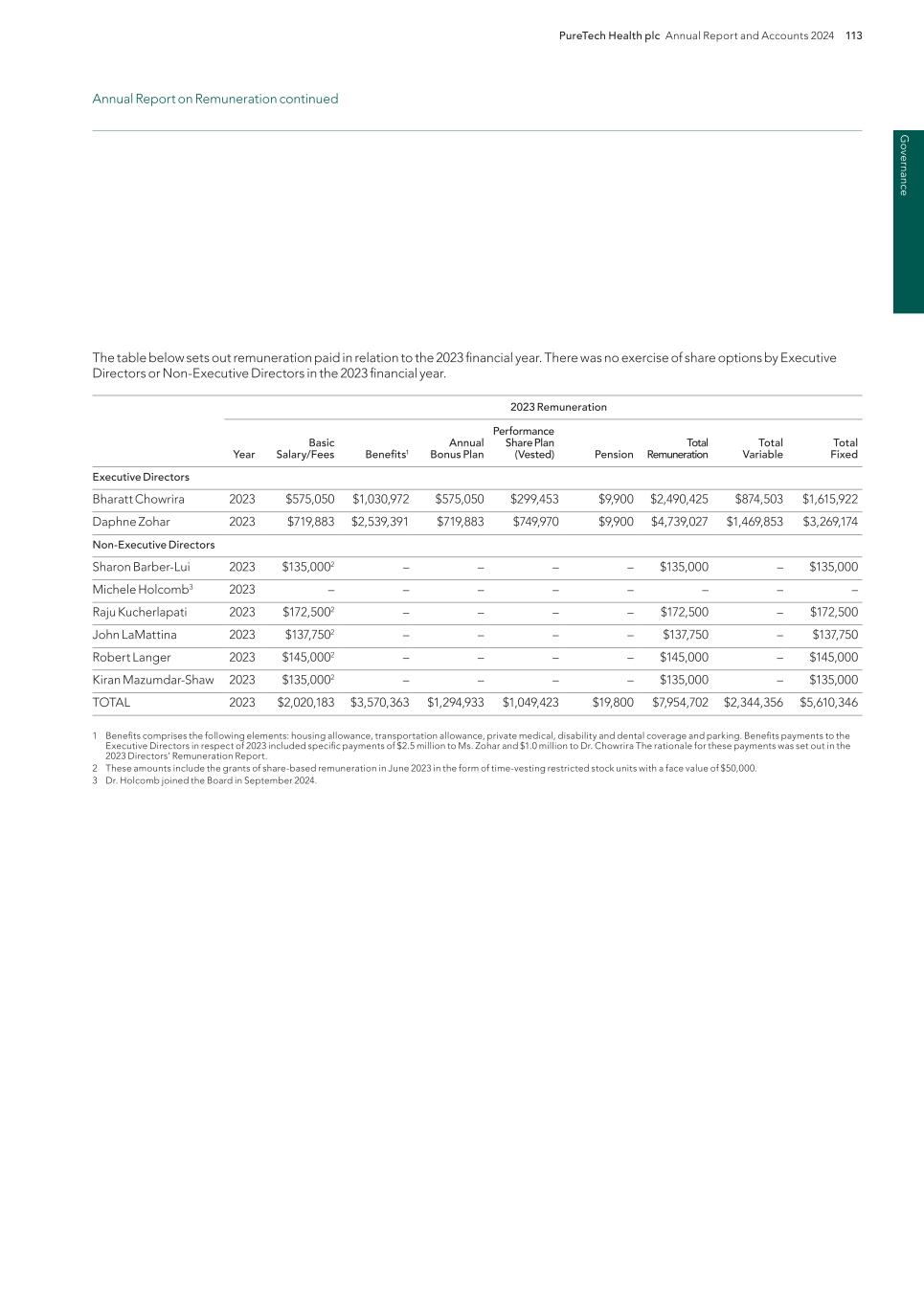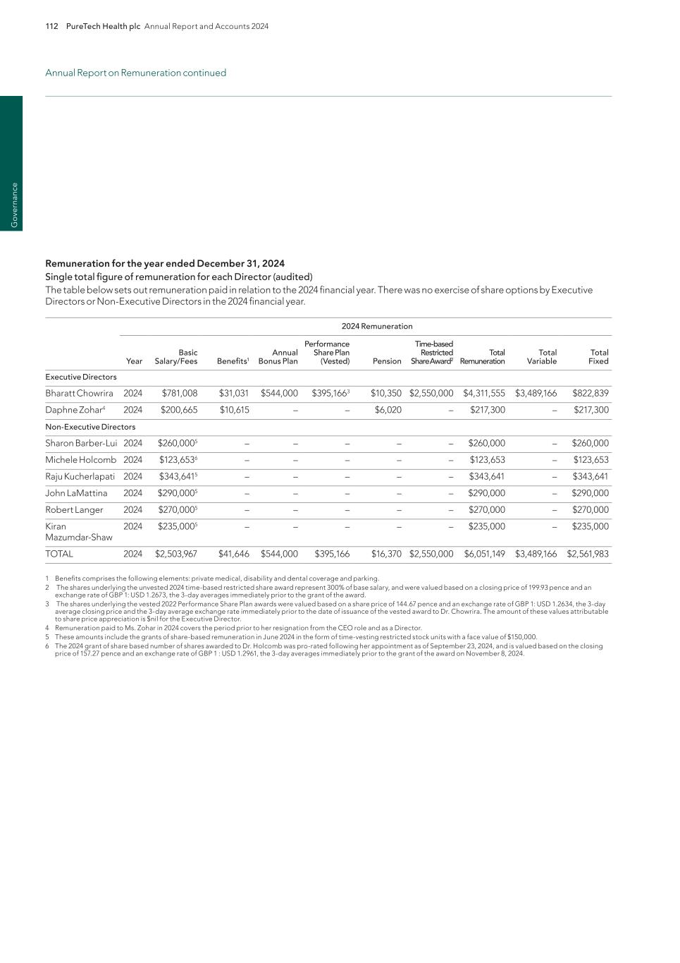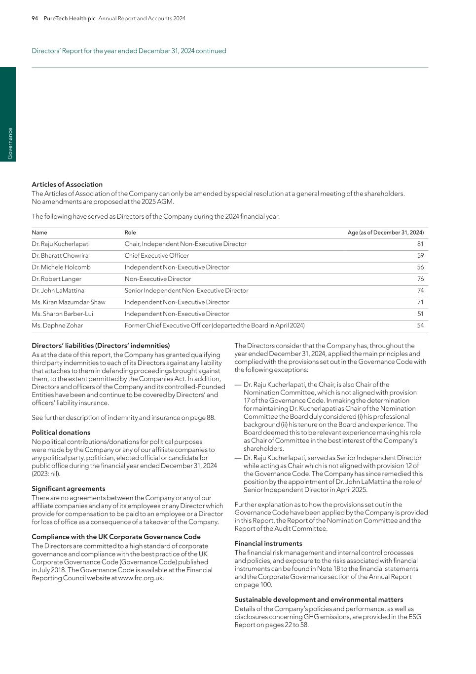 94  PureTech Health plc Annual Report and Accounts 2024 G ov er na nc e Articles of Association The Articles of Association of the Company can only be amended by special resolution at a general meeting of the shareholders.  No amendments are proposed at the 2025 AGM. The following have served as Directors of the Company during the 2024 financial year. Name Role Age (as of December 31, 2024) Dr. Raju Kucherlapati Chair, Independent Non-Executive Director 81 Dr. Bharatt Chowrira Chief Executive Officer 59 Dr. Michele Holcomb Independent Non-Executive Director 56 Dr. Robert Langer Non-Executive Director 76 Dr. John LaMattina Senior Independent Non-Executive Director 74 Ms. Kiran Mazumdar-Shaw Independent Non-Executive Director 71 Ms. Sharon Barber-Lui Independent Non-Executive Director 51 Ms. Daphne Zohar Former Chief Executive Officer (departed the Board in April 2024) 54 The Directors consider that the Company has, throughout the  year ended December 31, 2024, applied the main principles and  complied with the provisions set out in the Governance Code with  the following exceptions:  — Dr. Raju Kucherlapati, the Chair, is also Chair of the  Nomination Committee, which is not aligned with provision  17 of the Governance Code. In making the determination  for maintaining Dr. Kucherlapati as Chair of the Nomination  Committee the Board duly considered (i) his professional  background (ii) his tenure on the Board and experience. The  Board deemed this to be relevant experience making his role  as Chair of Committee in the best interest of the Company’s  shareholders.   — Dr. Raju Kucherlapati, served as Senior Independent Director  while acting as Chair which is not aligned with provision 12 of  the Governance Code. The Company has since remedied this  position by the appointment of Dr. John LaMattina the role of  Senior Independent Director in April 2025. Further explanation as to how the provisions set out in the  Governance Code have been applied by the Company is provided  in this Report, the Report of the Nomination Committee and the  Report of the Audit Committee. Financial instruments The financial risk management and internal control processes  and policies, and exposure to the risks associated with financial  instruments can be found in Note 18 to the financial statements  and the Corporate Governance section of the Annual Report  on page 100. Sustainable development and environmental matters Details of the Company’s policies and performance, as well as  disclosures concerning GHG emissions, are provided in the ESG  Report on pages 22 to 58. Directors’ liabilities (Directors’ indemnities) As at the date of this report, the Company has granted qualifying  third party indemnities to each of its Directors against any liability  that attaches to them in defending proceedings brought against  them, to the extent permitted by the Companies Act. In addition,  Directors and officers of the Company and its controlled-Founded  Entities have been and continue to be covered by Directors’ and  officers’ liability insurance. See further description of indemnity and insurance on page 88. Political donations No political contributions/donations for political purposes  were made by the Company or any of our affiliate companies to  any political party, politician, elected official or candidate for  public office during the financial year ended December 31, 2024  (2023: nil). Significant agreements There are no agreements between the Company or any of our  affiliate companies and any of its employees or any Director which  provide for compensation to be paid to an employee or a Director  for loss of office as a consequence of a takeover of the Company. Compliance with the UK Corporate Governance Code The Directors are committed to a high standard of corporate  governance and compliance with the best practice of the UK  Corporate Governance Code (Governance Code) published  in July 2018. The Governance Code is available at the Financial  Reporting Council website at www.frc.org.uk. Directors’ Report for the year ended December 31, 2024 continued