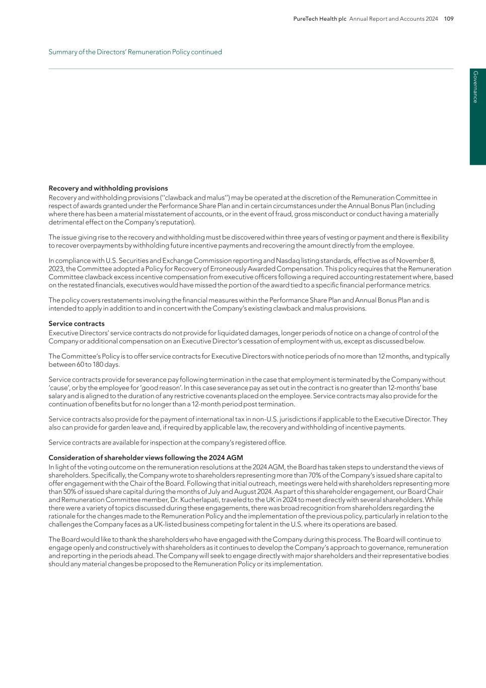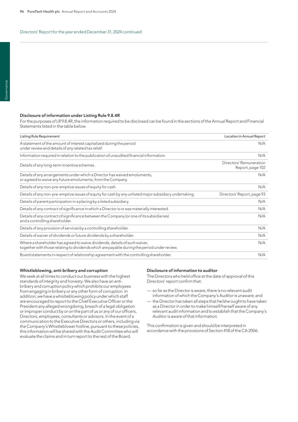 96  PureTech Health plc Annual Report and Accounts 2024 G ov er na nc e Disclosure of information under Listing Rule 9.8.4R For the purposes of LR 9.8.4R, the information required to be disclosed can be found in the sections of the Annual Report and Financial  Statements listed in the table below. Listing Rule Requirement Location in Annual Report  A statement of the amount of interest capitalized during the period   under review and details of any related tax relief. N/A Information required in relation to the publication of unaudited financial information. N/A Details of any long-term incentive schemes. Directors’ Remuneration  Report, page 102 Details of any arrangements under which a Director has waived emoluments,   or agreed to waive any future emoluments, from the Company. N/A Details of any non-pre-emptive issues of equity for cash. N/A Details of any non-pre-emptive issues of equity for cash by any unlisted major subsidiary undertaking. Directors’ Report, page 93 Details of parent participation in a placing by a listed subsidiary. N/A Details of any contract of significance in which a Director is or was materially interested. N/A Details of any contract of significance between the Company (or one of its subsidiaries)   and a controlling shareholder. N/A Details of any provision of services by a controlling shareholder. N/A  Details of waiver of dividends or future dividends by a shareholder. N/A Where a shareholder has agreed to waive dividends, details of such waiver,   together with those relating to dividends which are payable during the period under review. N/A Board statements in respect of relationship agreement with the controlling shareholder. N/A Disclosure of information to auditor The Directors who held office at the date of approval of this  Directors’ report confirm that:  — so far as the Director is aware, there is no relevant audit  information of which the Company’s Auditor is unaware; and  — the Director has taken all steps that he/she ought to have taken  as a Director in order to make himself/herself aware of any  relevant audit information and to establish that the Company’s  Auditor is aware of that information. This confirmation is given and should be interpreted in  accordance with the provisions of Section 418 of the CA 2006. Whistleblowing, anti-bribery and corruption We seek at all times to conduct our business with the highest  standards of integrity and honesty. We also have an anti- bribery and corruption policy which prohibits our employees  from engaging in bribery or any other form of corruption. In  addition, we have a whistleblowing policy under which staff  are encouraged to report to the Chief Executive Officer or the  President any alleged wrongdoing, breach of a legal obligation  or improper conduct by or on the part of us or any of our officers,  Directors, employees, consultants or advisors. In the event of a  communication to the Executive Directors or others, including via  the Company’s Whistleblower hotline, pursuant to these policies,  this information will be shared with the Audit Committee who will  evaluate the claims and in turn report to the rest of the Board.  Directors’ Report for the year ended December 31, 2024 continued