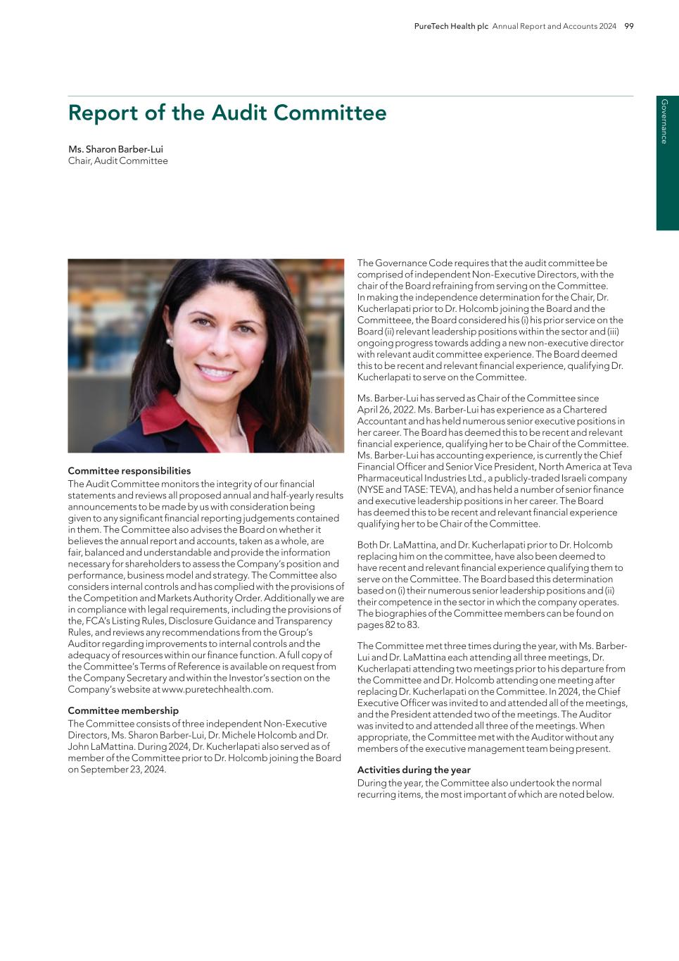 82  PureTech Health plc Annual Report and Accounts 2024 G ov er na nc e Sharon Barber-Lui Independent Non-Executive  Director, Transaction  Committee Member Michele Holcomb, Ph.D. Independent Non-Executive  Director , Transaction  Committee Member Sharon Barber-Lui has served as a  member of our Board since March  2022 and became the Chair of the  Audit Committee in April 2022.  Ms. Barber-Lui has been the Chief  Financial Officer and Senior Vice  President, North America at Teva  Pharmaceutical Industries Ltd. since  July 2023. Prior to joining Teva,  Ms. Barber-Lui worked as Senior  Vice President of Global Finance  at EQRx and at Merck for over  twenty years in roles of advancing  responsibility, including most  recently as the Head of Portfolio  Market Strategy, Operations and  Business Analytics from 2019  through 2021 and Chief Financial  Officer from 2014 through 2018 for  Merck’s U.S. oncology business.  Prior to that Ms. Barber-Lui held  a number of other roles with  Merck including Treasurer of U.S.  Region, Head of U.S. Treasury  Operations, and Head of Legal  Entity Integration and Global  Treasury Services, among others.  Ms. Barber-Lui began her career  as an accountant for KPMG LLP,  and she received her bachelor’s  degree as well as her M.B.A. from  Lehigh University. Ms. Barber-Lui is  a member of the American Institute  of Certified Public Accountants.  She is also the recipient of Merck &  Co. Inc.’s Top Talent Designation,  Women’s Leadership Recognition  and Oncology Women’s  Leader Recognition. Michele Holcomb, Ph.D. has  served as a member of our Board  since September 2024 and is a  member of the Audit Committee  and Transaction Committee.  Dr. Holcomb is also a member of  the board of directors and chair of  the Nominating and ESG (NESG)  committee of Kimball Electronics  Inc (Nasdaq: KE). Dr. Holcomb  previously worked as Executive  Vice President, Chief Strategy  and Business Development  Officer at Cardinal Health from  January 2017 until September  2022. Prior to joining Cardinal  Health, Dr. Holcomb was the Chief  Operating Officer of Global R&D  and SVP of Strategy, Portfolio,  Search and Partnerships at Teva  Pharmaceuticals. She also spent  15 years at McKinsey & Company  and was a Partner of the Global  Pharmaceutical Practice. She also  serves on the board of the Abigail  Wexner Research Institute at  Nationwide Children’s Hospital  in Columbus, the BalletMet of  Columbus, where she chairs the  long-range planning committee  and the Liberty Science Center in  New Jersey. Dr. Holcomb received  a B.S. in chemistry from Stanford  University and a Ph.D. in chemistry  from the University of California,  Berkeley, and previously worked  as an R&D chemist at Ciba-Geigy  and Syntex Pharmaceuticals.  Dr. Holcomb is also a member of  the editorial advisory board of  Pharmaceutical Executive and has  lectured on healthcare strategy at  Kellogg (Northwestern), Columbia  and Fuqua (Duke) business schools. PureTech Health is  led by a seasoned  and accomplished  Board of Directors and  management team with  extensive experience  in maximising  shareholder value,  discovering scientific  breakthroughs, and  delivering therapeutics  to market. Board of Directors (alphabetically)* * The biography for executive director  Bharatt Chowrira can be found on  page 85.