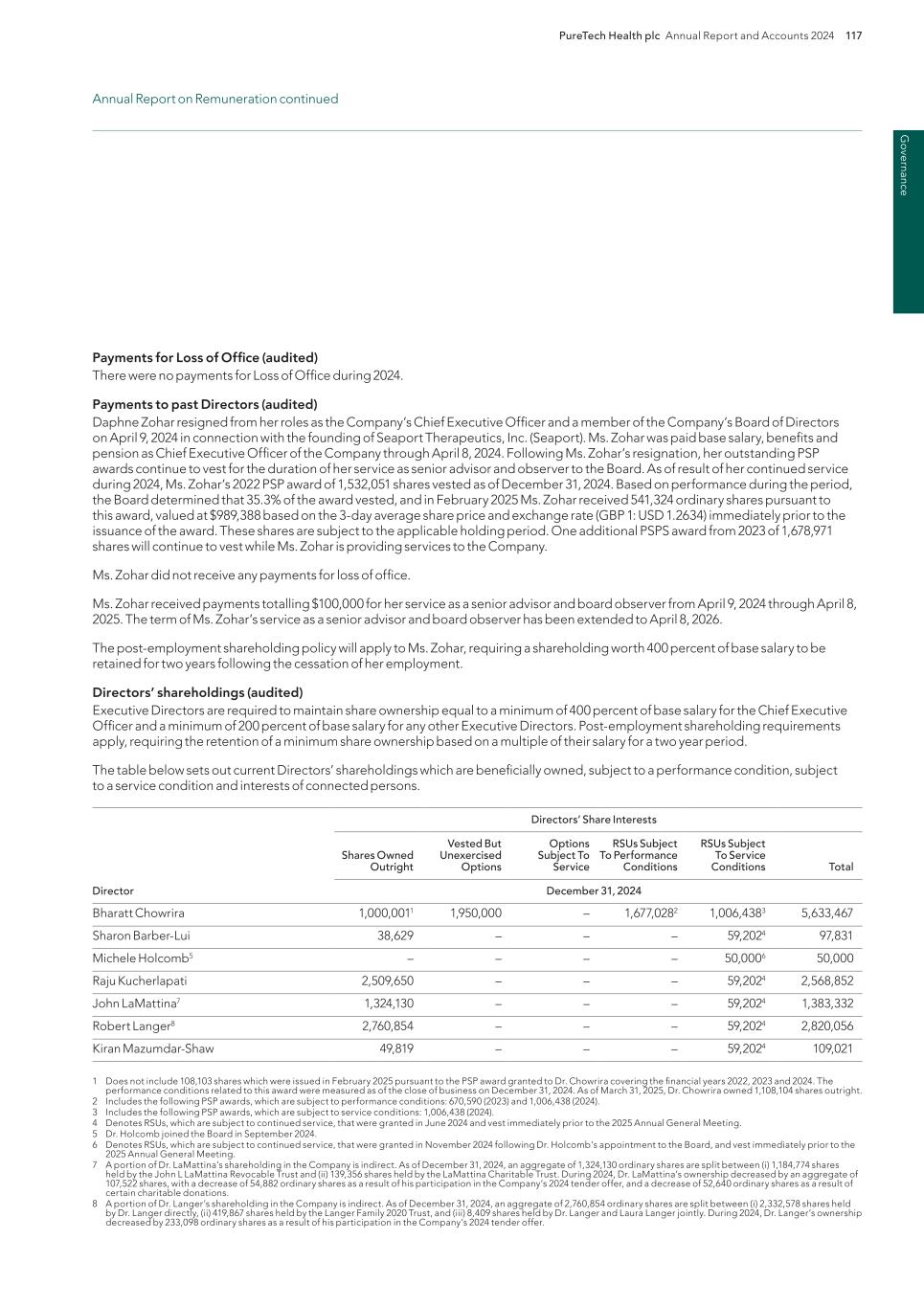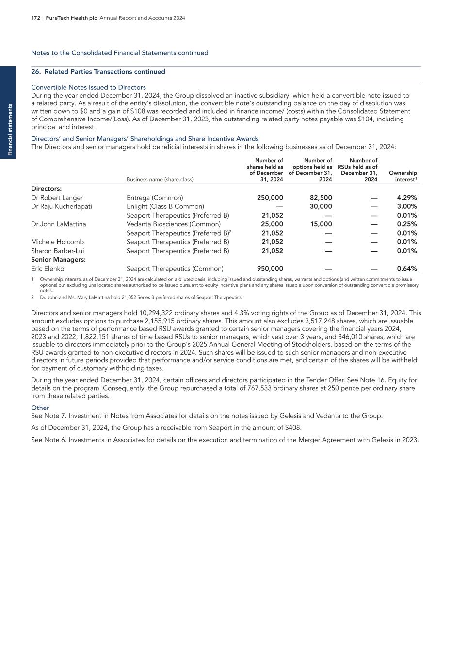 Fi na nc ia l s ta te m en ts 172  PureTech Health plc Annual Report and Accounts 2024 Notes to the Consolidated Financial Statements continued Convertible Notes Issued to Directors During the year ended December 31, 2024, the Group dissolved an inactive subsidiary, which held a convertible note issued to  a related party. As a result of the entity's dissolution, the convertible note's outstanding balance on the day of dissolution was  written down to $0 and a gain of $108 was recorded and included in finance income/ (costs) within the Consolidated Statement  of Comprehensive Income/(Loss). As of December 31, 2023, the outstanding related party notes payable was $104, including  principal and interest.  Directors’ and Senior Managers’ Shareholdings and Share Incentive Awards The Directors and senior managers hold beneficial interests in shares in the following businesses as of December 31, 2024: Business name (share class) Number of  shares held as  of December  31, 2024 Number of  options held as  of December 31,  2024 Number of  RSUs held as of  December 31,  2024 Ownership interest¹ Directors: Dr Robert Langer Entrega (Common) 250,000 82,500 — 4.29% Dr Raju Kucherlapati Enlight (Class B Common) — 30,000 — 3.00% Seaport Therapeutics (Preferred B) 21,052 — — 0.01% Dr John LaMattina Vedanta Biosciences (Common) 25,000 15,000 — 0.25% Seaport Therapeutics (Preferred B)2 21,052 — — 0.01% Michele Holcomb Seaport Therapeutics (Preferred B) 21,052 — — 0.01% Sharon Barber-Lui Seaport Therapeutics (Preferred B) 21,052 — — 0.01% Senior Managers: Eric Elenko Seaport Therapeutics (Common) 950,000 — — 0.64% 1 Ownership interests as of December 31, 2024 are calculated on a diluted basis, including issued and outstanding shares, warrants and options (and written commitments to issue  options) but excluding unallocated shares authorized to be issued pursuant to equity incentive plans and any shares issuable upon conversion of outstanding convertible promissory  notes. 2 Dr. John and Ms. Mary LaMattina hold 21,052 Series B preferred shares of Seaport Therapeutics. Directors and senior managers hold 10,294,322 ordinary shares and 4.3% voting rights of the Group as of December 31, 2024. This  amount excludes options to purchase 2,155,915 ordinary shares. This amount also excludes 3,517,248 shares, which are issuable  based on the terms of performance based RSU awards granted to certain senior managers covering the financial years 2024,  2023 and 2022, 1,822,151 shares of time based RSUs to senior managers, which vest over 3 years, and 346,010 shares, which are  issuable to directors immediately prior to the Group's 2025 Annual General Meeting of Stockholders, based on the terms of the  RSU awards granted to non-executive directors in 2024. Such shares will be issued to such senior managers and non-executive  directors in future periods provided that performance and/or service conditions are met, and certain of the shares will be withheld  for payment of customary withholding taxes. During the year ended December 31, 2024, certain officers and directors participated in the Tender Offer. See Note 16. Equity for  details on the program. Consequently, the Group repurchased a total of 767,533 ordinary shares at 250 pence per ordinary share  from these related parties. Other See Note 7. Investment in Notes from Associates for details on the notes issued by Gelesis and Vedanta to the Group.  As of December 31, 2024, the Group has a receivable from Seaport in the amount of $408. See Note 6. Investments in Associates for details on the execution and termination of the Merger Agreement with Gelesis in 2023. 26. Related Parties Transactions continued
