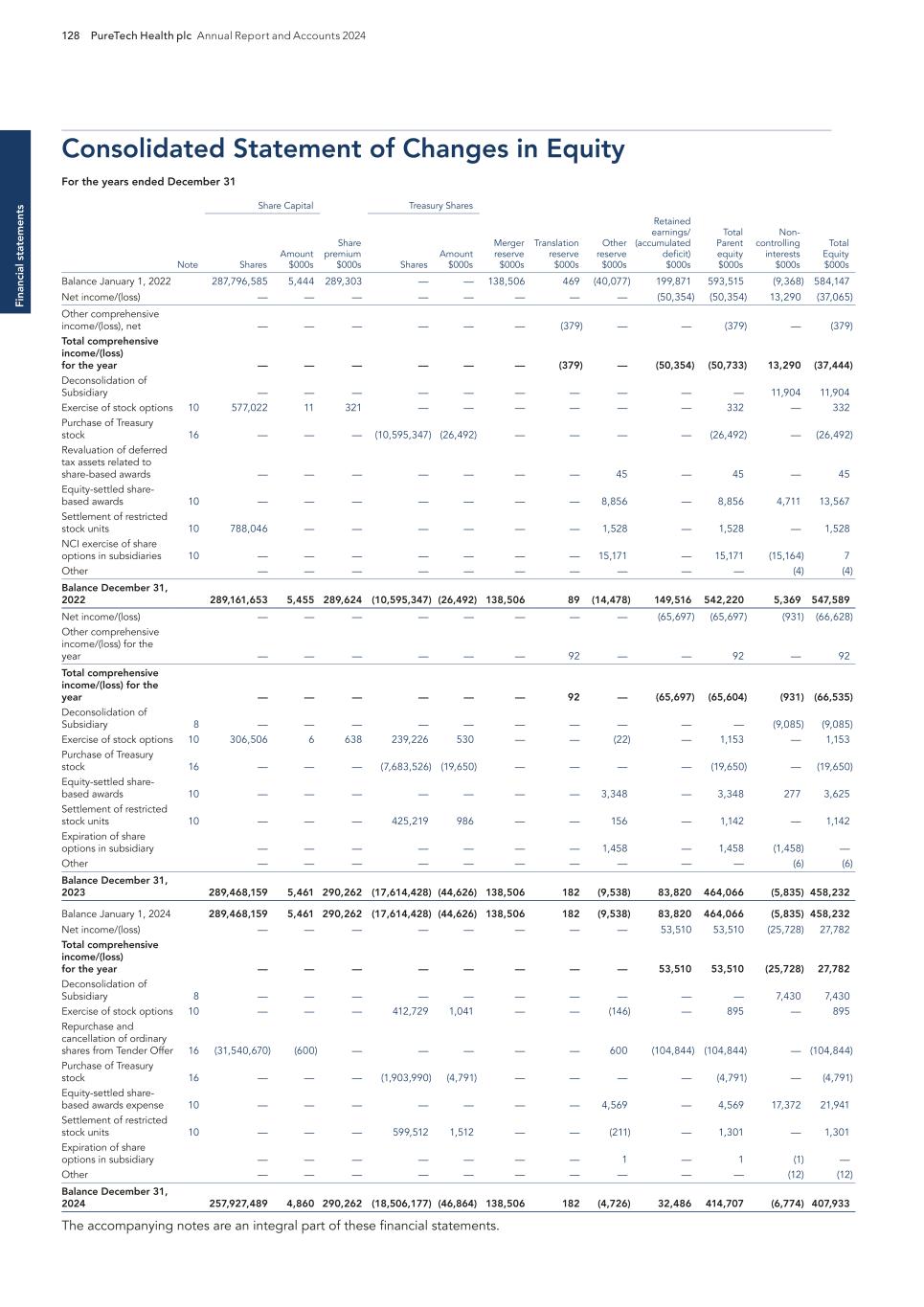 Fi na nc ia l s ta te m en ts 128  PureTech Health plc Annual Report and Accounts 2024 Consolidated Statement of Changes in Equity  For the years ended December 31 Share Capital Treasury Shares Note Shares Amount  $000s Share  premium  $000s Shares Amount  $000s Merger  reserve  $000s Translation  reserve $000s Other  reserve  $000s Retained  earnings/  (accumulated  deficit) $000s Total  Parent  equity $000s Non- controlling  interests  $000s Total Equity  $000s Balance January 1, 2022 287,796,585 5,444 289,303 — — 138,506 469 (40,077) 199,871 593,515 (9,368) 584,147 Net income/(loss) — — — — — — — — (50,354) (50,354) 13,290 (37,065) Other comprehensive  income/(loss), net — — — — — — (379) — — (379) — (379) Total comprehensive  income/(loss)  for the year — — — — — — (379) — (50,354) (50,733) 13,290 (37,444) Deconsolidation of  Subsidiary — — — — — — — — — — 11,904 11,904 Exercise of stock options 10 577,022 11 321 — — — — — — 332 — 332 Purchase of Treasury  stock 16 — — — (10,595,347) (26,492) — — — — (26,492) — (26,492) Revaluation of deferred  tax assets related to  share-based awards — — — — — — — 45 — 45 — 45 Equity-settled share- based awards 10 — — — — — — — 8,856 — 8,856 4,711 13,567 Settlement of restricted  stock units 10 788,046 — — — — — — 1,528 — 1,528 — 1,528 NCI exercise of share  options in subsidiaries 10 — — — — — — — 15,171 — 15,171 (15,164) 7 Other — — — — — — — — — — (4) (4) Balance December 31,  2022 289,161,653 5,455 289,624 (10,595,347) (26,492) 138,506 89 (14,478) 149,516 542,220 5,369 547,589 Net income/(loss) — — — — — — — — (65,697) (65,697) (931) (66,628) Other comprehensive  income/(loss) for the  year — — — — — — 92 — — 92 — 92 Total comprehensive  income/(loss) for the  year — — — — — — 92 — (65,697) (65,604) (931) (66,535) Deconsolidation of  Subsidiary 8 — — — — — — — — — — (9,085) (9,085) Exercise of stock options 10 306,506 6 638 239,226 530 — — (22) — 1,153 — 1,153 Purchase of Treasury  stock 16 — — — (7,683,526) (19,650) — — — — (19,650) — (19,650) Equity-settled share- based awards 10 — — — — — — — 3,348 — 3,348 277 3,625 Settlement of restricted  stock units 10 — — — 425,219 986 — — 156 — 1,142 — 1,142 Expiration of share  options in subsidiary — — — — — — — 1,458 — 1,458 (1,458) — Other — — — — — — — — — — (6) (6) Balance December 31,  2023 289,468,159 5,461 290,262 (17,614,428) (44,626) 138,506 182 (9,538) 83,820 464,066 (5,835) 458,232 Balance January 1, 2024 289,468,159 5,461 290,262 (17,614,428) (44,626) 138,506 182 (9,538) 83,820 464,066 (5,835) 458,232 Net income/(loss) — — — — — — — — 53,510 53,510 (25,728) 27,782 Total comprehensive  income/(loss)  for the year — — — — — — — — 53,510 53,510 (25,728) 27,782 Deconsolidation of  Subsidiary 8 — — — — — — — — — — 7,430 7,430 Exercise of stock options 10 — — — 412,729 1,041 — — (146) — 895 — 895 Repurchase and  cancellation of ordinary  shares from Tender Offer 16 (31,540,670) (600) — — — — — 600 (104,844) (104,844) — (104,844) Purchase of Treasury  stock 16 — — — (1,903,990) (4,791) — — — — (4,791) — (4,791) Equity-settled share- based awards expense 10 — — — — — — — 4,569 — 4,569 17,372 21,941 Settlement of restricted  stock units 10 — — — 599,512 1,512 — — (211) — 1,301 — 1,301 Expiration of share  options in subsidiary — — — — — — — 1 — 1 (1) — Other — — — — — — — — — — (12) (12) Balance December 31,  2024 257,927,489 4,860 290,262 (18,506,177) (46,864) 138,506 182 (4,726) 32,486 414,707 (6,774) 407,933 The accompanying notes are an integral part of these financial statements.