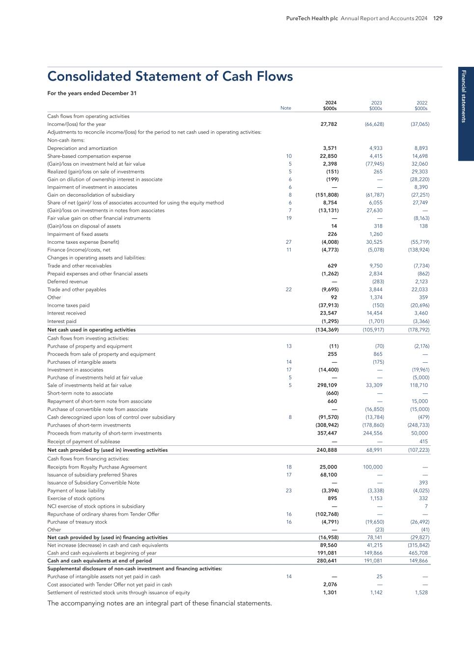 Financial statem ents PureTech Health plc Annual Report and Accounts 2024  129 Consolidated Statement of Cash Flows  For the years ended December 31 Note 2024 $000s 2023 $000s 2022 $000s Cash flows from operating activities    Income/(loss) for the year  27,782 (66,628) (37,065) Adjustments to reconcile income/(loss) for the period to net cash used in operating activities:   Non-cash items:   Depreciation and amortization 3,571 4,933 8,893 Share-based compensation expense 10 22,850 4,415 14,698 (Gain)/loss on investment held at fair value 5 2,398 (77,945) 32,060 Realized (gain)/loss on sale of investments 5 (151) 265 29,303 Gain on dilution of ownership interest in associate 6 (199) — (28,220) Impairment of investment in associates 6 — — 8,390 Gain on deconsolidation of subsidiary 8 (151,808) (61,787) (27,251) Share of net (gain)/ loss of associates accounted for using the equity method 6 8,754 6,055 27,749 (Gain)/loss on investments in notes from associates 7 (13,131) 27,630 — Fair value gain on other financial instruments 19 — — (8,163) (Gain)/loss on disposal of assets 14 318 138 Impairment of fixed assets 226 1,260 Income taxes expense (benefit) 27 (4,008) 30,525 (55,719) Finance (income)/costs, net 11 (4,773) (5,078) (138,924) Changes in operating assets and liabilities:   Trade and other receivables 629 9,750 (7,734) Prepaid expenses and other financial assets  (1,262) 2,834 (862) Deferred revenue — (283) 2,123 Trade and other payables 22 (9,695) 3,844 22,033 Other 92 1,374 359 Income taxes paid  (37,913) (150) (20,696) Interest received  23,547 14,454 3,460 Interest paid (1,295) (1,701) (3,366) Net cash used in operating activities (134,369) (105,917) (178,792) Cash flows from investing activities:   Purchase of property and equipment 13 (11) (70) (2,176) Proceeds from sale of property and equipment 255 865 — Purchases of intangible assets 14 — (175) — Investment in associates 17 (14,400) — (19,961) Purchase of investments held at fair value 5 — — (5,000) Sale of investments held at fair value 5 298,109 33,309 118,710 Short-term note to associate (660) — — Repayment of short-term note from associate 660 — 15,000 Purchase of convertible note from associate — (16,850) (15,000) Cash derecognized upon loss of control over subsidiary 8 (91,570) (13,784) (479) Purchases of short-term investments (308,942) (178,860) (248,733) Proceeds from maturity of short-term investments 357,447 244,556 50,000 Receipt of payment of sublease — — 415 Net cash provided by (used in) investing activities  240,888 68,991 (107,223) Cash flows from financing activities:   Receipts from Royalty Purchase Agreement 18 25,000 100,000 — Issuance of subsidiary preferred Shares 17 68,100 — — Issuance of Subsidiary Convertible Note — — 393 Payment of lease liability 23 (3,394) (3,338) (4,025) Exercise of stock options  895 1,153 332 NCI exercise of stock options in subsidiary — — 7 Repurchase of ordinary shares from Tender Offer 16 (102,768) — — Purchase of treasury stock 16 (4,791) (19,650) (26,492) Other  — (23) (41) Net cash provided by (used in) financing activities  (16,958) 78,141 (29,827) Net increase (decrease) in cash and cash equivalents  89,560 41,215 (315,842) Cash and cash equivalents at beginning of year  191,081 149,866 465,708 Cash and cash equivalents at end of period  280,641 191,081 149,866 Supplemental disclosure of non-cash investment and financing activities:   Purchase of intangible assets not yet paid in cash 14 — 25 — Cost associated with Tender Offer not yet paid in cash 2,076 — — Settlement of restricted stock units through issuance of equity 1,301 1,142 1,528 The accompanying notes are an integral part of these financial statements.
