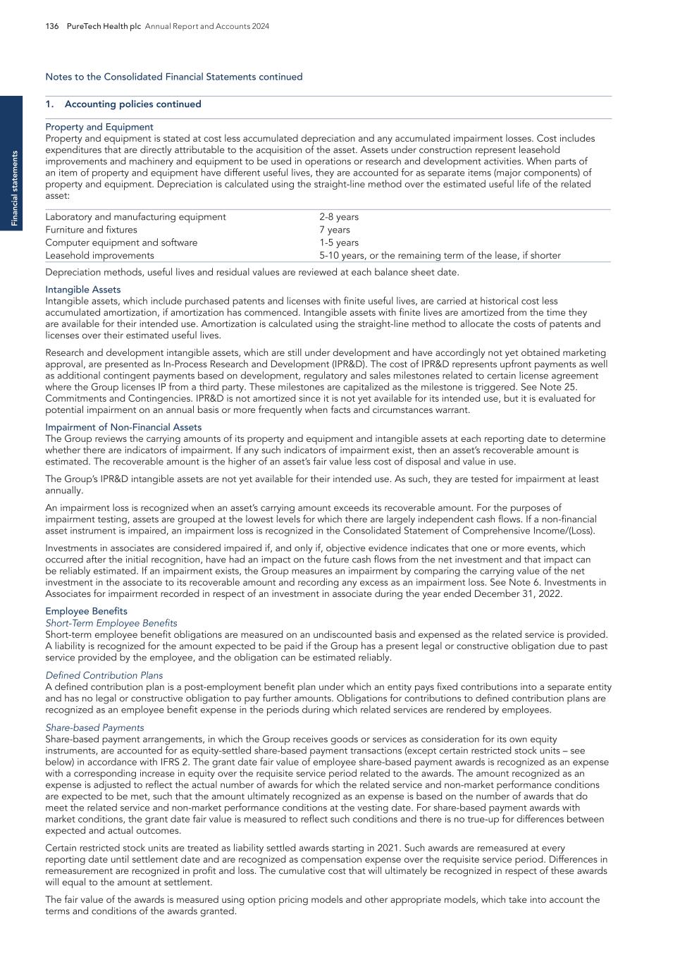 Fi na nc ia l s ta te m en ts 136  PureTech Health plc Annual Report and Accounts 2024 1.  Accounting policies continued Notes to the Consolidated Financial Statements continued Property and Equipment  Property and equipment is stated at cost less accumulated depreciation and any accumulated impairment losses. Cost includes  expenditures that are directly attributable to the acquisition of the asset. Assets under construction represent leasehold  improvements and machinery and equipment to be used in operations or research and development activities. When parts of  an item of property and equipment have different useful lives, they are accounted for as separate items (major components) of  property and equipment. Depreciation is calculated using the straight-line method over the estimated useful life of the related  asset:  Laboratory and manufacturing equipment 2-8 years Furniture and fixtures 7 years Computer equipment and software 1-5 years Leasehold improvements 5-10 years, or the remaining term of the lease, if shorter Depreciation methods, useful lives and residual values are reviewed at each balance sheet date. Intangible Assets  Intangible assets, which include purchased patents and licenses with finite useful lives, are carried at historical cost less  accumulated amortization, if amortization has commenced. Intangible assets with finite lives are amortized from the time they  are available for their intended use. Amortization is calculated using the straight-line method to allocate the costs of patents and  licenses over their estimated useful lives.  Research and development intangible assets, which are still under development and have accordingly not yet obtained marketing  approval, are presented as In-Process Research and Development (IPR&D). The cost of IPR&D represents upfront payments as well  as additional contingent payments based on development, regulatory and sales milestones related to certain license agreement  where the Group licenses IP from a third party. These milestones are capitalized as the milestone is triggered. See Note 25.  Commitments and Contingencies. IPR&D is not amortized since it is not yet available for its intended use, but it is evaluated for  potential impairment on an annual basis or more frequently when facts and circumstances warrant. Impairment of Non-Financial Assets  The Group reviews the carrying amounts of its property and equipment and intangible assets at each reporting date to determine  whether there are indicators of impairment. If any such indicators of impairment exist, then an asset’s recoverable amount is  estimated. The recoverable amount is the higher of an asset’s fair value less cost of disposal and value in use. The Group’s IPR&D intangible assets are not yet available for their intended use. As such, they are tested for impairment at least  annually.  An impairment loss is recognized when an asset’s carrying amount exceeds its recoverable amount. For the purposes of  impairment testing, assets are grouped at the lowest levels for which there are largely independent cash flows. If a non-financial  asset instrument is impaired, an impairment loss is recognized in the Consolidated Statement of Comprehensive Income/(Loss). Investments in associates are considered impaired if, and only if, objective evidence indicates that one or more events, which  occurred after the initial recognition, have had an impact on the future cash flows from the net investment and that impact can  be reliably estimated. If an impairment exists, the Group measures an impairment by comparing the carrying value of the net  investment in the associate to its recoverable amount and recording any excess as an impairment loss. See Note 6. Investments in  Associates for impairment recorded in respect of an investment in associate during the year ended December 31, 2022. Employee Benefits  Short-Term Employee Benefits  Short-term employee benefit obligations are measured on an undiscounted basis and expensed as the related service is provided.  A liability is recognized for the amount expected to be paid if the Group has a present legal or constructive obligation due to past  service provided by the employee, and the obligation can be estimated reliably. Defined Contribution Plans  A defined contribution plan is a post-employment benefit plan under which an entity pays fixed contributions into a separate entity  and has no legal or constructive obligation to pay further amounts. Obligations for contributions to defined contribution plans are  recognized as an employee benefit expense in the periods during which related services are rendered by employees.  Share-based Payments  Share-based payment arrangements, in which the Group receives goods or services as consideration for its own equity  instruments, are accounted for as equity-settled share-based payment transactions (except certain restricted stock units – see  below) in accordance with IFRS 2. The grant date fair value of employee share-based payment awards is recognized as an expense  with a corresponding increase in equity over the requisite service period related to the awards. The amount recognized as an  expense is adjusted to reflect the actual number of awards for which the related service and non-market performance conditions  are expected to be met, such that the amount ultimately recognized as an expense is based on the number of awards that do  meet the related service and non-market performance conditions at the vesting date. For share-based payment awards with  market conditions, the grant date fair value is measured to reflect such conditions and there is no true-up for differences between  expected and actual outcomes. Certain restricted stock units are treated as liability settled awards starting in 2021. Such awards are remeasured at every  reporting date until settlement date and are recognized as compensation expense over the requisite service period. Differences in  reme
