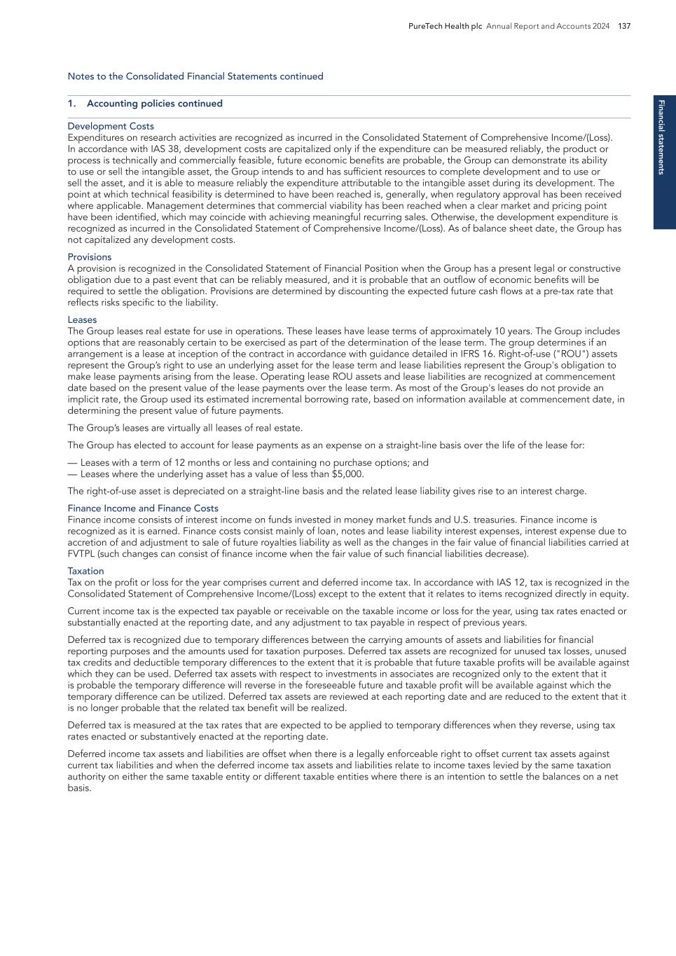 Financial statem ents PureTech Health plc Annual Report and Accounts 2024  137 1.  Accounting policies continued Notes to the Consolidated Financial Statements continued Development Costs  Expenditures on research activities are recognized as incurred in the Consolidated Statement of Comprehensive Income/(Loss).  In accordance with IAS 38, development costs are capitalized only if the expenditure can be measured reliably, the product or  process is technically and commercially feasible, future economic benefits are probable, the Group can demonstrate its ability  to use or sell the intangible asset, the Group intends to and has sufficient resources to complete development and to use or  sell the asset, and it is able to measure reliably the expenditure attributable to the intangible asset during its development. The  point at which technical feasibility is determined to have been reached is, generally, when regulatory approval has been received  where applicable. Management determines that commercial viability has been reached when a clear market and pricing point  have been identified, which may coincide with achieving meaningful recurring sales. Otherwise, the development expenditure is  recognized as incurred in the Consolidated Statement of Comprehensive Income/(Loss). As of balance sheet date, the Group has  not capitalized any development costs. Provisions  A provision is recognized in the Consolidated Statement of Financial Position when the Group has a present legal or constructive  obligation due to a past event that can be reliably measured, and it is probable that an outflow of economic benefits will be  required to settle the obligation. Provisions are determined by discounting the expected future cash flows at a pre-tax rate that  reflects risks specific to the liability. Leases The Group leases real estate for use in operations. These leases have lease terms of approximately 10 years. The Group includes  options that are reasonably certain to be exercised as part of the determination of the lease term. The group determines if an  arrangement is a lease at inception of the contract in accordance with guidance detailed in IFRS 16. Right-of-use ("ROU") assets  represent the Group’s right to use an underlying asset for the lease term and lease liabilities represent the Group's obligation to  make lease payments arising from the lease. Operating lease ROU assets and lease liabilities are recognized at commencement  date based on the present value of the lease payments over the lease term. As most of the Group's leases do not provide an  implicit rate, the Group used its estimated incremental borrowing rate, based on information available at commencement date, in  determining the present value of future payments.  The Group’s leases are virtually all leases of real estate. The Group has elected to account for lease payments as an expense on a straight-line basis over the life of the lease for:   — Leases with a term of 12 months or less and containing no purchase options; and   — Leases where the underlying asset has a value of less than $5,000.  The right-of-use asset is depreciated on a straight-line basis and the related lease liability gives rise to an interest charge.  Finance Income and Finance Costs  Finance income consists of interest income on funds invested in money market funds and U.S. treasuries. Finance income is  recognized as it is earned. Finance costs consist mainly of loan, notes and lease liability interest expenses, interest expense due to  accretion of and adjustment to sale of future royalties liability as well as the changes in the fair value of financial liabilities carried at  FVTPL (such changes can consist of finance income when the fair value of such financial liabilities decrease). Taxation  Tax on the profit or loss for the year comprises current and deferred income tax. In accordance with IAS 12, tax is recognized in the  Consolidated Statement of Comprehensive Income/(Loss) except to the extent that it relates to items recognized directly in equity. Current income tax is the expected tax payable or receivable on the taxable income or loss for the year, using tax rates enacted or  substantially enacted at the reporting date, and any adjustment to tax payable in respect of previous years. Deferred tax is recognized due to temporary differences between the carrying amounts of assets and liabilities for financial  reporting purposes and the amounts used for taxation purposes. Deferred tax assets are recognized for unused tax losses, unused  tax credits and deductible temporary differences to the extent that it is probable that future taxable profits will be available against  which they can be used. Deferred tax assets with respect to investments in associates are recognized only to the extent that it  is probable the temporary difference will reverse in the foreseeable future and taxable profit will be available against which the  temporary difference can be utilized. Deferred tax assets are reviewed at each reporting date and are reduced to the extent that it  is no longer probable that the related tax benefit will be realized. Deferred tax is measured at the tax rates that are expected to be applied to temporary differences when they reverse, using tax  rates enacted or substantively enacted at the reporting date. Deferred income tax assets and liabilities are offset when there is a legally enforceable right to offset current tax assets against  current tax liabilities and when the deferred income tax assets and liabilities relate to income taxes levied by the same taxation  authority on either the same taxable entity or different taxable entities where there is an intention to settle the balances on a net  basis.
