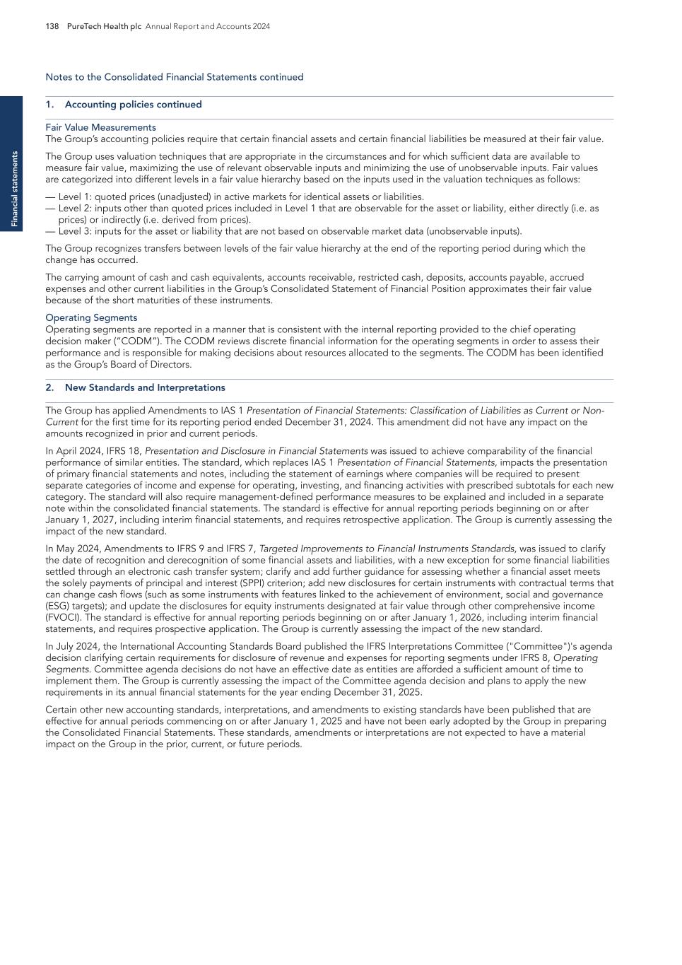 Fi na nc ia l s ta te m en ts 138  PureTech Health plc Annual Report and Accounts 2024 1.  Accounting policies continued Notes to the Consolidated Financial Statements continued Fair Value Measurements  The Group’s accounting policies require that certain financial assets and certain financial liabilities be measured at their fair value. The Group uses valuation techniques that are appropriate in the circumstances and for which sufficient data are available to  measure fair value, maximizing the use of relevant observable inputs and minimizing the use of unobservable inputs. Fair values  are categorized into different levels in a fair value hierarchy based on the inputs used in the valuation techniques as follows:  — Level 1: quoted prices (unadjusted) in active markets for identical assets or liabilities.  — Level 2: inputs other than quoted prices included in Level 1 that are observable for the asset or liability, either directly (i.e. as  prices) or indirectly (i.e. derived from prices).  — Level 3: inputs for the asset or liability that are not based on observable market data (unobservable inputs). The Group recognizes transfers between levels of the fair value hierarchy at the end of the reporting period during which the  change has occurred. The carrying amount of cash and cash equivalents, accounts receivable, restricted cash, deposits, accounts payable, accrued  expenses and other current liabilities in the Group’s Consolidated Statement of Financial Position approximates their fair value  because of the short maturities of these instruments.  Operating Segments  Operating segments are reported in a manner that is consistent with the internal reporting provided to the chief operating  decision maker (“CODM”). The CODM reviews discrete financial information for the operating segments in order to assess their  performance and is responsible for making decisions about resources allocated to the segments. The CODM has been identified  as the Group’s Board of Directors. 2.  New Standards and Interpretations The Group has applied Amendments to IAS 1 Presentation of Financial Statements: Classification of Liabilities as Current or Non- Current for the first time for its reporting period ended December 31, 2024. This amendment did not have any impact on the  amounts recognized in prior and current periods. In April 2024, IFRS 18, Presentation and Disclosure in Financial Statements was issued to achieve comparability of the financial  performance of similar entities. The standard, which replaces IAS 1 Presentation of Financial Statements, impacts the presentation  of primary financial statements and notes, including the statement of earnings where companies will be required to present  separate categories of income and expense for operating, investing, and financing activities with prescribed subtotals for each new  category. The standard will also require management-defined performance measures to be explained and included in a separate  note within the consolidated financial statements. The standard is effective for annual reporting periods beginning on or after  January 1, 2027, including interim financial statements, and requires retrospective application. The Group is currently assessing the  impact of the new standard. In May 2024, Amendments to IFRS 9 and IFRS 7, Targeted Improvements to Financial Instruments Standards, was issued to clarify  the date of recognition and derecognition of some financial assets and liabilities, with a new exception for some financial liabilities  settled through an electronic cash transfer system; clarify and add further guidance for assessing whether a financial asset meets  the solely payments of principal and interest (SPPI) criterion; add new disclosures for certain instruments with contractual terms that  can change cash flows (such as some instruments with features linked to the achievement of environment, social and governance  (ESG) targets); and update the disclosures for equity instruments designated at fair value through other comprehensive income  (FVOCI). The standard is effective for annual reporting periods beginning on or after January 1, 2026, including interim financial  statements, and requires prospective application. The Group is currently assessing the impact of the new standard. In July 2024, the International Accounting Standards Board published the IFRS Interpretations Committee ("Committee")'s agenda  decision clarifying certain requirements for disclosure of revenue and expenses for reporting segments under IFRS 8, Operating  Segments. Committee agenda decisions do not have an effective date as entities are afforded a sufficient amount of time to  implement them. The Group is currently assessing the impact of the Committee agenda decision and plans to apply the new  requirements in its annual financial statements for the year ending December 31, 2025. Certain other new accounting standards, interpretations, and amendments to existing standards have been published that are  effective for annual periods commencing on or after January 1, 2025 and have not been early adopted by the Group in preparing  the Consolidated Financial Statements. These standards, amendments or interpretations are not expected to have a material  impact on the Group in the prior, current, or future periods.