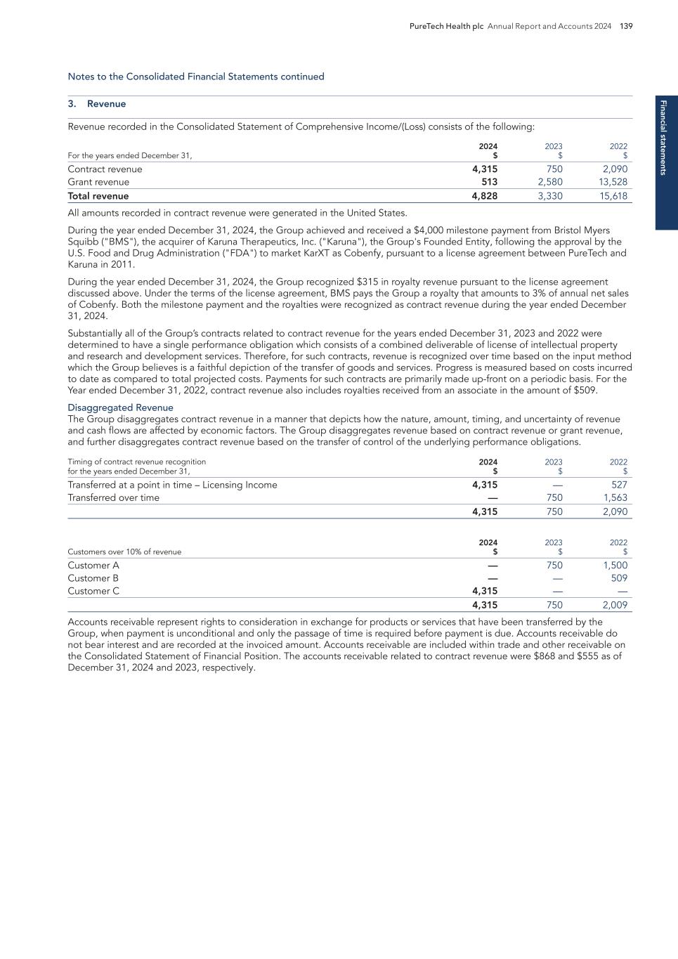 Financial statem ents PureTech Health plc Annual Report and Accounts 2024  139 Notes to the Consolidated Financial Statements continued 3.  Revenue  Revenue recorded in the Consolidated Statement of Comprehensive Income/(Loss) consists of the following: For the years ended December 31, 2024 $ 2023 $ 2022 $ Contract revenue 4,315 750 2,090 Grant revenue 513 2,580 13,528 Total revenue 4,828 3,330 15,618 All amounts recorded in contract revenue were generated in the United States.  During the year ended December 31, 2024, the Group achieved and received a $4,000 milestone payment from Bristol Myers  Squibb ("BMS"), the acquirer of Karuna Therapeutics, Inc. ("Karuna"), the Group's Founded Entity, following the approval by the  U.S. Food and Drug Administration ("FDA") to market KarXT as Cobenfy, pursuant to a license agreement between PureTech and  Karuna in 2011.  During the year ended December 31, 2024, the Group recognized $315 in royalty revenue pursuant to the license agreement  discussed above. Under the terms of the license agreement, BMS pays the Group a royalty that amounts to 3% of annual net sales  of Cobenfy. Both the milestone payment and the royalties were recognized as contract revenue during the year ended December  31, 2024. Substantially all of the Group’s contracts related to contract revenue for the years ended December 31, 2023 and 2022 were  determined to have a single performance obligation which consists of a combined deliverable of license of intellectual property  and research and development services. Therefore, for such contracts, revenue is recognized over time based on the input method  which the Group believes is a faithful depiction of the transfer of goods and services. Progress is measured based on costs incurred  to date as compared to total projected costs. Payments for such contracts are primarily made up-front on a periodic basis. For the  Year ended December 31, 2022, contract revenue also includes royalties received from an associate in the amount of $509. Disaggregated Revenue The Group disaggregates contract revenue in a manner that depicts how the nature, amount, timing, and uncertainty of revenue  and cash flows are affected by economic factors. The Group disaggregates revenue based on contract revenue or grant revenue,  and further disaggregates contract revenue based on the transfer of control of the underlying performance obligations. Timing of contract revenue recognition for the years ended December 31, 2024 $ 2023 $ 2022 $ Transferred at a point in time – Licensing Income 4,315 — 527 Transferred over time — 750 1,563 4,315 750 2,090 Customers over 10% of revenue 2024 $ 2023 $ 2022 $ Customer A — 750 1,500 Customer B — — 509 Customer C 4,315 — — 4,315 750 2,009 Accounts receivable represent rights to consideration in exchange for products or services that have been transferred by the  Group, when payment is unconditional and only the passage of time is required before payment is due. Accounts receivable do  not bear interest and are recorded at the invoiced amount. Accounts receivable are included within trade and other receivable on  the Consolidated Statement of Financial Position. The accounts receivable related to contract revenue were $868 and $555 as of  December 31, 2024 and 2023, respectively.