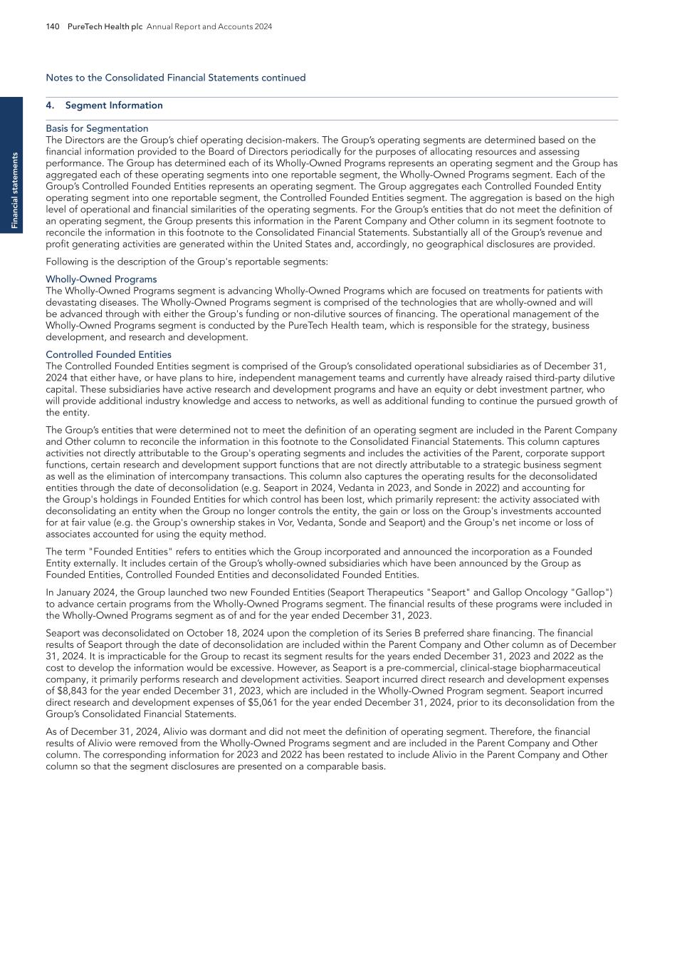 Fi na nc ia l s ta te m en ts 140  PureTech Health plc Annual Report and Accounts 2024 Notes to the Consolidated Financial Statements continued 4. Segment Information Basis for Segmentation  The Directors are the Group’s chief operating decision-makers. The Group’s operating segments are determined based on the  financial information provided to the Board of Directors periodically for the purposes of allocating resources and assessing  performance. The Group has determined each of its Wholly-Owned Programs represents an operating segment and the Group has  aggregated each of these operating segments into one reportable segment, the Wholly-Owned Programs segment. Each of the  Group’s Controlled Founded Entities represents an operating segment. The Group aggregates each Controlled Founded Entity  operating segment into one reportable segment, the Controlled Founded Entities segment. The aggregation is based on the high  level of operational and financial similarities of the operating segments. For the Group’s entities that do not meet the definition of  an operating segment, the Group presents this information in the Parent Company and Other column in its segment footnote to  reconcile the information in this footnote to the Consolidated Financial Statements. Substantially all of the Group’s revenue and  profit generating activities are generated within the United States and, accordingly, no geographical disclosures are provided.  Following is the description of the Group's reportable segments: Wholly-Owned Programs The Wholly-Owned Programs segment is advancing Wholly-Owned Programs which are focused on treatments for patients with  devastating diseases. The Wholly-Owned Programs segment is comprised of the technologies that are wholly-owned and will  be advanced through with either the Group's funding or non-dilutive sources of financing. The operational management of the  Wholly-Owned Programs segment is conducted by the PureTech Health team, which is responsible for the strategy, business  development, and research and development.  Controlled Founded Entities The Controlled Founded Entities segment is comprised of the Group’s consolidated operational subsidiaries as of December 31,  2024 that either have, or have plans to hire, independent management teams and currently have already raised third-party dilutive  capital. These subsidiaries have active research and development programs and have an equity or debt investment partner, who  will provide additional industry knowledge and access to networks, as well as additional funding to continue the pursued growth of  the entity.  The Group’s entities that were determined not to meet the definition of an operating segment are included in the Parent Company  and Other column to reconcile the information in this footnote to the Consolidated Financial Statements. This column captures  activities not directly attributable to the Group's operating segments and includes the activities of the Parent, corporate support  functions, certain research and development support functions that are not directly attributable to a strategic business segment  as well as the elimination of intercompany transactions. This column also captures the operating results for the deconsolidated  entities through the date of deconsolidation (e.g. Seaport in 2024, Vedanta in 2023, and Sonde in 2022) and accounting for  the Group's holdings in Founded Entities for which control has been lost, which primarily represent: the activity associated with  deconsolidating an entity when the Group no longer controls the entity, the gain or loss on the Group's investments accounted  for at fair value (e.g. the Group's ownership stakes in Vor, Vedanta, Sonde and Seaport) and the Group's net income or loss of  associates accounted for using the equity method.  The term "Founded Entities" refers to entities which the Group incorporated and announced the incorporation as a Founded  Entity externally. It includes certain of the Group’s wholly-owned subsidiaries which have been announced by the Group as  Founded Entities, Controlled Founded Entities and deconsolidated Founded Entities. In January 2024, the Group launched two new Founded Entities (Seaport Therapeutics "Seaport" and Gallop Oncology "Gallop")  to advance certain programs from the Wholly-Owned Programs segment. The financial results of these programs were included in  the Wholly-Owned Programs segment as of and for the year ended December 31, 2023.  Seaport was deconsolidated on October 18, 2024 upon the completion of its Series B preferred share financing. The financial  results of Seaport through the date of deconsolidation are included within the Parent Company and Other column as of December  31, 2024. It is impracticable for the Group to recast its segment results for the years ended December 31, 2023 and 2022 as the  cost to develop the information would be excessive. However, as Seaport is a pre-commercial, clinical-stage biopharmaceutical  company, it primarily performs research and development activities. Seaport incurred direct research and development expenses  of $8,843 for the year ended December 31, 2023, which are included in the Wholly-Owned Program segment. Seaport incurred  direct research and development expenses of $5,061 for the year ended December 31, 2024, prior to its deconsolidation from the  Group’s Consolidated Financial Statements. As of December 31, 2024, Alivio was dormant and did not meet the definition of operating segment. Therefore, the financial  results of Alivio were removed from the Wholly-Owned Programs segment and are included in the Parent Company and Other  column. The corresponding information for 2023 and 2022 has been restated to include Alivio in the Parent Company and Other  column so that the segment disclosures are presented on a comparable basis.