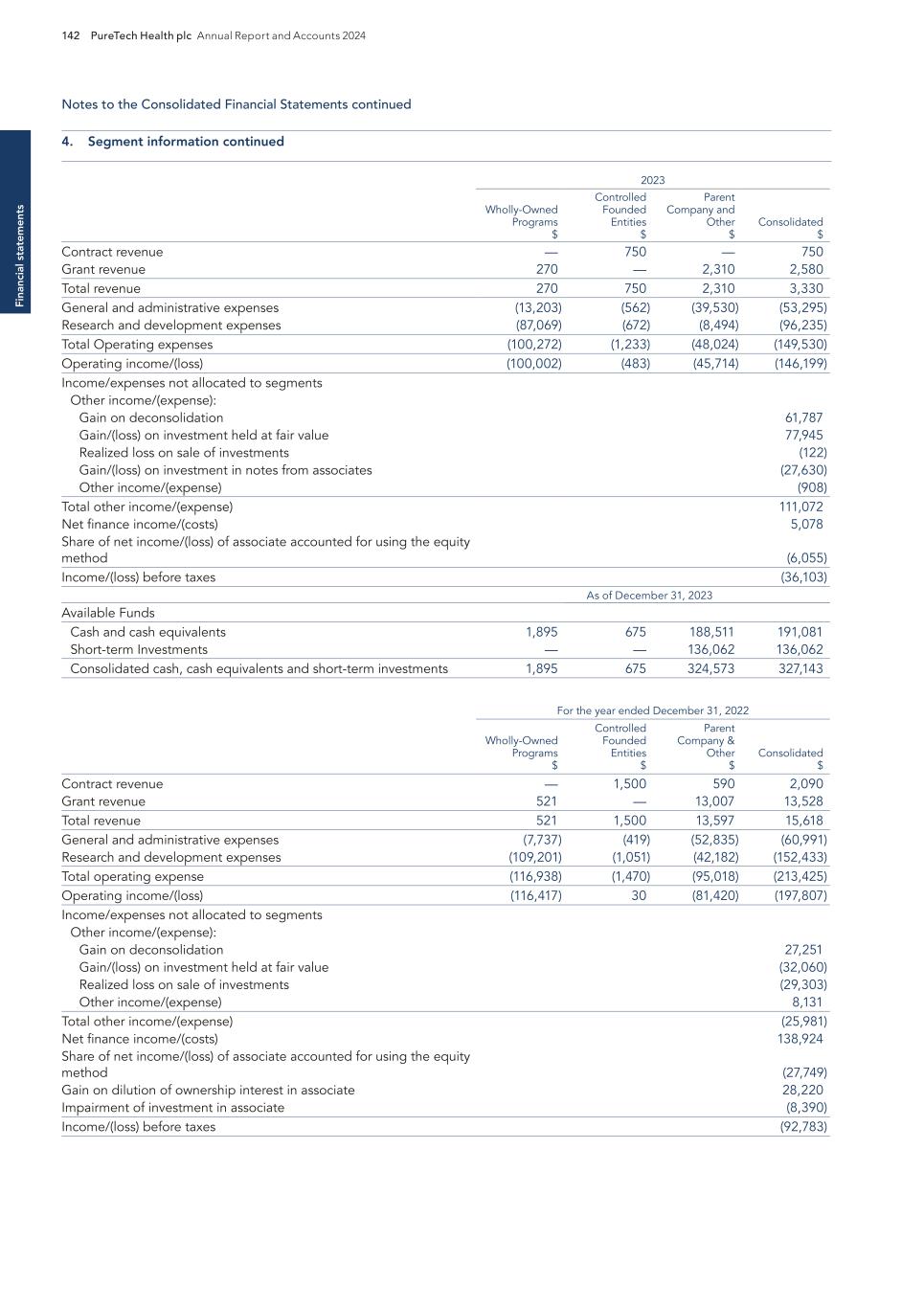 Fi na nc ia l s ta te m en ts 142  PureTech Health plc Annual Report and Accounts 2024 4.  Segment information continued Notes to the Consolidated Financial Statements continued 2023 Wholly-Owned  Programs $ Controlled  Founded  Entities $ Parent Company and Other $ Consolidated $ Contract revenue — 750 — 750 Grant revenue 270 — 2,310 2,580 Total revenue 270 750 2,310 3,330 General and administrative expenses (13,203) (562) (39,530) (53,295) Research and development expenses (87,069) (672) (8,494) (96,235) Total Operating expenses (100,272) (1,233) (48,024) (149,530) Operating income/(loss) (100,002) (483) (45,714) (146,199) Income/expenses not allocated to segments Other income/(expense): Gain on deconsolidation 61,787 Gain/(loss) on investment held at fair value 77,945 Realized loss on sale of investments (122) Gain/(loss) on investment in notes from associates (27,630) Other income/(expense) (908) Total other income/(expense) 111,072 Net finance income/(costs) 5,078 Share of net income/(loss) of associate accounted for using the equity  method (6,055) Income/(loss) before taxes (36,103) As of December 31, 2023 Available Funds Cash and cash equivalents 1,895 675 188,511 191,081 Short-term Investments — — 136,062 136,062 Consolidated cash, cash equivalents and short-term investments 1,895 675 324,573 327,143 For the year ended December 31, 2022 Wholly-Owned  Programs $ Controlled  Founded  Entities $ Parent Company & Other $ Consolidated $ Contract revenue — 1,500 590 2,090 Grant revenue 521 — 13,007 13,528 Total revenue 521 1,500 13,597 15,618 General and administrative expenses (7,737) (419) (52,835) (60,991) Research and development expenses (109,201) (1,051) (42,182) (152,433) Total operating expense (116,938) (1,470) (95,018) (213,425) Operating income/(loss) (116,417) 30 (81,420) (197,807) Income/expenses not allocated to segments Other income/(expense): Gain on deconsolidation 27,251 Gain/(loss) on investment held at fair value (32,060) Realized loss on sale of investments (29,303) Other income/(expense) 8,131 Total other income/(expense) (25,981) Net finance income/(costs) 138,924 Share of net income/(loss) of associate accounted for using the equity  method (27,749) Gain on dilution of ownership interest in associate 28,220 Impairment of investment in associate (8,390) Income/(loss) before taxes (92,783)