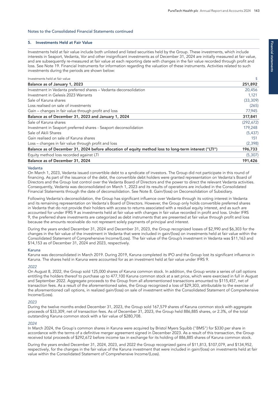 Financial statem ents PureTech Health plc Annual Report and Accounts 2024  143 Notes to the Consolidated Financial Statements continued 5.  Investments Held at Fair Value Investments held at fair value include both unlisted and listed securities held by the Group. These investments, which include  interests in Seaport, Vedanta, Vor and other insignificant investments as of December 31, 2024 are initially measured at fair value,  and are subsequently re-measured at fair value at each reporting date with changes in the fair value recorded through profit and  loss. See Note 19. Financial Instruments for information regarding the valuation of these instruments. Activities related to such  investments during the periods are shown below: Investments held at fair value $ Balance as of January 1, 2023 251,892 Investment in Vedanta preferred shares – Vedanta deconsolidation 20,456 Investment in Gelesis 2023 Warrants 1,121 Sale of Karuna shares (33,309) Loss realised on sale of investments (265) Gain – changes in fair value through profit and loss 77,945 Balance as of December 31, 2023 and January 1, 2024 317,841 Sale of Karuna shares (292,672) Investment in Seaport preferred shares - Seaport deconsolidation 179,248 Sale of Akili Shares (5,437) Gain realised on sale of Karuna shares 151 Loss – changes in fair value through profit and loss (2,398) Balance as of December 31, 2024 before allocation of equity method loss to long-term interest ("LTI") 196,733 Equity method loss recorded against LTI (5,307) Balance as of December 31, 2024 191,426 Vedanta On March 1, 2023, Vedanta issued convertible debt to a syndicate of investors. The Group did not participate in this round of  financing. As part of the issuance of the debt, the convertible debt holders were granted representation on Vedanta's Board of  Directors and the Group lost control over the Vedanta Board of Directors and the power to direct the relevant Vedanta activities.  Consequently, Vedanta was deconsolidated on March 1, 2023 and its results of operations are included in the Consolidated  Financial Statements through the date of deconsolidation. See Note 8. Gain/(loss) on Deconsolidation of Subsidiary. Following Vedanta's deconsolidation, the Group has significant influence over Vedanta through its voting interest in Vedanta  and its remaining representation on Vedanta's Board of Directors. However, the Group only holds convertible preferred shares  in Vedanta that do not provide their holders with access to returns associated with a residual equity interest, and as such are  accounted for under IFRS 9 as investments held at fair value with changes in fair value recorded in profit and loss. Under IFRS  9, the preferred share investments are categorized as debt instruments that are presented at fair value through profit and loss  because the amounts receivable do not represent solely payments of principal and interest. During the years ended December 31, 2024 and December 31, 2023, the Group recognized losses of $2,990 and $6,303 for the  changes in the fair value of the investment in Vedanta that were included in gain/(loss) on investments held at fair value within the  Consolidated Statement of Comprehensive Income/(Loss). The fair value of the Group’s investment in Vedanta was $11,163 and  $14,153 as of December 31, 2024 and 2023, respectively. Karuna Karuna was deconsolidated in March 2019. During 2019, Karuna completed its IPO and the Group lost its significant influence in  Karuna. The shares held in Karuna were accounted for as an investment held at fair value under IFRS 9. 2022 On August 8, 2022, the Group sold 125,000 shares of Karuna common stock. In addition, the Group wrote a series of call options  entitling the holders thereof to purchase up to 477,100 Karuna common stock at a set price, which were exercised in full in August  and September 2022. Aggregate proceeds to the Group from all aforementioned transactions amounted to $115,457, net of  transaction fees. As a result of the aforementioned sales, the Group recognized a loss of $29,303, attributable to the exercise of  the aforementioned call options, in realized gain/(loss) on sale of investment within the Consolidated Statement of Comprehensive  Income/(Loss).  2023 During the twelve months ended December 31, 2023, the Group sold 167,579 shares of Karuna common stock with aggregate  proceeds of $33,309, net of transaction fees. As of December 31, 2023, the Group held 886,885 shares, or 2.3%, of the total  outstanding Karuna common stock with a fair value of $280,708.  2024 In March 2024, the Group's common shares in Karuna were acquired by Bristol Myers Squibb ("BMS") for $330 per share in  accordance with the terms of a definitive merger agreement signed in December 2023. As a result of this transaction, the Group  received total proceeds of $292,672 before income tax in exchange for its holding of 886,885 shares of Karuna common stock.  During the years ended December 31, 2024, 2023, and 2022 the Group recognized gains of $11,813, $107,079, and $134,952,  respectively, for the changes in the fair value of the Karuna investment that were included in gain/(loss) on investments held at fair  value within the Consolidated Statement of Comprehensive Income/(Loss).