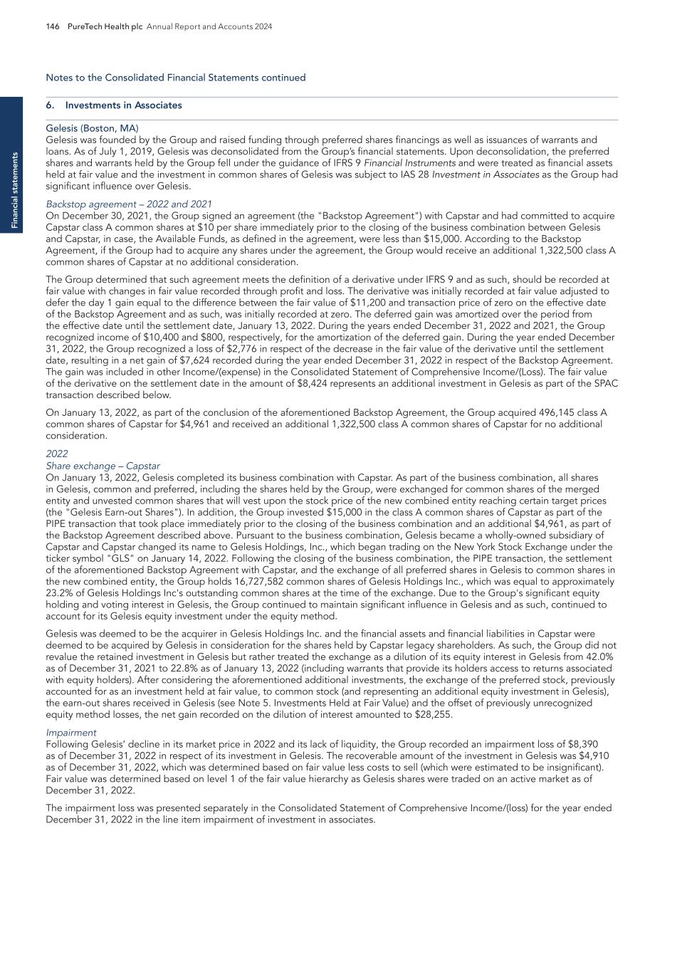 Fi na nc ia l s ta te m en ts 146  PureTech Health plc Annual Report and Accounts 2024 Notes to the Consolidated Financial Statements continued 6.  Investments in Associates Gelesis (Boston, MA) Gelesis was founded by the Group and raised funding through preferred shares financings as well as issuances of warrants and  loans. As of July 1, 2019, Gelesis was deconsolidated from the Group’s financial statements. Upon deconsolidation, the preferred  shares and warrants held by the Group fell under the guidance of IFRS 9 Financial Instruments and were treated as financial assets  held at fair value and the investment in common shares of Gelesis was subject to IAS 28 Investment in Associates as the Group had  significant influence over Gelesis.  Backstop agreement – 2022 and 2021 On December 30, 2021, the Group signed an agreement (the "Backstop Agreement") with Capstar and had committed to acquire  Capstar class A common shares at $10 per share immediately prior to the closing of the business combination between Gelesis  and Capstar, in case, the Available Funds, as defined in the agreement, were less than $15,000. According to the Backstop  Agreement, if the Group had to acquire any shares under the agreement, the Group would receive an additional 1,322,500 class A  common shares of Capstar at no additional consideration. The Group determined that such agreement meets the definition of a derivative under IFRS 9 and as such, should be recorded at  fair value with changes in fair value recorded through profit and loss. The derivative was initially recorded at fair value adjusted to  defer the day 1 gain equal to the difference between the fair value of $11,200 and transaction price of zero on the effective date  of the Backstop Agreement and as such, was initially recorded at zero. The deferred gain was amortized over the period from  the effective date until the settlement date, January 13, 2022. During the years ended December 31, 2022 and 2021, the Group  recognized income of $10,400 and $800, respectively, for the amortization of the deferred gain. During the year ended December  31, 2022, the Group recognized a loss of $2,776 in respect of the decrease in the fair value of the derivative until the settlement  date, resulting in a net gain of $7,624 recorded during the year ended December 31, 2022 in respect of the Backstop Agreement.  The gain was included in other Income/(expense) in the Consolidated Statement of Comprehensive Income/(Loss). The fair value  of the derivative on the settlement date in the amount of $8,424 represents an additional investment in Gelesis as part of the SPAC  transaction described below. On January 13, 2022, as part of the conclusion of the aforementioned Backstop Agreement, the Group acquired 496,145 class A  common shares of Capstar for $4,961 and received an additional 1,322,500 class A common shares of Capstar for no additional  consideration. 2022 Share exchange – Capstar On January 13, 2022, Gelesis completed its business combination with Capstar. As part of the business combination, all shares  in Gelesis, common and preferred, including the shares held by the Group, were exchanged for common shares of the merged  entity and unvested common shares that will vest upon the stock price of the new combined entity reaching certain target prices  (the "Gelesis Earn-out Shares"). In addition, the Group invested $15,000 in the class A common shares of Capstar as part of the  PIPE transaction that took place immediately prior to the closing of the business combination and an additional $4,961, as part of  the Backstop Agreement described above. Pursuant to the business combination, Gelesis became a wholly-owned subsidiary of  Capstar and Capstar changed its name to Gelesis Holdings, Inc., which began trading on the New York Stock Exchange under the  ticker symbol "GLS" on January 14, 2022. Following the closing of the business combination, the PIPE transaction, the settlement  of the aforementioned Backstop Agreement with Capstar, and the exchange of all preferred shares in Gelesis to common shares in  the new combined entity, the Group holds 16,727,582 common shares of Gelesis Holdings Inc., which was equal to approximately  23.2% of Gelesis Holdings Inc's outstanding common shares at the time of the exchange. Due to the Group's significant equity  holding and voting interest in Gelesis, the Group continued to maintain significant influence in Gelesis and as such, continued to  account for its Gelesis equity investment under the equity method. Gelesis was deemed to be the acquirer in Gelesis Holdings Inc. and the financial assets and financial liabilities in Capstar were  deemed to be acquired by Gelesis in consideration for the shares held by Capstar legacy shareholders. As such, the Group did not  revalue the retained investment in Gelesis but rather treated the exchange as a dilution of its equity interest in Gelesis from 42.0%  as of December 31, 2021 to 22.8% as of January 13, 2022 (including warrants that provide its holders access to returns associated  with equity holders). After considering the aforementioned additional investments, the exchange of the preferred stock, previously  accounted for as an investment held at fair value, to common stock (and representing an additional equity investment in Gelesis),  the earn-out shares received in Gelesis (see Note 5. Investments Held at Fair Value) and the offset of previously unrecognized  equity method losses, the net gain recorded on the dilution of interest amounted to $28,255. Impairment Following Gelesis’ decline in its market price in 2022 and its lack of liquidity, the Group recorded an impairment loss of $8,390  as of December 31, 2022 in respect of its investment in Gelesis. The recoverable amount of the investment in Gelesis was $4,910  as of December 31, 2022, which was determined based on fair value less costs to sell (which were estimated to be insignificant).  Fair value was determin