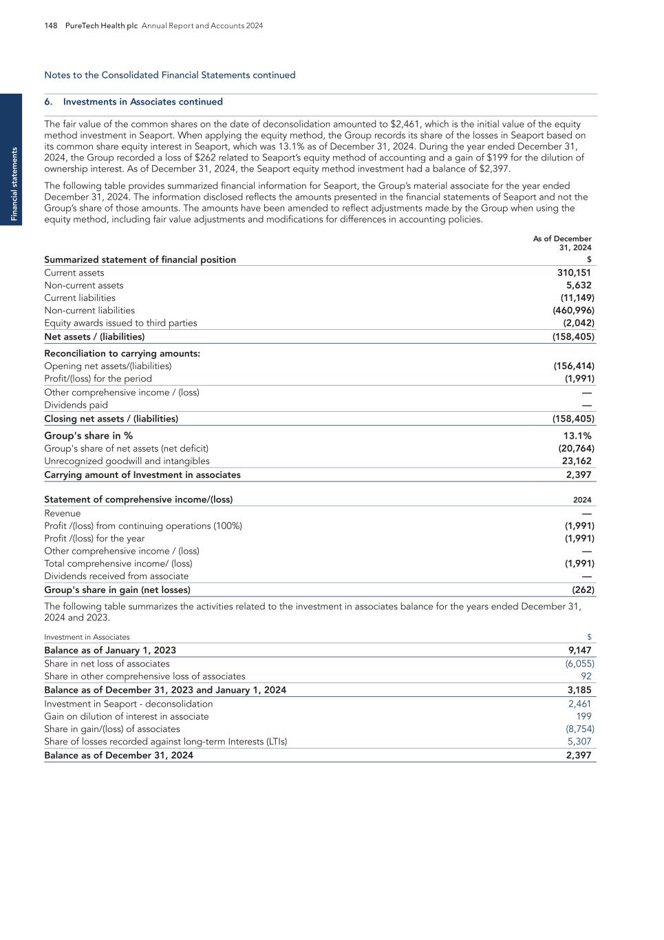 Fi na nc ia l s ta te m en ts 148  PureTech Health plc Annual Report and Accounts 2024 6.  Investments in Associates continued Notes to the Consolidated Financial Statements continued The fair value of the common shares on the date of deconsolidation amounted to $2,461, which is the initial value of the equity  method investment in Seaport. When applying the equity method, the Group records its share of the losses in Seaport based on  its common share equity interest in Seaport, which was 13.1% as of December 31, 2024. During the year ended December 31,  2024, the Group recorded a loss of $262 related to Seaport’s equity method of accounting and a gain of $199 for the dilution of  ownership interest. As of December 31, 2024, the Seaport equity method investment had a balance of $2,397. The following table provides summarized financial information for Seaport, the Group’s material associate for the year ended  December 31, 2024. The information disclosed reflects the amounts presented in the financial statements of Seaport and not the  Group’s share of those amounts. The amounts have been amended to reflect adjustments made by the Group when using the  equity method, including fair value adjustments and modifications for differences in accounting policies. As of December  31, 2024 Summarized statement of financial position $ Current assets 310,151 Non-current assets 5,632 Current liabilities (11,149) Non-current liabilities (460,996) Equity awards issued to third parties (2,042) Net assets / (liabilities) (158,405) Reconciliation to carrying amounts: Opening net assets/(liabilities) (156,414) Profit/(loss) for the period (1,991) Other comprehensive income / (loss) — Dividends paid — Closing net assets / (liabilities) (158,405) Group's share in % 13.1% Group's share of net assets (net deficit) (20,764) Unrecognized goodwill and intangibles 23,162 Carrying amount of Investment in associates 2,397 2024Statement of comprehensive income/(loss) Revenue — Profit /(loss) from continuing operations (100%) (1,991) Profit /(loss) for the year (1,991) Other comprehensive income / (loss) — Total comprehensive income/ (loss) (1,991) Dividends received from associate — Group's share in gain (net losses) (262) The following table summarizes the activities related to the investment in associates balance for the years ended December 31,  2024 and 2023. Investment in Associates $ Balance as of January 1, 2023 9,147 Share in net loss of associates (6,055) Share in other comprehensive loss of associates 92 Balance as of December 31, 2023 and January 1, 2024 3,185 Investment in Seaport - deconsolidation 2,461 Gain on dilution of interest in associate 199 Share in gain/(loss) of associates (8,754) Share of losses recorded against long-term Interests (LTIs) 5,307 Balance as of December 31, 2024 2,397
