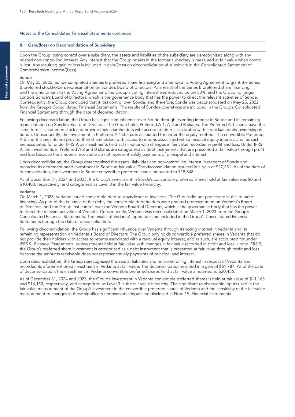 Fi na nc ia l s ta te m en ts 150  PureTech Health plc Annual Report and Accounts 2024 Notes to the Consolidated Financial Statements continued 8.  Gain/(loss) on Deconsolidation of Subsidiary Upon the Group losing control over a subsidiary, the assets and liabilities of the subsidiary are derecognized along with any  related non-controlling interest. Any interest that the Group retains in the former subsidiary is measured at fair value when control  is lost. Any resulting gain or loss is included in gain/(loss) on deconsolidation of subsidiary in the Consolidated Statement of  Comprehensive Income/(Loss). Sonde On May 25, 2022, Sonde completed a Series B preferred share financing and amended its Voting Agreement to grant the Series  B preferred stockholders representation on Sonde’s Board of Directors. As a result of the Series B preferred share financing  and the amendment to the Voting Agreement, the Group's voting interest was reduced below 50%, and the Group no longer  controls Sonde's Board of Directors, which is the governance body that has the power to direct the relevant activities of Sonde.  Consequently, the Group concluded that it lost control over Sonde, and therefore, Sonde was deconsolidated on May 25, 2022  from the Group’s Consolidated Financial Statements. The results of Sonde’s operations are included in the Group’s Consolidated  Financial Statements through the date of deconsolidation. Following deconsolidation, the Group has significant influence over Sonde through its voting interest in Sonde and its remaining  representation on Sonde's Board of Directors. The Group holds Preferred A-1, A-2 and B shares. The Preferred A-1 shares have the  same terms as common stock and provide their shareholders with access to returns associated with a residual equity ownership in  Sonde. Consequently, the investment in Preferred A-1 shares is accounted for under the equity method. The convertible Preferred  A-2 and B shares do not provide their shareholders with access to returns associated with a residual equity interest, and, as such,  are accounted for under IFRS 9, as investments held at fair value with changes in fair value recorded in profit and loss. Under IFRS  9, the investments in Preferred A-2 and B shares are categorized as debt instruments that are presented at fair value through profit  and loss because the amounts receivable do not represent solely payments of principal and interest. Upon deconsolidation, the Group derecognized the assets, liabilities and non-controlling interest in respect of Sonde and  recorded its aforementioned investment in Sonde at fair value. The deconsolidation resulted in a gain of $27,251. As of the date of  deconsolidation, the investment in Sonde convertible preferred shares amounted to $18,848.  As of December 31, 2024 and 2023, the Group’s investment in Sonde’s convertible preferred shares held at fair value was $0 and  $10,408, respectively, and categorized as Level 3 in the fair value hierarchy. Vedanta On March 1, 2023, Vedanta issued convertible debt to a syndicate of investors. The Group did not participate in this round of  financing. As part of the issuance of the debt, the convertible debt holders were granted representation on Vedanta's Board  of Directors, and the Group lost control over the Vedanta Board of Directors, which is the governance body that has the power  to direct the relevant activities of Vedanta. Consequently, Vedanta was deconsolidated on March 1, 2023 from the Group’s  Consolidated Financial Statements. The results of Vedanta’s operations are included in the Group’s Consolidated Financial  Statements through the date of deconsolidation. Following deconsolidation, the Group has significant influence over Vedanta through its voting interest in Vedanta and its  remaining representation on Vedanta's Board of Directors. The Group only holds convertible preferred shares in Vedanta that do  not provide their holders with access to returns associated with a residual equity interest, and as such, are accounted for under  IFRS 9, Financial Instruments, as investments held at fair value with changes in fair value recorded in profit and loss. Under IFRS 9,  the Group’s preferred share investment is categorized as a debt instrument that is presented at fair value through profit and loss  because the amounts receivable does not represent solely payments of principal and interest. Upon deconsolidation, the Group derecognized the assets, liabilities and non-controlling interest in respect of Vedanta and  recorded its aforementioned investment in Vedanta at fair value. The deconsolidation resulted in a gain of $61,787. As of the date  of deconsolidation, the investment in Vedanta convertible preferred shares held at fair value amounted to $20,456.  As of December 31, 2024 and 2023, the Group’s investment in Vedanta convertible preferred shares is held at fair value of $11,163  and $14,153, respectively, and categorized as Level 3 in the fair value hierarchy. The significant unobservable inputs used in the  fair value measurement of the Group’s investment in the convertible preferred shares of Vedanta and the sensitivity of the fair value  measurement to changes in these significant unobservable inputs are disclosed in Note 19. Financial Instruments.
