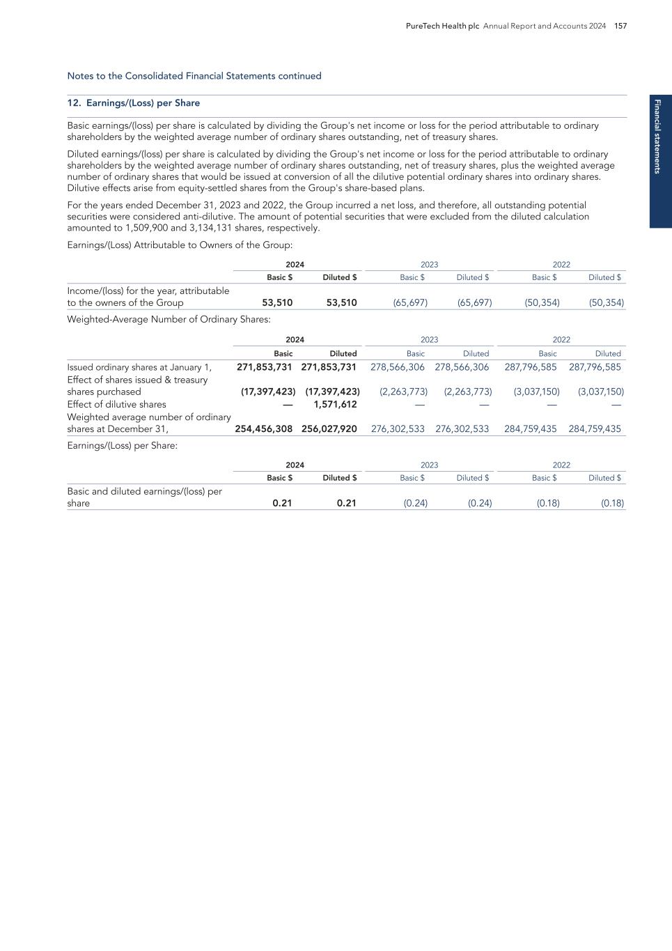 Financial statem ents PureTech Health plc Annual Report and Accounts 2024  157 Notes to the Consolidated Financial Statements continued 12. Earnings/(Loss) per Share  Basic earnings/(loss) per share is calculated by dividing the Group's net income or loss for the period attributable to ordinary  shareholders by the weighted average number of ordinary shares outstanding, net of treasury shares.  Diluted earnings/(loss) per share is calculated by dividing the Group's net income or loss for the period attributable to ordinary  shareholders by the weighted average number of ordinary shares outstanding, net of treasury shares, plus the weighted average  number of ordinary shares that would be issued at conversion of all the dilutive potential ordinary shares into ordinary shares.  Dilutive effects arise from equity-settled shares from the Group's share-based plans.  For the years ended December 31, 2023 and 2022, the Group incurred a net loss, and therefore, all outstanding potential  securities were considered anti-dilutive. The amount of potential securities that were excluded from the diluted calculation  amounted to 1,509,900 and 3,134,131 shares, respectively.  Earnings/(Loss) Attributable to Owners of the Group: 2024 2023 2022 Basic $ Diluted $ Basic $ Diluted $ Basic $ Diluted $ Income/(loss) for the year, attributable  to the owners of the Group 53,510 53,510 (65,697) (65,697) (50,354) (50,354) Weighted-Average Number of Ordinary Shares: 2024 2023 2022 Basic Diluted Basic Diluted Basic Diluted Issued ordinary shares at January 1, 271,853,731 271,853,731 278,566,306 278,566,306 287,796,585 287,796,585 Effect of shares issued & treasury  shares purchased (17,397,423) (17,397,423) (2,263,773) (2,263,773) (3,037,150) (3,037,150) Effect of dilutive shares — 1,571,612 — — — — Weighted average number of ordinary  shares at December 31, 254,456,308 256,027,920 276,302,533 276,302,533 284,759,435 284,759,435 Earnings/(Loss) per Share: 2024 2023 2022 Basic $ Diluted $ Basic $ Diluted $ Basic $ Diluted $ Basic and diluted earnings/(loss) per  share 0.21 0.21 (0.24) (0.24) (0.18) (0.18)
