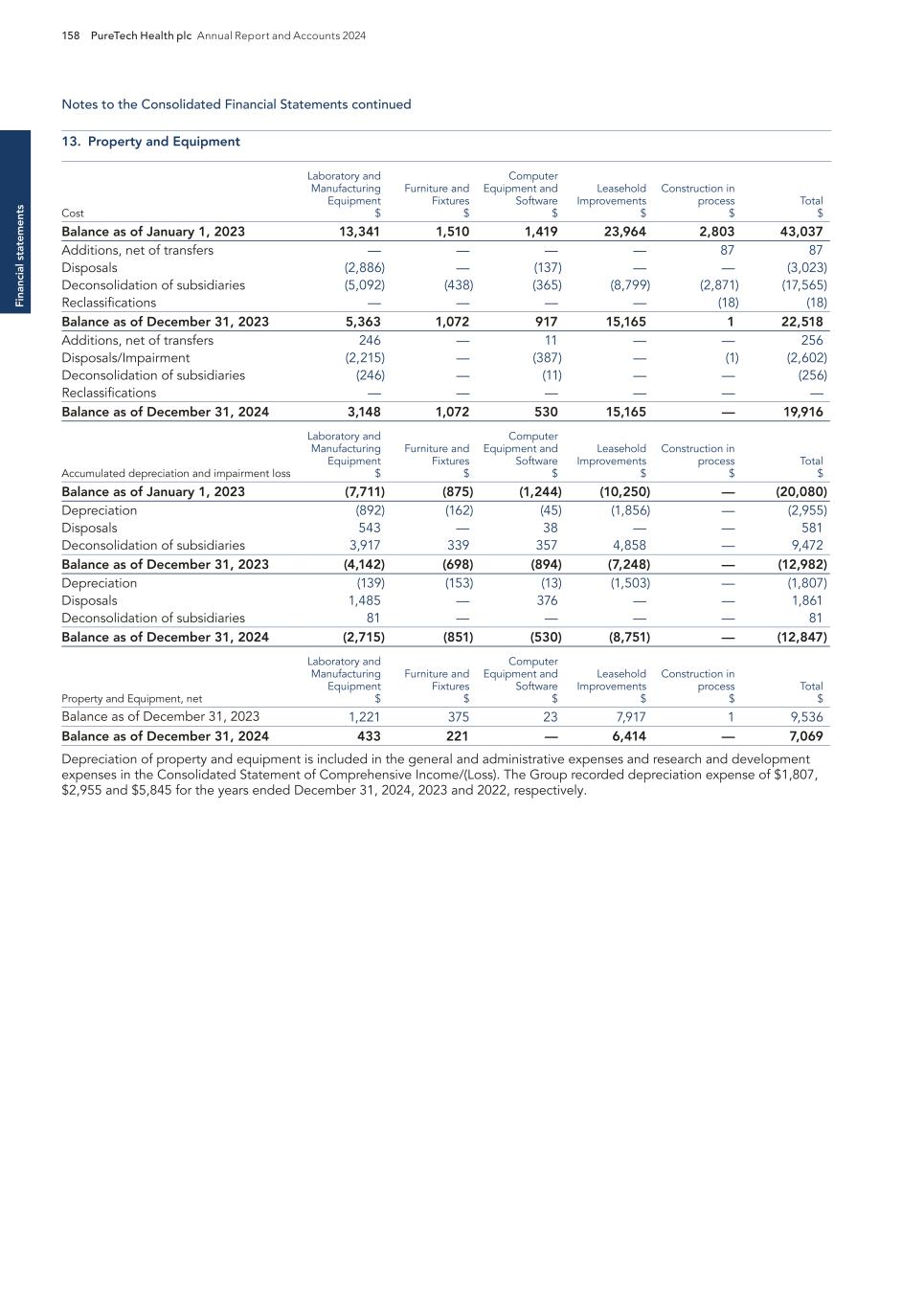 Fi na nc ia l s ta te m en ts 158  PureTech Health plc Annual Report and Accounts 2024 Notes to the Consolidated Financial Statements continued 13. Property and Equipment Cost Laboratory and  Manufacturing  Equipment $ Furniture and Fixtures $ Computer  Equipment and Software $ Leasehold  Improvements $ Construction in process $ Total $ Balance as of January 1, 2023 13,341 1,510 1,419 23,964 2,803 43,037 Additions, net of transfers — — — — 87 87 Disposals (2,886) — (137) — — (3,023) Deconsolidation of subsidiaries (5,092) (438) (365) (8,799) (2,871) (17,565) Reclassifications — — — — (18) (18) Balance as of December 31, 2023 5,363 1,072 917 15,165 1 22,518 Additions, net of transfers 246 — 11 — — 256 Disposals/Impairment (2,215) — (387) — (1) (2,602) Deconsolidation of subsidiaries (246) — (11) — — (256) Reclassifications — — — — — — Balance as of December 31, 2024 3,148 1,072 530 15,165 — 19,916 Accumulated depreciation and impairment loss Laboratory and  Manufacturing  Equipment $ Furniture and Fixtures $ Computer  Equipment and Software $ Leasehold  Improvements $ Construction in process $ Total $ Balance as of January 1, 2023 (7,711) (875) (1,244) (10,250) — (20,080) Depreciation (892) (162) (45) (1,856) — (2,955) Disposals 543 — 38 — — 581 Deconsolidation of subsidiaries 3,917 339 357 4,858 — 9,472 Balance as of December 31, 2023 (4,142) (698) (894) (7,248) — (12,982) Depreciation (139) (153) (13) (1,503) — (1,807) Disposals 1,485 — 376 — — 1,861 Deconsolidation of subsidiaries 81 — — — — 81 Balance as of December 31, 2024 (2,715) (851) (530) (8,751) — (12,847) Property and Equipment, net Laboratory and  Manufacturing  Equipment $ Furniture and Fixtures $ Computer  Equipment and Software $ Leasehold  Improvements $ Construction in process $ Total $ Balance as of December 31, 2023 1,221 375 23 7,917 1 9,536 Balance as of December 31, 2024 433 221 — 6,414 — 7,069 Depreciation of property and equipment is included in the general and administrative expenses and research and development  expenses in the Consolidated Statement of Comprehensive Income/(Loss). The Group recorded depreciation expense of $1,807,  $2,955 and $5,845 for the years ended December 31, 2024, 2023 and 2022, respectively.