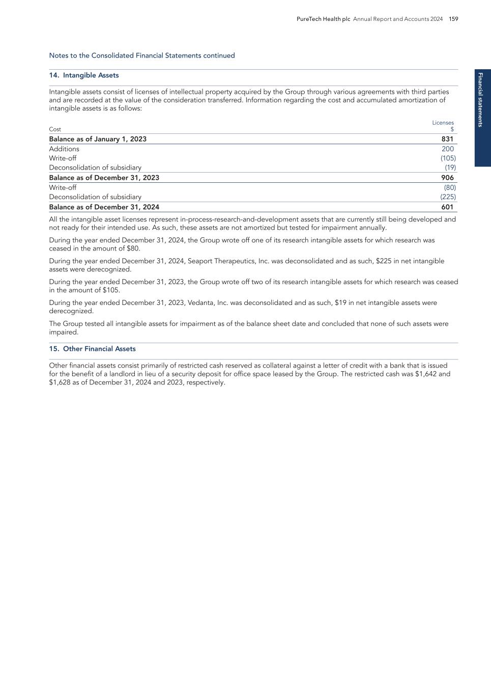 Financial statem ents PureTech Health plc Annual Report and Accounts 2024  159 Notes to the Consolidated Financial Statements continued 14.  Intangible Assets Intangible assets consist of licenses of intellectual property acquired by the Group through various agreements with third parties  and are recorded at the value of the consideration transferred. Information regarding the cost and accumulated amortization of  intangible assets is as follows: Cost Licenses $ Balance as of January 1, 2023 831 Additions 200 Write-off (105) Deconsolidation of subsidiary (19) Balance as of December 31, 2023 906 Write-off (80) Deconsolidation of subsidiary (225) Balance as of December 31, 2024 601 All the intangible asset licenses represent in-process-research-and-development assets that are currently still being developed and  not ready for their intended use. As such, these assets are not amortized but tested for impairment annually.  During the year ended December 31, 2024, the Group wrote off one of its research intangible assets for which research was  ceased in the amount of $80. During the year ended December 31, 2024, Seaport Therapeutics, Inc. was deconsolidated and as such, $225 in net intangible  assets were derecognized. During the year ended December 31, 2023, the Group wrote off two of its research intangible assets for which research was ceased  in the amount of $105. During the year ended December 31, 2023, Vedanta, Inc. was deconsolidated and as such, $19 in net intangible assets were  derecognized. The Group tested all intangible assets for impairment as of the balance sheet date and concluded that none of such assets were  impaired.  15.  Other Financial Assets  Other financial assets consist primarily of restricted cash reserved as collateral against a letter of credit with a bank that is issued  for the benefit of a landlord in lieu of a security deposit for office space leased by the Group. The restricted cash was $1,642 and  $1,628 as of December 31, 2024 and 2023, respectively.