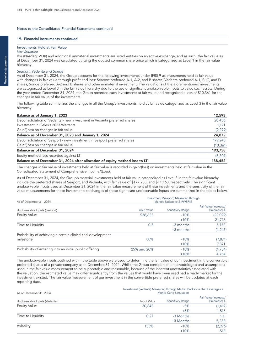 Fi na nc ia l s ta te m en ts 164  PureTech Health plc Annual Report and Accounts 2024 19.  Financial Instruments continued Notes to the Consolidated Financial Statements continued Investments Held at Fair Value Vor Valuation Vor (Nasdaq: VOR) and additional immaterial investments are listed entities on an active exchange, and as such, the fair value as  of December 31, 2024 was calculated utilizing the quoted common share price which is categorized as Level 1 in the fair value  hierarchy.  Seaport, Vedanta and Sonde As of December 31, 2024, the Group accounts for the following investments under IFRS 9 as investments held at fair value  with changes in fair value through profit and loss: Seaport preferred A-1, A-2, and B shares, Vedanta preferred A-1, B, C, and D  shares, Sonde preferred A-2 and B shares and other immaterial investment. The valuations of the aforementioned investments  are categorized as Level 3 in the fair value hierarchy due to the use of significant unobservable inputs to value such assets. During  the year ended December 31, 2024, the Group recorded such investments at fair value and recognized a loss of $10,361 for the  changes in fair value of the investments. The following table summarizes the changes in all the Group’s investments held at fair value categorized as Level 3 in the fair value  hierarchy: Balance as of January 1, 2023 12,593 Deconsolidation of Vedanta - new investment in Vedanta preferred shares 20,456 Investment in Gelesis 2023 Warrants 1,121 Gain/(loss) on changes in fair value (9,299) Balance as of December 31, 2023 and January 1, 2024 24,872 Deconsolidation of Seaport - new investment in Seaport preferred shares 179,248 Gain/(loss) on changes in fair value (10,361) Balance as of December 31, 2024 193,758 Equity method loss recorded against LTI (5,307) Balance as of December 31, 2024 after allocation of equity method loss to LTI 188,452 The changes in fair value of investments held at fair value is recorded in gain/(loss) on investments held at fair value in the  Consolidated Statement of Comprehensive Income/(Loss). As of December 31, 2024, the Group’s material investments held at fair value categorized as Level 3 in the fair value hierarchy  include the preferred shares of Seaport, and Vedanta, with fair value of $177,288, and $11,163, respectively. The significant  unobservable inputs used at December 31, 2024 in the fair value measurement of these investments and the sensitivity of the fair  value measurements for these investments to changes of these significant unobservable inputs are summarized in the tables below.  As of December 31, 2024 Investment (Seaport) Measured through  Market Backsolve & PWERM Unobservable Inputs (Seaport) Input Value Sensitivity Range Fair Value Increase/ (Decrease) $ Equity Value 538,635 -10% (22,099) +10% 21,716 Time to Liquidity 0.5 -3 months 5,753 +3 months (4,247) Probability of achieving a certain clinical trial development  milestone 80% -10% (7,871) +10% 7,871 Probability of entering into an initial public offering 25% and 20% -10% (4,754) +10% 4,754 The unobservable inputs outlined within the table above were used to determine the fair value of our investment in the convertible  preferred shares of a private company as of December 31, 2024. Whilst the Group considers the methodologies and assumptions  used in the fair value measurement to be supportable and reasonable, because of the inherent uncertainties associated with  the valuation, the estimated value may differ significantly from the values that would have been used had a ready market for the  investment existed. The fair value measurement of our investment in the convertible preferred shares will be updated at each  reporting date. As of December 31, 2024 Investment (Vedanta) Measured through Market Backsolve that Leverages a  Monte Carlo Simulation Unobservable Inputs (Vedanta) Input Value Sensitivity Range Fair Value Increase/ (Decrease) $ Equity Value 30,845 -5% (1,617) +5% 1,515 Time to Liquidity 0.27 -3 Months n.a. +3 Months 5,238 Volatility 155% -10% (2,976) +10% 518