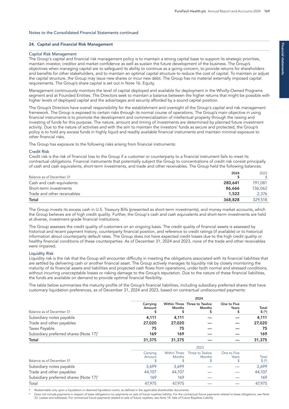 Financial statem ents PureTech Health plc Annual Report and Accounts 2024  169 Notes to the Consolidated Financial Statements continued 24.  Capital and Financial Risk Management  Capital Risk Management The Group's capital and financial risk management policy is to maintain a strong capital base to support its strategic priorities,  maintain investor, creditor and market confidence as well as sustain the future development of the business. The Group’s  objectives when managing capital are to safeguard its ability to continue as a going concern, to provide returns for shareholders  and benefits for other stakeholders, and to maintain an optimal capital structure to reduce the cost of capital. To maintain or adjust  the capital structure, the Group may issue new shares or incur new debt. The Group has no material externally imposed capital  requirements. The Group’s share capital is set out in Note 16. Equity. Management continuously monitors the level of capital deployed and available for deployment in the Wholly-Owned Programs  segment and at Founded Entities. The Directors seek to maintain a balance between the higher returns that might be possible with  higher levels of deployed capital and the advantages and security afforded by a sound capital position. The Group’s Directors have overall responsibility for the establishment and oversight of the Group's capital and risk management  framework. The Group is exposed to certain risks through its normal course of operations. The Group’s main objective in using  financial instruments is to promote the development and commercialization of intellectual property through the raising and  investing of funds for this purpose. The nature, amount and timing of investments are determined by planned future investment  activity. Due to the nature of activities and with the aim to maintain the investors’ funds as secure and protected, the Group’s  policy is to hold any excess funds in highly liquid and readily available financial instruments and maintain minimal exposure to  other financial risks. The Group has exposure to the following risks arising from financial instruments: Credit Risk Credit risk is the risk of financial loss to the Group if a customer or counterparty to a financial instrument fails to meet its  contractual obligations. Financial instruments that potentially subject the Group to concentrations of credit risk consist principally  of cash and cash equivalents, short-term investments, and trade and other receivables. The Group held the following balances:  2024 $ 2023 $Balance as of December 31 Cash and cash equivalents 280,641 191,081 Short-term investments 86,666 136,062 Trade and other receivables 1,522 2,376 Total 368,828 329,518 The Group invests its excess cash in U.S. Treasury Bills (presented as short-term investments), and money market accounts, which  the Group believes are of high credit quality. Further, the Group's cash and cash equivalents and short-term investments are held  at diverse, investment-grade financial institutions. The Group assesses the credit quality of customers on an ongoing basis. The credit quality of financial assets is assessed by  historical and recent payment history, counterparty financial position, and reference to credit ratings (if available) or to historical  information about counterparty default rates. The Group does not have expected credit losses due to the high credit quality or  healthy financial conditions of these counterparties. As of December 31, 2024 and 2023, none of the trade and other receivables  were impaired. Liquidity Risk Liquidity risk is the risk that the Group will encounter difficulty in meeting the obligations associated with its financial liabilities that  are settled by delivering cash or another financial asset. The Group actively manages its liquidity risk by closely monitoring the  maturity of its financial assets and liabilities and projected cash flows from operations, under both normal and stressed conditions,  without incurring unacceptable losses or risking damage to the Group’s reputation. Due to the nature of these financial liabilities,  the funds are available on demand to provide optimal financial flexibility. The table below summarizes the maturity profile of the Group’s financial liabilities, including subsidiary preferred shares that have  customary liquidation preferences, as of December 31, 2024 and 2023, based on contractual undiscounted payments: Balance as of December 31 2024 Carrying  Amount  $ Within Three  Months  $ Three to Twelve  Months  $ One to Five  Years  $ Total  $ (*) Subsidiary notes payable 4,111 4,111 — — 4,111 Trade and other payables 27,020 27,020 — — 27,020 Taxes Payable 75 75 — — 75 Subsidiary preferred shares (Note 17)1 169 169 — — 169 Total 31,375 31,375 — — 31,375 Balance as of December 31 2023 Carrying  Amount  $ Within Three  Months  $ Three to Twelve  Months  $ One to Five  Years  $ Total  $ (*) Subsidiary notes payable 3,699 3,699 — — 3,699 Trade and other payables 44,107 44,107 — — 44,107 Subsidiary preferred shares (Note 17)1 169 169 — — 169 Total 47,975 47,975 — — 47,975 1 Redeemable only upon a liquidation or deemed liquidation event, as defined in the applicable shareholder documents. * Does not include payments in respect of lease obligations nor payments on sale of future royalties liability. For the contractual future payments related to lease obligations, see Note  23. Leases and subleases. For contractual future payments related to sale of future royalties, see Note 18. Sale of Future Royalties Liability