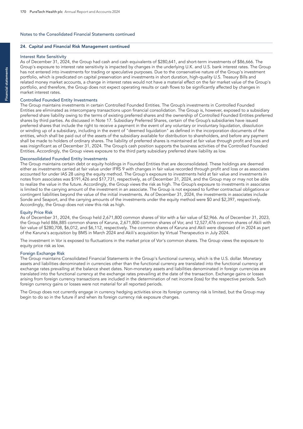 Fi na nc ia l s ta te m en ts 170  PureTech Health plc Annual Report and Accounts 2024 Notes to the Consolidated Financial Statements continued Interest Rate Sensitivity  As of December 31, 2024, the Group had cash and cash equivalents of $280,641, and short-term investments of $86,666. The  Group's exposure to interest rate sensitivity is impacted by changes in the underlying U.K. and U.S. bank interest rates. The Group  has not entered into investments for trading or speculative purposes. Due to the conservative nature of the Group's investment  portfolio, which is predicated on capital preservation and investments in short duration, high-quality U.S. Treasury Bills and  related money market accounts, a change in interest rates would not have a material effect on the fair market value of the Group's  portfolio, and therefore, the Group does not expect operating results or cash flows to be significantly affected by changes in  market interest rates. Controlled Founded Entity Investments The Group maintains investments in certain Controlled Founded Entities. The Group’s investments in Controlled Founded  Entities are eliminated as intercompany transactions upon financial consolidation. The Group is, however, exposed to a subsidiary  preferred share liability owing to the terms of existing preferred shares and the ownership of Controlled Founded Entities preferred  shares by third parties. As discussed in Note 17. Subsidiary Preferred Shares, certain of the Group’s subsidiaries have issued  preferred shares that include the right to receive a payment in the event of any voluntary or involuntary liquidation, dissolution  or winding up of a subsidiary, including in the event of "deemed liquidation" as defined in the incorporation documents of the  entities, which shall be paid out of the assets of the subsidiary available for distribution to shareholders, and before any payment  shall be made to holders of ordinary shares. The liability of preferred shares is maintained at fair value through profit and loss and  was insignificant as of December 31, 2024. The Group’s cash position supports the business activities of the Controlled Founded  Entities. Accordingly, the Group views exposure to the third party subsidiary preferred share liability as low. Deconsolidated Founded Entity Investments The Group maintains certain debt or equity holdings in Founded Entities that are deconsolidated. These holdings are deemed  either as investments carried at fair value under IFRS 9 with changes in fair value recorded through profit and loss or as associates  accounted for under IAS 28 using the equity method. The Group's exposure to investments held at fair value and investments in  notes from associates was $191,426 and $17,731, respectively, as of December 31, 2024, and the Group may or may not be able  to realize the value in the future. Accordingly, the Group views the risk as high. The Group’s exposure to investments in associates  is limited to the carrying amount of the investment in an associate. The Group is not exposed to further contractual obligations or  contingent liabilities beyond the value of the initial investments. As of December 31, 2024, the investments in associates include  Sonde and Seaport, and the carrying amounts of the investments under the equity method were $0 and $2,397, respectively.  Accordingly, the Group does not view this risk as high. Equity Price Risk As of December 31, 2024, the Group held 2,671,800 common shares of Vor with a fair value of $2,966. As of December 31, 2023,  the Group held 886,885 common shares of Karuna, 2,671,800 common shares of Vor, and 12,527,476 common shares of Akili with  fair value of $280,708, $6,012, and $6,112, respectively. The common shares of Karuna and Akili were disposed of in 2024 as part  of the Karuna's acquisition by BMS in March 2024 and Akili's acquisition by Virtual Therapeutics in July 2024.  The investment in Vor is exposed to fluctuations in the market price of Vor's common shares. The Group views the exposure to  equity price risk as low.  Foreign Exchange Risk The Group maintains Consolidated Financial Statements in the Group's functional currency, which is the U.S. dollar. Monetary  assets and liabilities denominated in currencies other than the functional currency are translated into the functional currency at  exchange rates prevailing at the balance sheet dates. Non-monetary assets and liabilities denominated in foreign currencies are  translated into the functional currency at the exchange rates prevailing at the date of the transaction. Exchange gains or losses  arising from foreign currency transactions are included in the determination of net income (loss) for the respective periods. Such  foreign currency gains or losses were not material for all reported periods.  The Group does not currently engage in currency hedging activities since its foreign currency risk is limited, but the Group may  begin to do so in the future if and when its foreign currency risk exposure changes. 24. Capital and Financial Risk Management continued