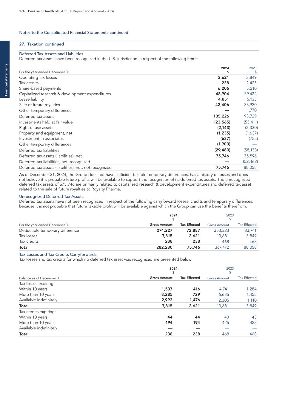 Fi na nc ia l s ta te m en ts 174  PureTech Health plc Annual Report and Accounts 2024 Notes to the Consolidated Financial Statements continued Deferred Tax Assets and Liabilities  Deferred tax assets have been recognized in the U.S. jurisdiction in respect of the following items: 2024 $ 2023 $For the year ended December 31 Operating tax losses 2,621 3,849 Tax credits 238 2,425 Share-based payments 6,206 5,210 Capitalized research & development expenditures 48,904 39,422 Lease liability 4,851 5,133 Sale of future royalties 42,406 35,920 Other temporary differences — 1,770 Deferred tax assets 105,226 93,729 Investments held at fair value (23,565) (53,411) Right of use assets (2,143) (2,330) Property and equipment, net (1,235) (1,637) Investment in associates (637) (755) Other temporary differences (1,900) — Deferred tax liabilities (29,480) (58,133) Deferred tax assets (liabilities), net 75,746 35,596 Deferred tax liabilities, net, recognized — (52,462) Deferred tax assets (liabilities), net, not recognized 75,746 88,058 As of December 31, 2024, the Group does not have sufficient taxable temporary differences, has a history of losses and does  not believe it is probable future profits will be available to support the recognition of its deferred tax assets. The unrecognized  deferred tax assets of $75,746 are primarily related to capitalized research & development expenditures and deferred tax asset  related to the sale of future royalties to Royalty Pharma.  Unrecognized Deferred Tax Assets Deferred tax assets have not been recognized in respect of the following carryforward losses, credits and temporary differences,  because it is not probable that future taxable profit will be available against which the Group can use the benefits therefrom. 2024 $ 2023 $ For the year ended December 31 Gross Amount Tax Effected Gross Amount Tax Effected Deductible temporary difference 274,227 72,887 353,323 83,741 Tax losses 7,815 2,621 13,681 3,849 Tax credits 238 238 468 468 Total 282,280 75,746 367,472 88,058 Tax Losses and Tax Credits Carryforwards  Tax losses and tax credits for which no deferred tax asset was recognized are presented below: Balance as of December 31 2024 $ 2023 $ Gross Amount Tax Effected Gross Amount Tax Effected Tax losses expiring: Within 10 years 1,537 416 4,741 1,284 More than 10 years 3,285 729 6,635 1,455 Available Indefinitely 2,993 1,476 2,305 1,110 Total 7,815 2,621 13,681 3,849 Tax credits expiring: Within 10 years 44 44 43 43 More than 10 years 194 194 425 425 Available indefinitely — — — — Total 238 238 468 468 27.  Taxation continued