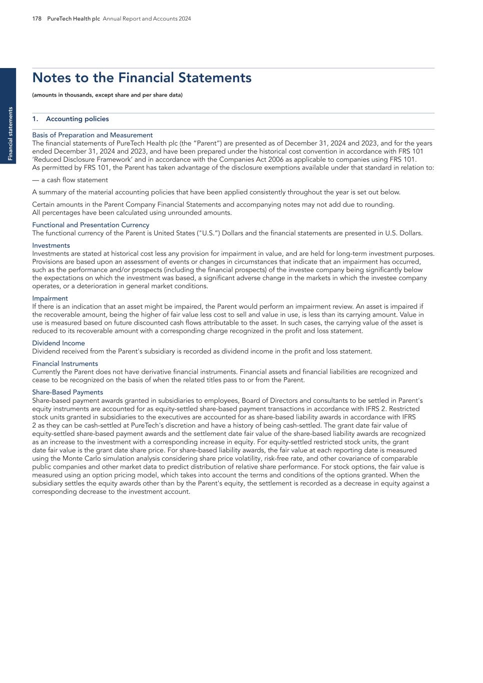 Fi na nc ia l s ta te m en ts 178  PureTech Health plc Annual Report and Accounts 2024 Notes to the Financial Statements (amounts in thousands, except share and per share data) 1. Accounting policies Basis of Preparation and Measurement The financial statements of PureTech Health plc (the “Parent”) are presented as of December 31, 2024 and 2023, and for the years  ended December 31, 2024 and 2023, and have been prepared under the historical cost convention in accordance with FRS 101  ‘Reduced Disclosure Framework’ and in accordance with the Companies Act 2006 as applicable to companies using FRS 101.  As permitted by FRS 101, the Parent has taken advantage of the disclosure exemptions available under that standard in relation to:  — a cash flow statement A summary of the material accounting policies that have been applied consistently throughout the year is set out below. Certain amounts in the Parent Company Financial Statements and accompanying notes may not add due to rounding.  All percentages have been calculated using unrounded amounts.  Functional and Presentation Currency The functional currency of the Parent is United States ("U.S.”) Dollars and the financial statements are presented in U.S. Dollars. Investments Investments are stated at historical cost less any provision for impairment in value, and are held for long-term investment purposes.  Provisions are based upon an assessment of events or changes in circumstances that indicate that an impairment has occurred,  such as the performance and/or prospects (including the financial prospects) of the investee company being significantly below  the expectations on which the investment was based, a significant adverse change in the markets in which the investee company  operates, or a deterioration in general market conditions. Impairment If there is an indication that an asset might be impaired, the Parent would perform an impairment review. An asset is impaired if  the recoverable amount, being the higher of fair value less cost to sell and value in use, is less than its carrying amount. Value in  use is measured based on future discounted cash flows attributable to the asset. In such cases, the carrying value of the asset is  reduced to its recoverable amount with a corresponding charge recognized in the profit and loss statement. Dividend Income Dividend received from the Parent's subsidiary is recorded as dividend income in the profit and loss statement. Financial Instruments Currently the Parent does not have derivative financial instruments. Financial assets and financial liabilities are recognized and  cease to be recognized on the basis of when the related titles pass to or from the Parent. Share-Based Payments Share-based payment awards granted in subsidiaries to employees, Board of Directors and consultants to be settled in Parent's  equity instruments are accounted for as equity-settled share-based payment transactions in accordance with IFRS 2. Restricted  stock units granted in subsidiaries to the executives are accounted for as share-based liability awards in accordance with IFRS  2 as they can be cash-settled at PureTech's discretion and have a history of being cash-settled. The grant date fair value of  equity-settled share-based payment awards and the settlement date fair value of the share-based liability awards are recognized  as an increase to the investment with a corresponding increase in equity. For equity-settled restricted stock units, the grant  date fair value is the grant date share price. For share-based liability awards, the fair value at each reporting date is measured  using the Monte Carlo simulation analysis considering share price volatility, risk-free rate, and other covariance of comparable  public companies and other market data to predict distribution of relative share performance. For stock options, the fair value is  measured using an option pricing model, which takes into account the terms and conditions of the options granted. When the  subsidiary settles the equity awards other than by the Parent's equity, the settlement is recorded as a decrease in equity against a  corresponding decrease to the investment account.