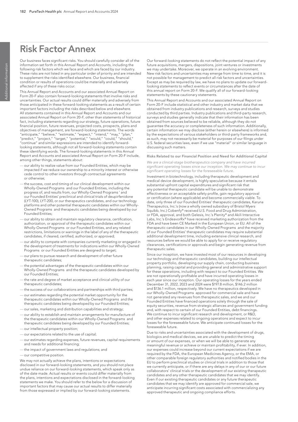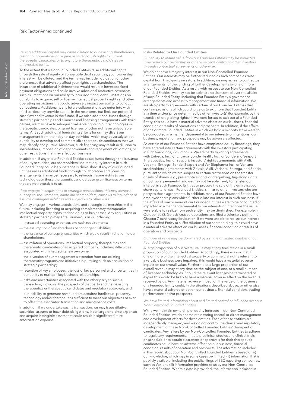 184  PureTech Health plc Annual Report and Accounts 2024 Risk Factor Annex continued A d d it io na l i nf o rm at io n Risks Related to Our Founded Entities Our ability to realize value from our Founded Entities may be impacted  if we reduce our ownership or otherwise cede control to other investors  through contractual agreements or otherwise. We do not have a majority interest in our Non-Controlled Founded  Entities. Our interests may be further reduced as such companies raise  capital from third-party investors. In addition, we may agree to contractual  arrangements for the funding of further developments by one or more  of our Founded Entities. As a result, with respect to our Non-Controlled  Founded Entities, we may not be able to exercise control over the affairs  of such Founded Entity, including that Founded Entity’s governance  arrangements and access to management and financial information. We  are also party to agreements with certain of our Founded Entities that  contain provisions which could force us to exit from that Founded Entity  at a time and/or price determined by other investor(s) (for example, by the  exercise of drag-along rights). If we were forced to exit out of a Founded  Entity, this could have a material adverse effect on our business, financial  condition or results of operations and prospects. In addition, if the affairs  of one or more Founded Entities in which we hold a minority stake were to  be conducted in a manner detrimental to our interests or intentions, our  business, reputation and prospects may be adversely affected. As certain of our Founded Entities have completed equity financings, they  have entered into certain agreements with the investors participating  in such financings, including us. We are party to voting agreements  with Entrega, Inc., or Entrega  Sonde Health, Inc., or Sonde and Seaport  Therapeutics, Inc. or Seaport; investors’ rights agreements with Akili,  Vedanta, Entrega, Sonde, Seaport and Vor Biopharma Inc., or Vor, and  stockholders’ agreements with Gelesis, Akili, Vedanta, Entrega, and Sonde,  pursuant to which we are subject to certain restrictions on the transfer  or sale of shares (e.g., pre-emptive rights or drag-along, tag-along rights  or lock up agreements), and we may not be able freely to transfer our  interest in such Founded Entities or procure the sale of the entire issued  share capital of such Founded Entities, similar to other investors who are  party to these agreements. In addition, many of our Founded Entities have  employee share plans which further dilute our interest in such business. If  the affairs of one or more of our Founded Entities were to be conducted or  impacted in a manner detrimental to our interests or intentions the value  we are able to realize from such entity may be diminished. For example, in  October 2023, Gelesis ceased operations and filed a voluntary petition for  Chapter 7 bankruptcy liquidation. If we were unable to realize our interest  in a Founded Entity or suffer dilution of our shareholding, this could have  a material adverse effect on our business, financial condition or results of  operation and prospects. Our overall value may be dominated by a single or limited number of our  Founded Entities. A large proportion of our overall value may at any time reside in a small  proportion of our Founded Entities. Accordingly, there is a risk that if  one or more of the intellectual property or commercial rights relevant to  a valuable business were impaired, this would have a material adverse  impact on our overall value. Furthermore, a large proportion of our  overall revenue may at any time be the subject of one, or a small number  of, licensed technologies. Should the relevant licenses be terminated or  expire this would be likely to have a material adverse effect on the revenue  received by us. Any material adverse impact on the value of the business  of a Founded Entity could, in the situations described above, or otherwise,  have a material adverse effect on our business, financial condition, trading  performance and/or prospects. We have limited information about and limited control or influence over our  Non-Controlled Founded Entities. While we maintain ownership of equity interests in our Non-Controlled  Founded Entities, we do not maintain voting control or direct management  and development efforts for these entities. Each of these entities are  independently managed, and we do not control the clinical and regulatory  development of these Non-Controlled Founded Entities’ therapeutic  candidates. Any failure by our Non-Controlled Founded Entities to adhere  to regulatory requirements, initiate preclinical studies and clinical trials  on schedule or to obtain clearances or approvals for their therapeutic  candidates could have an adverse effect on our business, financial  condition, results of operation and prospects. The information included  in this report about our Non-Controlled Founded Entities is based on (i)  our knowledge, which may in some cases be limited, (ii) information that is  publicly available, including the public filings of SEC reporting companies,  such as Vor, and (iii) information provided to us by our Non-Controlled  Founded Entities. Where a date is provided, the information included in  Raising additional capital may cause dilution to our existing shareholders,  restrict our operations or require us to relinquish rights to current  therapeutic candidates or to any future therapeutic candidates on  unfavorable terms. To the extent that we or our Founded Entities raise additional capital  through the sale of equity or convertible debt securities, your ownership  interest will be diluted, and the terms may include liquidation or other  preferences that adversely affect your rights as a shareholder. The  incurrence of additional indebtedness would result in increased fixed  payment obligations and could involve additional restrictive covenant