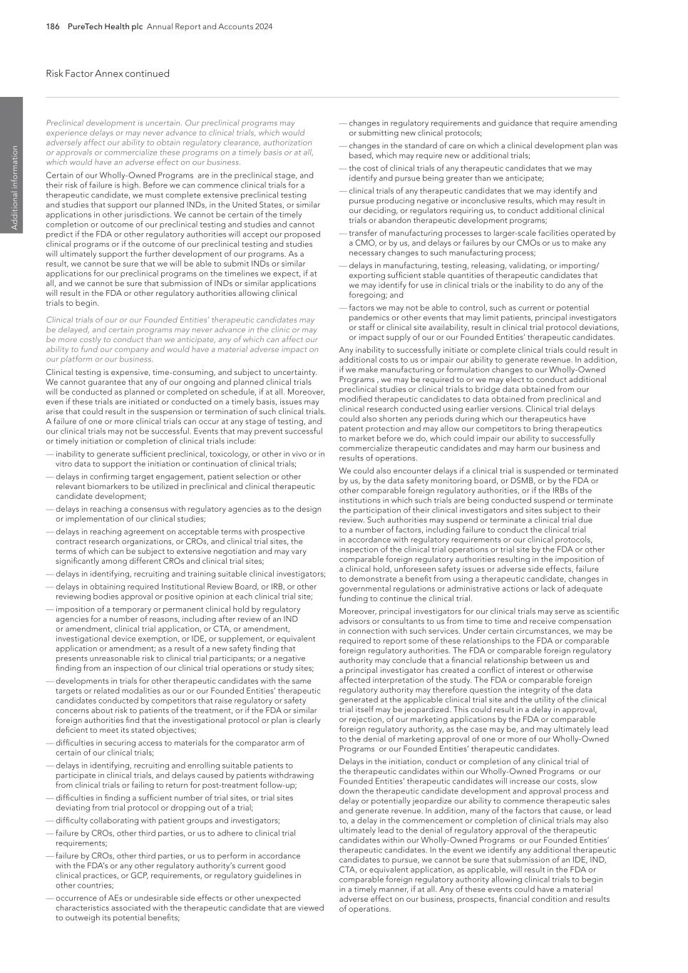 186  PureTech Health plc Annual Report and Accounts 2024 Risk Factor Annex continued A d d it io na l i nf o rm at io n  — changes in regulatory requirements and guidance that require amending  or submitting new clinical protocols;  — changes in the standard of care on which a clinical development plan was  based, which may require new or additional trials;  — the cost of clinical trials of any therapeutic candidates that we may  identify and pursue being greater than we anticipate;  — clinical trials of any therapeutic candidates that we may identify and  pursue producing negative or inconclusive results, which may result in  our deciding, or regulators requiring us, to conduct additional clinical  trials or abandon therapeutic development programs;  — transfer of manufacturing processes to larger-scale facilities operated by  a CMO, or by us, and delays or failures by our CMOs or us to make any  necessary changes to such manufacturing process;  — delays in manufacturing, testing, releasing, validating, or importing/ exporting sufficient stable quantities of therapeutic candidates that  we may identify for use in clinical trials or the inability to do any of the  foregoing; and  — factors we may not be able to control, such as current or potential  pandemics or other events that may limit patients, principal investigators  or staff or clinical site availability, result in clinical trial protocol deviations,  or impact supply of our or our Founded Entities’ therapeutic candidates. Any inability to successfully initiate or complete clinical trials could result in  additional costs to us or impair our ability to generate revenue. In addition,  if we make manufacturing or formulation changes to our Wholly-Owned  Programs , we may be required to or we may elect to conduct additional  preclinical studies or clinical trials to bridge data obtained from our  modified therapeutic candidates to data obtained from preclinical and  clinical research conducted using earlier versions. Clinical trial delays  could also shorten any periods during which our therapeutics have  patent protection and may allow our competitors to bring therapeutics  to market before we do, which could impair our ability to successfully  commercialize therapeutic candidates and may harm our business and  results of operations. We could also encounter delays if a clinical trial is suspended or terminated  by us, by the data safety monitoring board, or DSMB, or by the FDA or  other comparable foreign regulatory authorities, or if the IRBs of the  institutions in which such trials are being conducted suspend or terminate  the participation of their clinical investigators and sites subject to their  review. Such authorities may suspend or terminate a clinical trial due  to a number of factors, including failure to conduct the clinical trial  in accordance with regulatory requirements or our clinical protocols,  inspection of the clinical trial operations or trial site by the FDA or other  comparable foreign regulatory authorities resulting in the imposition of  a clinical hold, unforeseen safety issues or adverse side effects, failure  to demonstrate a benefit from using a therapeutic candidate, changes in  governmental regulations or administrative actions or lack of adequate  funding to continue the clinical trial. Moreover, principal investigators for our clinical trials may serve as scientific  advisors or consultants to us from time to time and receive compensation  in connection with such services. Under certain circumstances, we may be  required to report some of these relationships to the FDA or comparable  foreign regulatory authorities. The FDA or comparable foreign regulatory  authority may conclude that a financial relationship between us and  a principal investigator has created a conflict of interest or otherwise  affected interpretation of the study. The FDA or comparable foreign  regulatory authority may therefore question the integrity of the data  generated at the applicable clinical trial site and the utility of the clinical  trial itself may be jeopardized. This could result in a delay in approval,  or rejection, of our marketing applications by the FDA or comparable  foreign regulatory authority, as the case may be, and may ultimately lead  to the denial of marketing approval of one or more of our Wholly-Owned  Programs  or our Founded Entities’ therapeutic candidates. Delays in the initiation, conduct or completion of any clinical trial of  the therapeutic candidates within our Wholly-Owned Programs  or our  Founded Entities’ therapeutic candidates will increase our costs, slow  down the therapeutic candidate development and approval process and  delay or potentially jeopardize our ability to commence therapeutic sales  and generate revenue. In addition, many of the factors that cause, or lead  to, a delay in the commencement or completion of clinical trials may also  ultimately lead to the denial of regulatory approval of the therapeutic  candidates within our Wholly-Owned Programs  or our Founded Entities’  therapeutic candidates. In the event we identify any additional therapeutic  candidates to pursue, we cannot be sure that submission of an IDE, IND,  CTA, or equivalent application, as applicable, will result in the FDA or  comparable foreign regulatory authority allowing clinical trials to begin  in a timely manner, if at all. Any of these events could have a material  adverse effect on our business, prospects, financial condition and results  of operations. Preclinical development is uncertain. Our preclinical programs may  experience delays or may never advance to clinical trials, which would  adversely affect our ability to obtain regulatory clearance, authorization  or approvals or commercialize these programs on a timely basis or at all,  which would have an adverse effect on our business. Certain of our Wholly-Owned Programs  are in the preclinical stage, and  their risk of