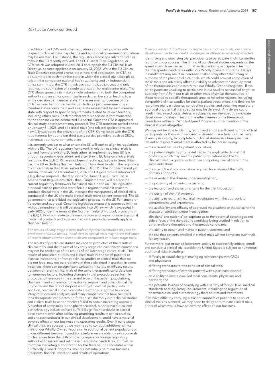 PureTech Health plc Annual Report and Accounts 2024  187  Risk Factor Annex continued A d d itio nal info rm atio n If we encounter difficulties enrolling patients in clinical trials, our clinical  development activities could be delayed or otherwise adversely affected. Identifying and qualifying trial participants to participate in clinical studies  is critical to our success. The timing of our clinical studies depends on the  speed at which we can recruit trial participants to participate in testing  the therapeutic candidates within our Wholly-Owned Programs . Delays  in enrollment may result in increased costs or may affect the timing or  outcome of the planned clinical trials, which could prevent completion of  these trials and adversely affect our ability to advance the development  of the therapeutic candidates within our Wholly-Owned Programs . If trial  participants are unwilling to participate in our studies because of negative  publicity from AEs in our trials or other trials of similar therapeutics, or  those related to specific therapeutic area, or for other reasons, including  competitive clinical studies for similar patient populations, the timeline for  recruiting trial participants, conducting studies, and obtaining regulatory  approval of potential therapeutics may be delayed.. Any delays could  result in increased costs, delays in advancing our therapeutic candidate  development, delays in testing the effectiveness of the therapeutic  candidates within our Wholly-Owned Programs , or termination of the  clinical studies altogether. We may not be able to identify, recruit and enroll a sufficient number of trial  participants, or those with required or desired characteristics to achieve  diversity in a study, to complete our clinical studies in a timely manner.  Patient and subject enrollment is affected by factors including:  — the size and nature of a patient population;  — the patient eligibility criteria defined in the applicable clinical trial  protocols, which may limit the patient populations eligible for  clinical trials to a greater extent than competing clinical trials for the  same indication;  — the size of the study population required for analysis of the trial’s  primary endpoints;  — the severity of the disease under investigation;  — the proximity of patients to a trial site;  — the inclusion and exclusion criteria for the trial in question;  — the design of the trial protocol;  — the ability to recruit clinical trial investigators with the appropriate  competencies and experience;  — the availability and efficacy of approved medications or therapies for the  disease or condition under investigation;  — clinicians’ and patients’ perceptions as to the potential advantages and  side effects of the therapeutic candidate being studied in relation to  other available therapies and therapeutic candidates;  — the ability to obtain and maintain patient consents; and  — the risk that patients enrolled in clinical trials will not complete such trials,  for any reason. Furthermore, our or our collaborators’ ability to successfully initiate, enroll  and conduct a clinical trial outside the United States is subject to numerous  additional risks, including:  — difficulty in establishing or managing relationships with CROs  and physicians;  — differing standards for the conduct of clinical trials;  — differing standards of care for patients with a particular disease;  — an inability to locate qualified local consultants, physicians and  partners; and  — the potential burden of complying with a variety of foreign laws, medical  standards and regulatory requirements, including the regulation of  pharmaceutical and biotechnology therapeutics and treatments. If we have difficulty enrolling sufficient numbers of patients to conduct  clinical trials as planned, we may need to delay or terminate clinical trials,  either of which would have an adverse effect on our business. In addition, the FDA’s and other regulatory authorities’ policies with  respect to clinical trials may change and additional government regulations  may be enacted. For instance, the regulatory landscape related to clinical  trials in the EU recently evolved. The EU Clinical Trials Regulation, or  CTR, which was adopted in April 2014 and repeals the EU Clinical Trials  Directive, became applicable on January 31, 2022. While the EU Clinical  Trials Directive required a separate clinical trial application, or CTA, to  be submitted in each member state in which the clinical trial takes place,  to both the competent national health authority and an independent  ethics committee, the CTR introduces a centralized process and only  requires the submission of a single application for multicenter trials. The  CTR allows sponsors to make a single submission to both the competent  authority and an ethics committee in each member state, leading to a  single decision per member state. The assessment procedure of the  CTA has been harmonized as well, including a joint assessment by all  member states concerned, and a separate assessment by each member  state with respect to specific requirements related to its own territory,  including ethics rules. Each member state’s decision is communicated  to the sponsor via the centralized EU portal. Once the CTA is approved,  clinical study development may proceed. The CTR transition period ended  on January 31, 2025, and all clinical trials (and related applications) are  now fully subject to the provisions of the CTR. Compliance with the CTR  requirements by us and our third-party service providers, such as CROs,  may impact our developments plans.  It is currently unclear to what extent the UK will seek to align its regulations  with the EU. The UK regulatory framework in relation to clinical trials is  derived from pre-existing EU legislation (as implemented into UK law,  through secondary legislation), and after Brexit, EU laws o
