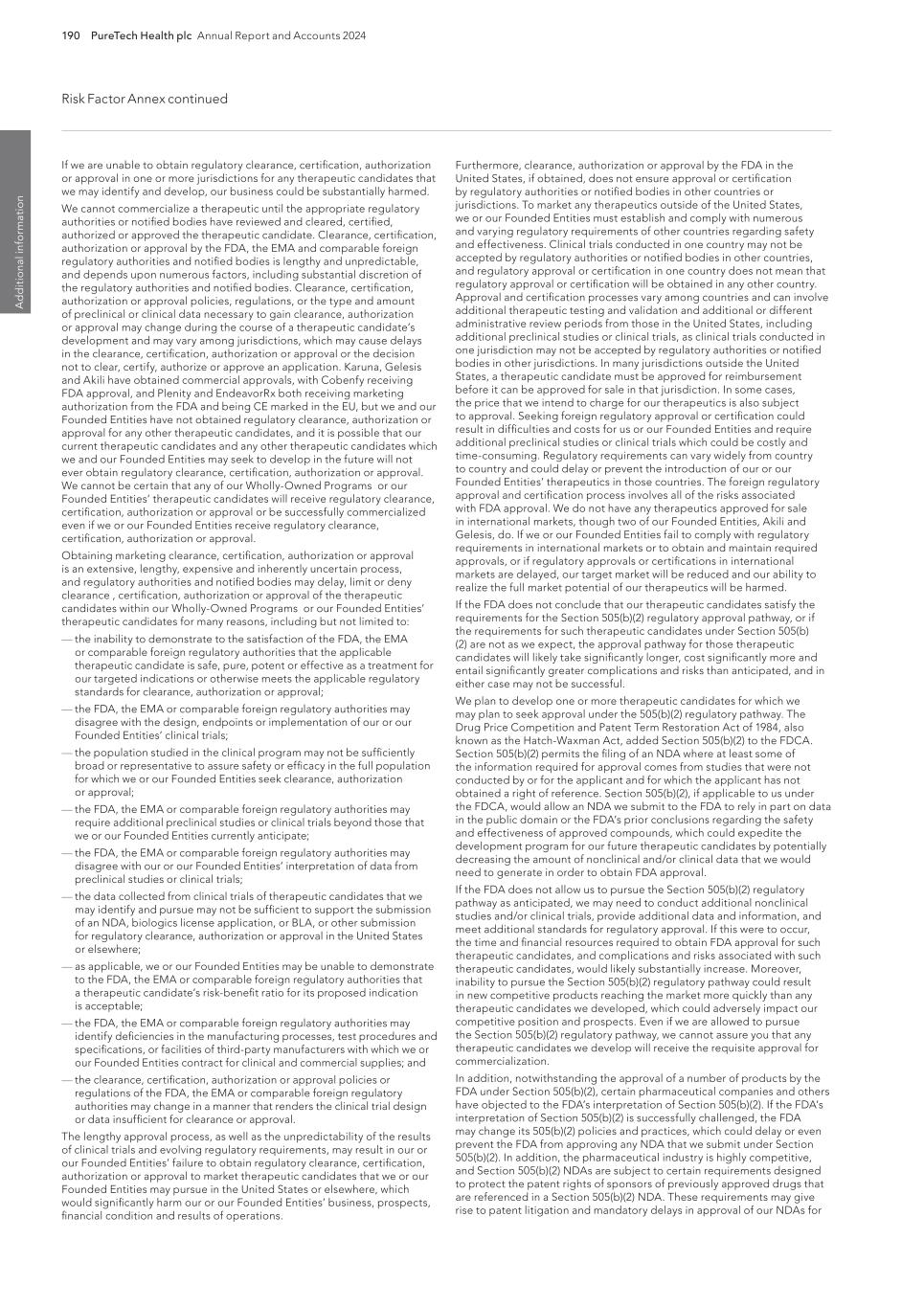 190  PureTech Health plc Annual Report and Accounts 2024 Risk Factor Annex continued A d d it io na l i nf o rm at io n Furthermore, clearance, authorization or approval by the FDA in the  United States, if obtained, does not ensure approval or certification  by regulatory authorities or notified bodies in other countries or  jurisdictions. To market any therapeutics outside of the United States,  we or our Founded Entities must establish and comply with numerous  and varying regulatory requirements of other countries regarding safety  and effectiveness. Clinical trials conducted in one country may not be  accepted by regulatory authorities or notified bodies in other countries,  and regulatory approval or certification in one country does not mean that  regulatory approval or certification will be obtained in any other country.  Approval and certification processes vary among countries and can involve  additional therapeutic testing and validation and additional or different  administrative review periods from those in the United States, including  additional preclinical studies or clinical trials, as clinical trials conducted in  one jurisdiction may not be accepted by regulatory authorities or notified  bodies in other jurisdictions. In many jurisdictions outside the United  States, a therapeutic candidate must be approved for reimbursement  before it can be approved for sale in that jurisdiction. In some cases,  the price that we intend to charge for our therapeutics is also subject  to approval. Seeking foreign regulatory approval or certification could  result in difficulties and costs for us or our Founded Entities and require  additional preclinical studies or clinical trials which could be costly and  time-consuming. Regulatory requirements can vary widely from country  to country and could delay or prevent the introduction of our or our  Founded Entities’ therapeutics in those countries. The foreign regulatory  approval and certification process involves all of the risks associated  with FDA approval. We do not have any therapeutics approved for sale  in international markets, though two of our Founded Entities, Akili and  Gelesis, do. If we or our Founded Entities fail to comply with regulatory  requirements in international markets or to obtain and maintain required  approvals, or if regulatory approvals or certifications in international  markets are delayed, our target market will be reduced and our ability to  realize the full market potential of our therapeutics will be harmed. If the FDA does not conclude that our therapeutic candidates satisfy the  requirements for the Section 505(b)(2) regulatory approval pathway, or if  the requirements for such therapeutic candidates under Section 505(b) (2) are not as we expect, the approval pathway for those therapeutic  candidates will likely take significantly longer, cost significantly more and  entail significantly greater complications and risks than anticipated, and in  either case may not be successful. We plan to develop one or more therapeutic candidates for which we  may plan to seek approval under the 505(b)(2) regulatory pathway. The  Drug Price Competition and Patent Term Restoration Act of 1984, also  known as the Hatch-Waxman Act, added Section 505(b)(2) to the FDCA.  Section 505(b)(2) permits the filing of an NDA where at least some of  the information required for approval comes from studies that were not  conducted by or for the applicant and for which the applicant has not  obtained a right of reference. Section 505(b)(2), if applicable to us under  the FDCA, would allow an NDA we submit to the FDA to rely in part on data  in the public domain or the FDA’s prior conclusions regarding the safety  and effectiveness of approved compounds, which could expedite the  development program for our future therapeutic candidates by potentially  decreasing the amount of nonclinical and/or clinical data that we would  need to generate in order to obtain FDA approval.  If the FDA does not allow us to pursue the Section 505(b)(2) regulatory  pathway as anticipated, we may need to conduct additional nonclinical  studies and/or clinical trials, provide additional data and information, and  meet additional standards for regulatory approval. If this were to occur,  the time and financial resources required to obtain FDA approval for such  therapeutic candidates, and complications and risks associated with such  therapeutic candidates, would likely substantially increase. Moreover,  inability to pursue the Section 505(b)(2) regulatory pathway could result  in new competitive products reaching the market more quickly than any  therapeutic candidates we developed, which could adversely impact our  competitive position and prospects. Even if we are allowed to pursue  the Section 505(b)(2) regulatory pathway, we cannot assure you that any  therapeutic candidates we develop will receive the requisite approval for  commercialization. In addition, notwithstanding the approval of a number of products by the  FDA under Section 505(b)(2), certain pharmaceutical companies and others  have objected to the FDA’s interpretation of Section 505(b)(2). If the FDA’s  interpretation of Section 505(b)(2) is successfully challenged, the FDA  may change its 505(b)(2) policies and practices, which could delay or even  prevent the FDA from approving any NDA that we submit under Section  505(b)(2). In addition, the pharmaceutical industry is highly competitive,  and Section 505(b)(2) NDAs are subject to certain requirements designed  to protect the patent rights of sponsors of previously approved drugs that  are referenced in a Section 505(b)(2) NDA. These requirements may give  rise to patent litigation and mandatory delays in approval of our NDAs for  If we are unable to obtain regulatory clearance, certification, authorization  or approval in one or more jurisdictions for any therapeutic candidates that  we may identify and develop, our business 