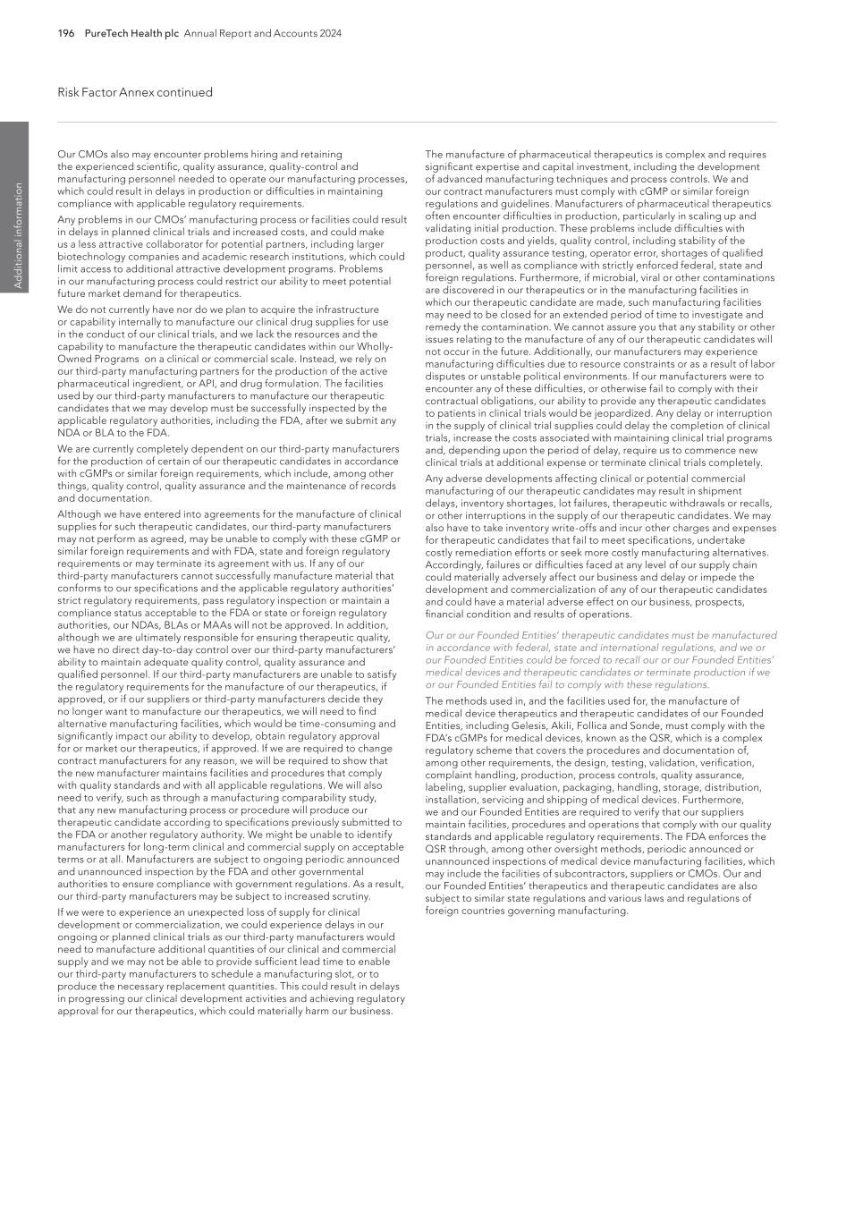 196  PureTech Health plc Annual Report and Accounts 2024 Risk Factor Annex continued A d d it io na l i nf o rm at io n The manufacture of pharmaceutical therapeutics is complex and requires  significant expertise and capital investment, including the development  of advanced manufacturing techniques and process controls. We and  our contract manufacturers must comply with cGMP or similar foreign  regulations and guidelines. Manufacturers of pharmaceutical therapeutics  often encounter difficulties in production, particularly in scaling up and  validating initial production. These problems include difficulties with  production costs and yields, quality control, including stability of the  product, quality assurance testing, operator error, shortages of qualified  personnel, as well as compliance with strictly enforced federal, state and  foreign regulations. Furthermore, if microbial, viral or other contaminations  are discovered in our therapeutics or in the manufacturing facilities in  which our therapeutic candidate are made, such manufacturing facilities  may need to be closed for an extended period of time to investigate and  remedy the contamination. We cannot assure you that any stability or other  issues relating to the manufacture of any of our therapeutic candidates will  not occur in the future. Additionally, our manufacturers may experience  manufacturing difficulties due to resource constraints or as a result of labor  disputes or unstable political environments. If our manufacturers were to  encounter any of these difficulties, or otherwise fail to comply with their  contractual obligations, our ability to provide any therapeutic candidates  to patients in clinical trials would be jeopardized. Any delay or interruption  in the supply of clinical trial supplies could delay the completion of clinical  trials, increase the costs associated with maintaining clinical trial programs  and, depending upon the period of delay, require us to commence new  clinical trials at additional expense or terminate clinical trials completely. Any adverse developments affecting clinical or potential commercial  manufacturing of our therapeutic candidates may result in shipment  delays, inventory shortages, lot failures, therapeutic withdrawals or recalls,  or other interruptions in the supply of our therapeutic candidates. We may  also have to take inventory write-offs and incur other charges and expenses  for therapeutic candidates that fail to meet specifications, undertake  costly remediation efforts or seek more costly manufacturing alternatives.  Accordingly, failures or difficulties faced at any level of our supply chain  could materially adversely affect our business and delay or impede the  development and commercialization of any of our therapeutic candidates  and could have a material adverse effect on our business, prospects,  financial condition and results of operations. Our or our Founded Entities’ therapeutic candidates must be manufactured  in accordance with federal, state and international regulations, and we or  our Founded Entities could be forced to recall our or our Founded Entities’  medical devices and therapeutic candidates or terminate production if we  or our Founded Entities fail to comply with these regulations. The methods used in, and the facilities used for, the manufacture of  medical device therapeutics and therapeutic candidates of our Founded  Entities, including Gelesis, Akili, Follica and Sonde, must comply with the  FDA’s cGMPs for medical devices, known as the QSR, which is a complex  regulatory scheme that covers the procedures and documentation of,  among other requirements, the design, testing, validation, verification,  complaint handling, production, process controls, quality assurance,  labeling, supplier evaluation, packaging, handling, storage, distribution,  installation, servicing and shipping of medical devices. Furthermore,  we and our Founded Entities are required to verify that our suppliers  maintain facilities, procedures and operations that comply with our quality  standards and applicable regulatory requirements. The FDA enforces the  QSR through, among other oversight methods, periodic announced or  unannounced inspections of medical device manufacturing facilities, which  may include the facilities of subcontractors, suppliers or CMOs. Our and  our Founded Entities’ therapeutics and therapeutic candidates are also  subject to similar state regulations and various laws and regulations of  foreign countries governing manufacturing. Our CMOs also may encounter problems hiring and retaining  the experienced scientific, quality assurance, quality-control and  manufacturing personnel needed to operate our manufacturing processes,  which could result in delays in production or difficulties in maintaining  compliance with applicable regulatory requirements. Any problems in our CMOs’ manufacturing process or facilities could result  in delays in planned clinical trials and increased costs, and could make  us a less attractive collaborator for potential partners, including larger  biotechnology companies and academic research institutions, which could  limit access to additional attractive development programs. Problems  in our manufacturing process could restrict our ability to meet potential  future market demand for therapeutics. We do not currently have nor do we plan to acquire the infrastructure  or capability internally to manufacture our clinical drug supplies for use  in the conduct of our clinical trials, and we lack the resources and the  capability to manufacture the therapeutic candidates within our Wholly- Owned Programs  on a clinical or commercial scale. Instead, we rely on  our third-party manufacturing partners for the production of the active  pharmaceutical ingredient, or API, and drug formulation. The facilities  used by our third-party manufacturers to manufacture our therapeutic  candidates that we may develop mu
