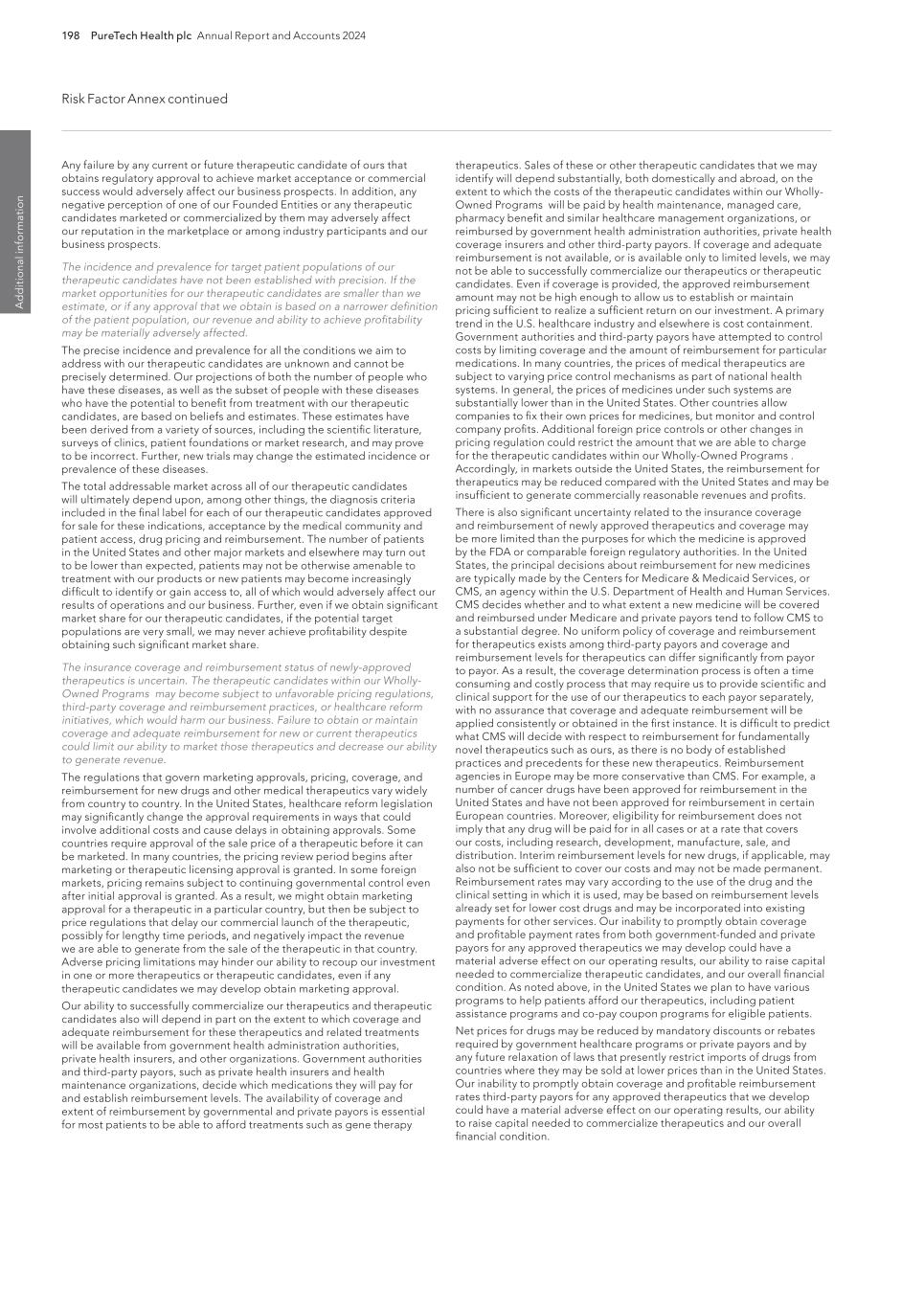 198  PureTech Health plc Annual Report and Accounts 2024 Risk Factor Annex continued A d d it io na l i nf o rm at io n therapeutics. Sales of these or other therapeutic candidates that we may  identify will depend substantially, both domestically and abroad, on the  extent to which the costs of the therapeutic candidates within our Wholly- Owned Programs  will be paid by health maintenance, managed care,  pharmacy benefit and similar healthcare management organizations, or  reimbursed by government health administration authorities, private health  coverage insurers and other third-party payors. If coverage and adequate  reimbursement is not available, or is available only to limited levels, we may  not be able to successfully commercialize our therapeutics or therapeutic  candidates. Even if coverage is provided, the approved reimbursement  amount may not be high enough to allow us to establish or maintain  pricing sufficient to realize a sufficient return on our investment. A primary  trend in the U.S. healthcare industry and elsewhere is cost containment.  Government authorities and third-party payors have attempted to control  costs by limiting coverage and the amount of reimbursement for particular  medications. In many countries, the prices of medical therapeutics are  subject to varying price control mechanisms as part of national health  systems. In general, the prices of medicines under such systems are  substantially lower than in the United States. Other countries allow  companies to fix their own prices for medicines, but monitor and control  company profits. Additional foreign price controls or other changes in  pricing regulation could restrict the amount that we are able to charge  for the therapeutic candidates within our Wholly-Owned Programs .  Accordingly, in markets outside the United States, the reimbursement for  therapeutics may be reduced compared with the United States and may be  insufficient to generate commercially reasonable revenues and profits. There is also significant uncertainty related to the insurance coverage  and reimbursement of newly approved therapeutics and coverage may  be more limited than the purposes for which the medicine is approved  by the FDA or comparable foreign regulatory authorities. In the United  States, the principal decisions about reimbursement for new medicines  are typically made by the Centers for Medicare & Medicaid Services, or  CMS, an agency within the U.S. Department of Health and Human Services.  CMS decides whether and to what extent a new medicine will be covered  and reimbursed under Medicare and private payors tend to follow CMS to  a substantial degree. No uniform policy of coverage and reimbursement  for therapeutics exists among third-party payors and coverage and  reimbursement levels for therapeutics can differ significantly from payor  to payor. As a result, the coverage determination process is often a time  consuming and costly process that may require us to provide scientific and  clinical support for the use of our therapeutics to each payor separately,  with no assurance that coverage and adequate reimbursement will be  applied consistently or obtained in the first instance. It is difficult to predict  what CMS will decide with respect to reimbursement for fundamentally  novel therapeutics such as ours, as there is no body of established  practices and precedents for these new therapeutics. Reimbursement  agencies in Europe may be more conservative than CMS. For example, a  number of cancer drugs have been approved for reimbursement in the  United States and have not been approved for reimbursement in certain  European countries. Moreover, eligibility for reimbursement does not  imply that any drug will be paid for in all cases or at a rate that covers  our costs, including research, development, manufacture, sale, and  distribution. Interim reimbursement levels for new drugs, if applicable, may  also not be sufficient to cover our costs and may not be made permanent.  Reimbursement rates may vary according to the use of the drug and the  clinical setting in which it is used, may be based on reimbursement levels  already set for lower cost drugs and may be incorporated into existing  payments for other services. Our inability to promptly obtain coverage  and profitable payment rates from both government-funded and private  payors for any approved therapeutics we may develop could have a  material adverse effect on our operating results, our ability to raise capital  needed to commercialize therapeutic candidates, and our overall financial  condition. As noted above, in the United States we plan to have various  programs to help patients afford our therapeutics, including patient  assistance programs and co-pay coupon programs for eligible patients. Net prices for drugs may be reduced by mandatory discounts or rebates  required by government healthcare programs or private payors and by  any future relaxation of laws that presently restrict imports of drugs from  countries where they may be sold at lower prices than in the United States.  Our inability to promptly obtain coverage and profitable reimbursement  rates third-party payors for any approved therapeutics that we develop  could have a material adverse effect on our operating results, our ability  to raise capital needed to commercialize therapeutics and our overall  financial condition. Any failure by any current or future therapeutic candidate of ours that  obtains regulatory approval to achieve market acceptance or commercial  success would adversely affect our business prospects. In addition, any  negative perception of one of our Founded Entities or any therapeutic  candidates marketed or commercialized by them may adversely affect  our reputation in the marketplace or among industry participants and our  business prospects. The incidence and prevalence for target patient populations of our  therapeutic candidates have not been established with 