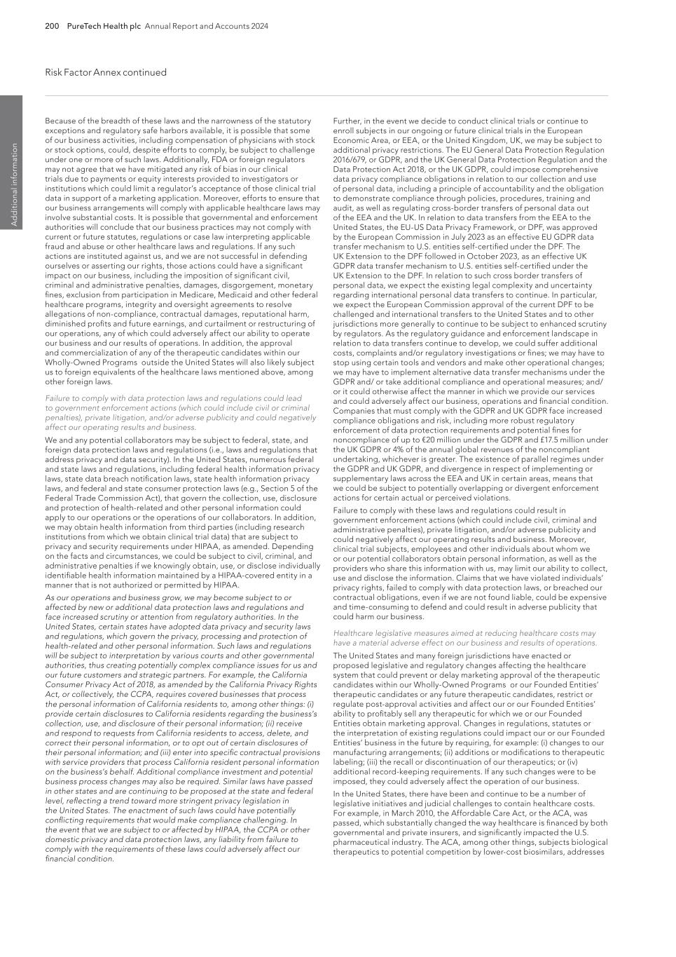200  PureTech Health plc Annual Report and Accounts 2024 Risk Factor Annex continued A d d it io na l i nf o rm at io n Further, in the event we decide to conduct clinical trials or continue to  enroll subjects in our ongoing or future clinical trials in the European  Economic Area, or EEA, or the United Kingdom, UK, we may be subject to  additional privacy restrictions. The EU General Data Protection Regulation  2016/679, or GDPR, and the UK General Data Protection Regulation and the  Data Protection Act 2018, or the UK GDPR, could impose comprehensive  data privacy compliance obligations in relation to our collection and use  of personal data, including a principle of accountability and the obligation  to demonstrate compliance through policies, procedures, training and  audit, as well as regulating cross-border transfers of personal data out  of the EEA and the UK. In relation to data transfers from the EEA to the  United States, the EU-US Data Privacy Framework, or DPF, was approved  by the European Commission in July 2023 as an effective EU GDPR data  transfer mechanism to U.S. entities self-certified under the DPF. The  UK Extension to the DPF followed in October 2023, as an effective UK  GDPR data transfer mechanism to U.S. entities self-certified under the  UK Extension to the DPF. In relation to such cross border transfers of  personal data, we expect the existing legal complexity and uncertainty  regarding international personal data transfers to continue. In particular,  we expect the European Commission approval of the current DPF to be  challenged and international transfers to the United States and to other  jurisdictions more generally to continue to be subject to enhanced scrutiny  by regulators. As the regulatory guidance and enforcement landscape in  relation to data transfers continue to develop, we could suffer additional  costs, complaints and/or regulatory investigations or fines; we may have to  stop using certain tools and vendors and make other operational changes;  we may have to implement alternative data transfer mechanisms under the  GDPR and/ or take additional compliance and operational measures; and/ or it could otherwise affect the manner in which we provide our services  and could adversely affect our business, operations and financial condition.  Companies that must comply with the GDPR and UK GDPR face increased  compliance obligations and risk, including more robust regulatory  enforcement of data protection requirements and potential fines for  noncompliance of up to €20 million under the GDPR and £17.5 million under  the UK GDPR or 4% of the annual global revenues of the noncompliant  undertaking, whichever is greater. The existence of parallel regimes under  the GDPR and UK GDPR, and divergence in respect of implementing or  supplementary laws across the EEA and UK in certain areas, means that  we could be subject to potentially overlapping or divergent enforcement  actions for certain actual or perceived violations.  Failure to comply with these laws and regulations could result in  government enforcement actions (which could include civil, criminal and  administrative penalties), private litigation, and/or adverse publicity and  could negatively affect our operating results and business. Moreover,  clinical trial subjects, employees and other individuals about whom we  or our potential collaborators obtain personal information, as well as the  providers who share this information with us, may limit our ability to collect,  use and disclose the information. Claims that we have violated individuals’  privacy rights, failed to comply with data protection laws, or breached our  contractual obligations, even if we are not found liable, could be expensive  and time-consuming to defend and could result in adverse publicity that  could harm our business. Healthcare legislative measures aimed at reducing healthcare costs may  have a material adverse effect on our business and results of operations. The United States and many foreign jurisdictions have enacted or  proposed legislative and regulatory changes affecting the healthcare  system that could prevent or delay marketing approval of the therapeutic  candidates within our Wholly-Owned Programs  or our Founded Entities’  therapeutic candidates or any future therapeutic candidates, restrict or  regulate post-approval activities and affect our or our Founded Entities’  ability to profitably sell any therapeutic for which we or our Founded  Entities obtain marketing approval. Changes in regulations, statutes or  the interpretation of existing regulations could impact our or our Founded  Entities’ business in the future by requiring, for example: (i) changes to our  manufacturing arrangements; (ii) additions or modifications to therapeutic  labeling; (iii) the recall or discontinuation of our therapeutics; or (iv)  additional record-keeping requirements. If any such changes were to be  imposed, they could adversely affect the operation of our business. In the United States, there have been and continue to be a number of  legislative initiatives and judicial challenges to contain healthcare costs.  For example, in March 2010, the Affordable Care Act, or the ACA, was  passed, which substantially changed the way healthcare is financed by both  governmental and private insurers, and significantly impacted the U.S.  pharmaceutical industry. The ACA, among other things, subjects biological  therapeutics to potential competition by lower-cost biosimilars, addresses  Because of the breadth of these laws and the narrowness of the statutory  exceptions and regulatory safe harbors available, it is possible that some  of our business activities, including compensation of physicians with stock  or stock options, could, despite efforts to comply, be subject to challenge  under one or more of such laws. Additionally, FDA or foreign regulators  may not agree that we have mitigated any risk of bias in our clinic
