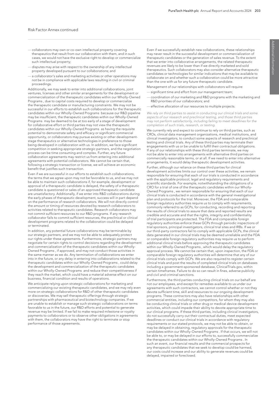 PureTech Health plc Annual Report and Accounts 2024  203  Risk Factor Annex continued A d d itio nal info rm atio n Even if we successfully establish new collaborations, these relationships  may never result in the successful development or commercialization of  therapeutic candidates or the generation of sales revenue. To the extent  that we enter into collaborative arrangements, the related therapeutic  revenues are likely to be lower than if we directly marketed and sold  therapeutics. Such collaborators may also consider alternative therapeutic  candidates or technologies for similar indications that may be available to  collaborate on and whether such a collaboration could be more attractive  than the one with us for any future therapeutic candidate. Management of our relationships with collaborators will require:  — significant time and effort from our management team;  — coordination of our marketing and R&D programs with the marketing and  R&D priorities of our collaborators; and  — effective allocation of our resources to multiple projects. We rely on third parties to assist in conducting our clinical trials and some  aspects of our research and preclinical testing, and those third parties  may not perform satisfactorily, including failing to meet deadlines for the  completion of such trials, research, or testing. We currently rely and expect to continue to rely on third parties, such as  CROs, clinical data management organizations, medical institutions, and  clinical investigators, to conduct some aspects of research and preclinical  testing and clinical trials. Any of these third parties may terminate their  engagements with us or be unable to fulfill their contractual obligations.  If any of our relationships with these third parties terminate, we may  not be able to enter into arrangements with alternative third parties on  commercially reasonable terms, or at all. If we need to enter into alternative  arrangements, it would delay therapeutic development activities. Further, although our reliance on these third parties for clinical  development activities limits our control over these activities, we remain  responsible for ensuring that each of our trials is conducted in accordance  with the applicable protocol, legal and regulatory requirements and  scientific standards. For example, notwithstanding the obligations of a  CRO for a trial of one of the therapeutic candidates within our Wholly- Owned Programs , we remain responsible for ensuring that each of our  clinical trials is conducted in accordance with the general investigational  plan and protocols for the trial. Moreover, the FDA and comparable  foreign regulatory authorities require us to comply with requirements,  commonly referred to as GCPs, for conducting, recording and reporting  the results of clinical trials to assure that data and reported results are  credible and accurate and that the rights, integrity and confidentiality  of trial participants are protected. The FDA and comparable foreign  regulatory authorities enforce these GCPs through periodic inspections of  trial sponsors, principal investigators, clinical trial sites and IRBs. If we or  our third-party contractors fail to comply with applicable GCPs, the clinical  data generated in our clinical trials may be deemed unreliable and the FDA  or comparable foreign regulatory authorities may require us to perform  additional clinical trials before approving the therapeutic candidates  within our Wholly-Owned Programs , which would delay the regulatory  approval process. We cannot be certain that, upon inspection, the FDA or  comparable foreign regulatory authorities will determine that any of our  clinical trials comply with GCPs. We are also required to register certain  clinical trials and post the results of completed clinical trials on databases  including a government-sponsored database, ClinicalTrials.gov, within  certain timeframes. Failure to do so can result in fines, adverse publicity  and civil and criminal sanctions. Furthermore, the third parties conducting clinical trials on our behalf are  not our employees, and except for remedies available to us under our  agreements with such contractors, we cannot control whether or not they  devote sufficient time, skill and resources to our ongoing development  programs. These contractors may also have relationships with other  commercial entities, including our competitors, for whom they may also  be conducting clinical trials or other drug or medical device development  activities, which could impede their ability to devote appropriate time to  our clinical programs. If these third parties, including clinical investigators,  do not successfully carry out their contractual duties, meet expected  deadlines or conduct our clinical trials in accordance with regulatory  requirements or our stated protocols, we may not be able to obtain, or  may be delayed in obtaining, regulatory approvals for the therapeutic  candidates within our Wholly-Owned Programs . If that occurs, we will not  be able to, or may be delayed in our efforts to, successfully commercialize  the therapeutic candidates within our Wholly-Owned Programs . In  such an event, our financial results and the commercial prospects for  any therapeutic candidates that we seek to develop could be harmed,  our costs could increase and our ability to generate revenues could be  delayed, impaired or foreclosed.  — collaborators may own or co-own intellectual property covering  therapeutics that result from our collaboration with them, and in such  cases, we would not have the exclusive right to develop or commercialize  such intellectual property;  — disputes may arise with respect to the ownership of any intellectual  property developed pursuant to our collaborations; and  — a collaborator’s sales and marketing activities or other operations may  not be in compliance with applicable laws resulting in civil or criminal  proceedings. A