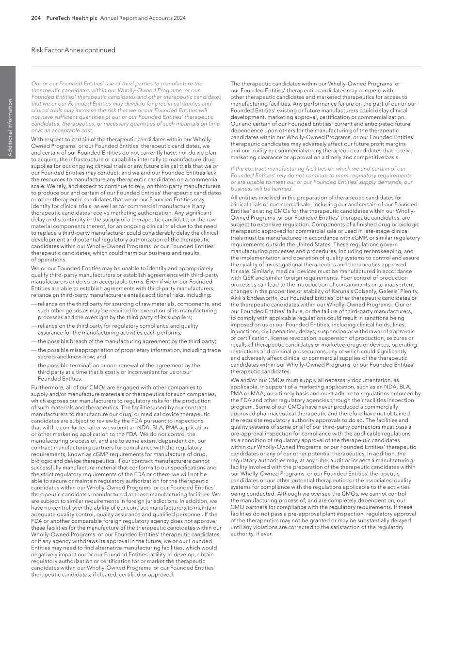 204  PureTech Health plc Annual Report and Accounts 2024 Risk Factor Annex continued A d d it io na l i nf o rm at io n The therapeutic candidates within our Wholly-Owned Programs  or  our Founded Entities’ therapeutic candidates may compete with  other therapeutic candidates and marketed therapeutics for access to  manufacturing facilities. Any performance failure on the part of our or our  Founded Entities’ existing or future manufacturers could delay clinical  development, marketing approval, certification or commercialization.  Our and certain of our Founded Entities’ current and anticipated future  dependence upon others for the manufacturing of the therapeutic  candidates within our Wholly-Owned Programs  or our Founded Entities’  therapeutic candidates may adversely affect our future profit margins  and our ability to commercialize any therapeutic candidates that receive  marketing clearance or approval on a timely and competitive basis. If the contract manufacturing facilities on which we and certain of our  Founded Entities’ rely do not continue to meet regulatory requirements  or are unable to meet our or our Founded Entities’ supply demands, our  business will be harmed. All entities involved in the preparation of therapeutic candidates for  clinical trials or commercial sale, including our and certain of our Founded  Entities’ existing CMOs for the therapeutic candidates within our Wholly- Owned Programs  or our Founded Entities’ therapeutic candidates, are  subject to extensive regulation. Components of a finished drug or biologic  therapeutic approved for commercial sale or used in late-stage clinical  trials must be manufactured in accordance with cGMP, or similar regulatory  requirements outside the United States. These regulations govern  manufacturing processes and procedures, including recordkeeping, and  the implementation and operation of quality systems to control and assure  the quality of investigational therapeutics and therapeutics approved  for sale. Similarly, medical devices must be manufactured in accordance  with QSR and similar foreign requirements. Poor control of production  processes can lead to the introduction of contaminants or to inadvertent  changes in the properties or stability of Karuna’s Cobenfy, Gelesis’ Plenity,  Akili’s EndeavorRx, our Founded Entities’ other therapeutic candidates or  the therapeutic candidates within our Wholly-Owned Programs . Our or  our Founded Entities’ failure, or the failure of third-party manufacturers,  to comply with applicable regulations could result in sanctions being  imposed on us or our Founded Entities, including clinical holds, fines,  injunctions, civil penalties, delays, suspension or withdrawal of approvals  or certification, license revocation, suspension of production, seizures or  recalls of therapeutic candidates or marketed drugs or devices, operating  restrictions and criminal prosecutions, any of which could significantly  and adversely affect clinical or commercial supplies of the therapeutic  candidates within our Wholly-Owned Programs  or our Founded Entities’  therapeutic candidates. We and/or our CMOs must supply all necessary documentation, as  applicable, in support of a marketing application, such as an NDA, BLA,  PMA or MAA, on a timely basis and must adhere to regulations enforced by  the FDA and other regulatory agencies through their facilities inspection  program. Some of our CMOs have never produced a commercially  approved pharmaceutical therapeutic and therefore have not obtained  the requisite regulatory authority approvals to do so. The facilities and  quality systems of some or all of our third-party contractors must pass a  pre-approval inspection for compliance with the applicable regulations  as a condition of regulatory approval of the therapeutic candidates  within our Wholly-Owned Programs  or our Founded Entities’ therapeutic  candidates or any of our other potential therapeutics. In addition, the  regulatory authorities may, at any time, audit or inspect a manufacturing  facility involved with the preparation of the therapeutic candidates within  our Wholly-Owned Programs  or our Founded Entities’ therapeutic  candidates or our other potential therapeutics or the associated quality  systems for compliance with the regulations applicable to the activities  being conducted. Although we oversee the CMOs, we cannot control  the manufacturing process of, and are completely dependent on, our  CMO partners for compliance with the regulatory requirements. If these  facilities do not pass a pre-approval plant inspection, regulatory approval  of the therapeutics may not be granted or may be substantially delayed  until any violations are corrected to the satisfaction of the regulatory  authority, if ever. Our or our Founded Entities’ use of third parties to manufacture the  therapeutic candidates within our Wholly-Owned Programs  or our  Founded Entities’ therapeutic candidates and other therapeutic candidates  that we or our Founded Entities may develop for preclinical studies and  clinical trials may increase the risk that we or our Founded Entities will  not have sufficient quantities of our or our Founded Entities’ therapeutic  candidates, therapeutics, or necessary quantities of such materials on time  or at an acceptable cost. With respect to certain of the therapeutic candidates within our Wholly- Owned Programs  or our Founded Entities’ therapeutic candidates, we  and certain of our Founded Entities do not currently have, nor do we plan  to acquire, the infrastructure or capability internally to manufacture drug  supplies for our ongoing clinical trials or any future clinical trials that we or  our Founded Entities may conduct, and we and our Founded Entities lack  the resources to manufacture any therapeutic candidates on a commercial  scale. We rely, and expect to continue to rely, on third-party manufacturers  to produce our and 