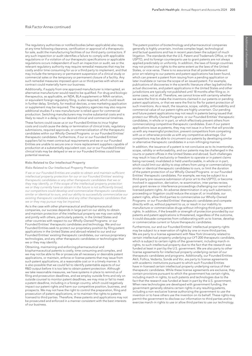 PureTech Health plc Annual Report and Accounts 2024  205  Risk Factor Annex continued A d d itio nal info rm atio n The patent position of biotechnology and pharmaceutical companies  generally is highly uncertain, involves complex legal, technological  and factual questions and has in recent years been the subject of much  litigation. The standards that the U.S. Patent and Trademark Office, or the  USPTO, and its foreign counterparts use to grant patents are not always  applied predictably or uniformly. In addition, the laws of foreign countries  may not protect our rights to the same extent as the laws of the United  States, or vice versa. There is no assurance that all potentially relevant  prior art relating to our patents and patent applications has been found,  which can prevent a patent from issuing from a pending application or  later invalidate or narrow the scope of an issued patent. For example,  publications of discoveries in the scientific literature often lag behind the  actual discoveries, and patent applications in the United States and other  jurisdictions are typically not published until 18 months after filing or, in  some cases, not at all. Therefore, we cannot know with certainty whether  we were the first to make the inventions claimed in our patents or pending  patent applications, or that we were the first to file for patent protection of  such inventions. As a result, the issuance, scope, validity, enforceability and  commercial value of our patent rights are highly uncertain. Our pending  and future patent applications may not result in patents being issued that  protect our Wholly-Owned Programs  or our Founded Entities’ therapeutic  candidates, in whole or in part, or which effectively prevent others from  commercializing competitive therapeutic candidates. Even if our patent  applications issue as patents, they may not issue in a form that will provide  us with any meaningful protection, prevent competitors from competing  with us or otherwise provide us with any competitive advantage. Our  competitors may be able to circumvent our patents by developing similar  or alternative therapeutic candidates in a non-infringing manner. In addition, the issuance of a patent is not conclusive as to its inventorship,  scope, validity or enforceability, and our patents may be challenged in the  courts or patent offices in the United States and abroad. Such challenges  may result in loss of exclusivity or freedom to operate or in patent claims  being narrowed, invalidated or held unenforceable, in whole or in part,  which could limit our ability to stop others from using or commercializing  similar or identical therapeutic candidates to ours, or limit the duration  of the patent protection of our Wholly-Owned Programs  or our Founded  Entities’ therapeutic candidates. For example, we may be subject to a  third-party pre-issuance submission of prior art to the USPTO, or become  involved in opposition, derivation, re-examination, inter partes review,  post-grant review or interference proceedings challenging our owned or  licensed patent rights. An adverse determination in any such submission,  proceeding or litigation could reduce the scope of, or invalidate, our  patent rights, allow third parties to commercialize our Wholly-Owned  Programs  or our Founded Entities’ therapeutic candidates and compete  directly with us, without payment to us, or result in our inability to  manufacture or commercialize drugs without infringing third-party patent  rights. In addition, if the breadth or strength of protection provided by our  patents and patent applications is threatened, regardless of the outcome,  it could dissuade companies from collaborating with us to license, develop  or commercialize current or future therapeutic candidates. Furthermore, our and our Founded Entities’ intellectual property rights  may be subject to a reservation of rights by one or more third parties.  We are party to a license agreement with New York University related to  certain intellectual property underlying our LYT-200 therapeutic candidate,  which is subject to certain rights of the government, including march-in  rights, to such intellectual property due to the fact that the research was  funded at least in part by the U.S. government. We are also party to other  license agreements for intellectual property underlying certain of our  therapeutic candidates and programs. Additionally, our Founded Entities  Akili, Follica, Vedanta, Sonde and Vor, are party to license agreements  with academic institutions pursuant to which such Founded Entities  have in-licensed certain intellectual property underlying various of their  therapeutic candidates. While these license agreements are exclusive, they  contain provisions pursuant to which the government has certain rights,  including march-in rights, to such patents and technologies due to the  fact that the research was funded at least in part by the U.S. government.  When new technologies are developed with government funding, the  government generally obtains certain rights in any resulting patents,  including a non-exclusive license authorizing the government to use the  invention or to have others use the invention on its behalf. These rights may  permit the government to disclose our information to third parties and to  exercise march-in rights to use or allow third parties to use our technology.  The regulatory authorities or notified bodies (when applicable) also may,  at any time following clearance, certification or approval of a therapeutic  for sale, audit the manufacturing facilities of our third-party contractors. If  any such inspection or audit identifies a failure to comply with applicable  regulations or if a violation of our therapeutic specifications or applicable  regulations occurs independent of such an inspection or audit, we or the  relevant regulatory authority may require remedial measures that may be  costly and/or time 